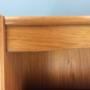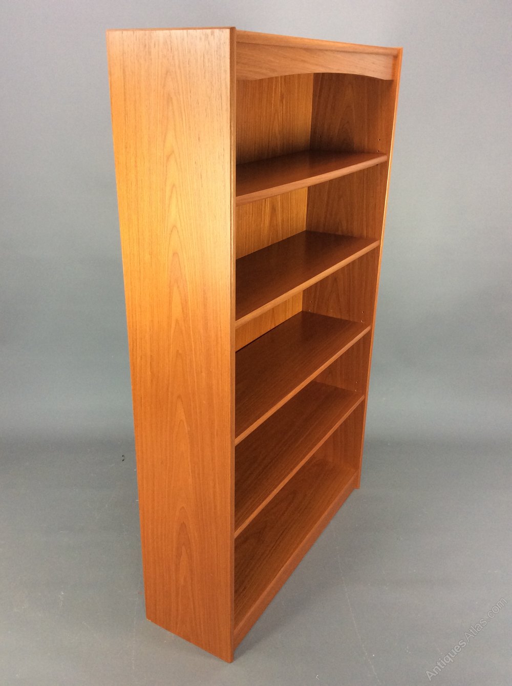 Mid Century teak bookcase having a moulded top, 1 fixed shelf and 3 adjustable shelves with adjustable metal brackets. A functional storage piece of antique furniture with good expressive grain pattern and is in excellent condition, no damage, repairs or sun-bleach. I do have another exactly the same but taller.