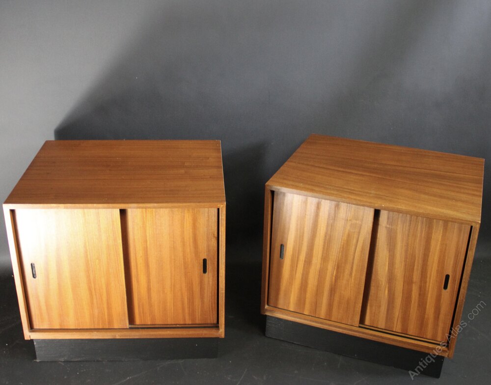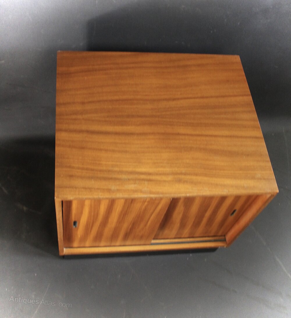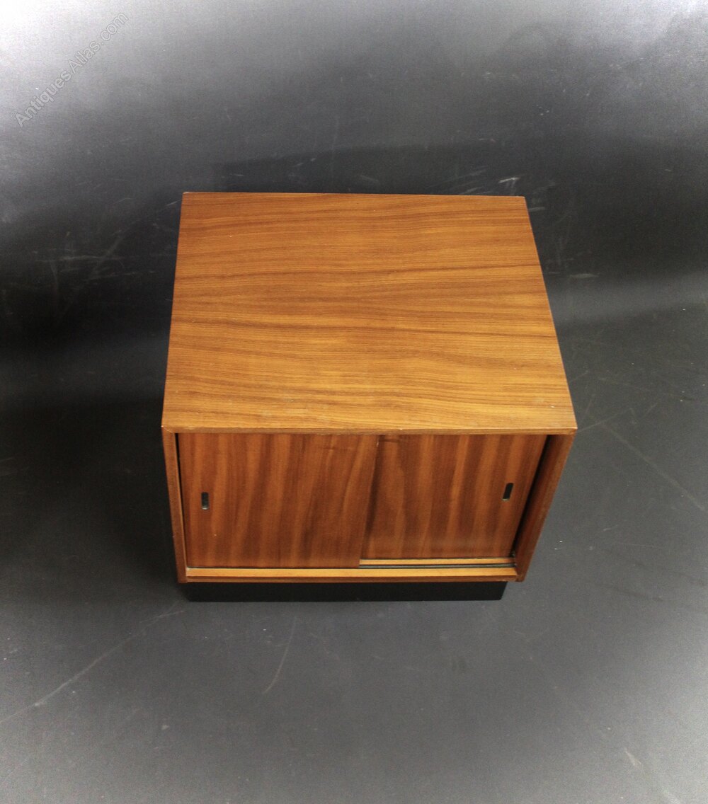 Mid Century Teak Record Housing cabinet with sliding doors on black plinth base. Measures 46 cm high x 50 cm wide x 42 cm deep