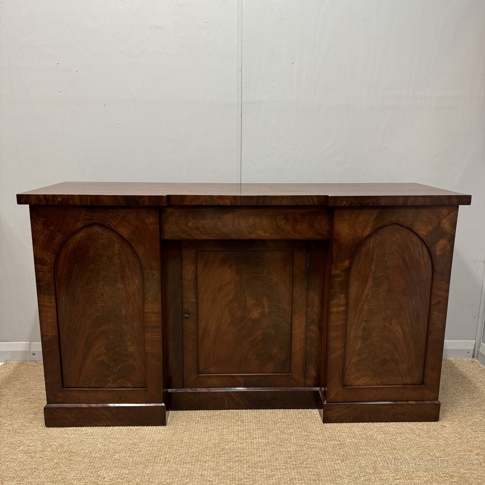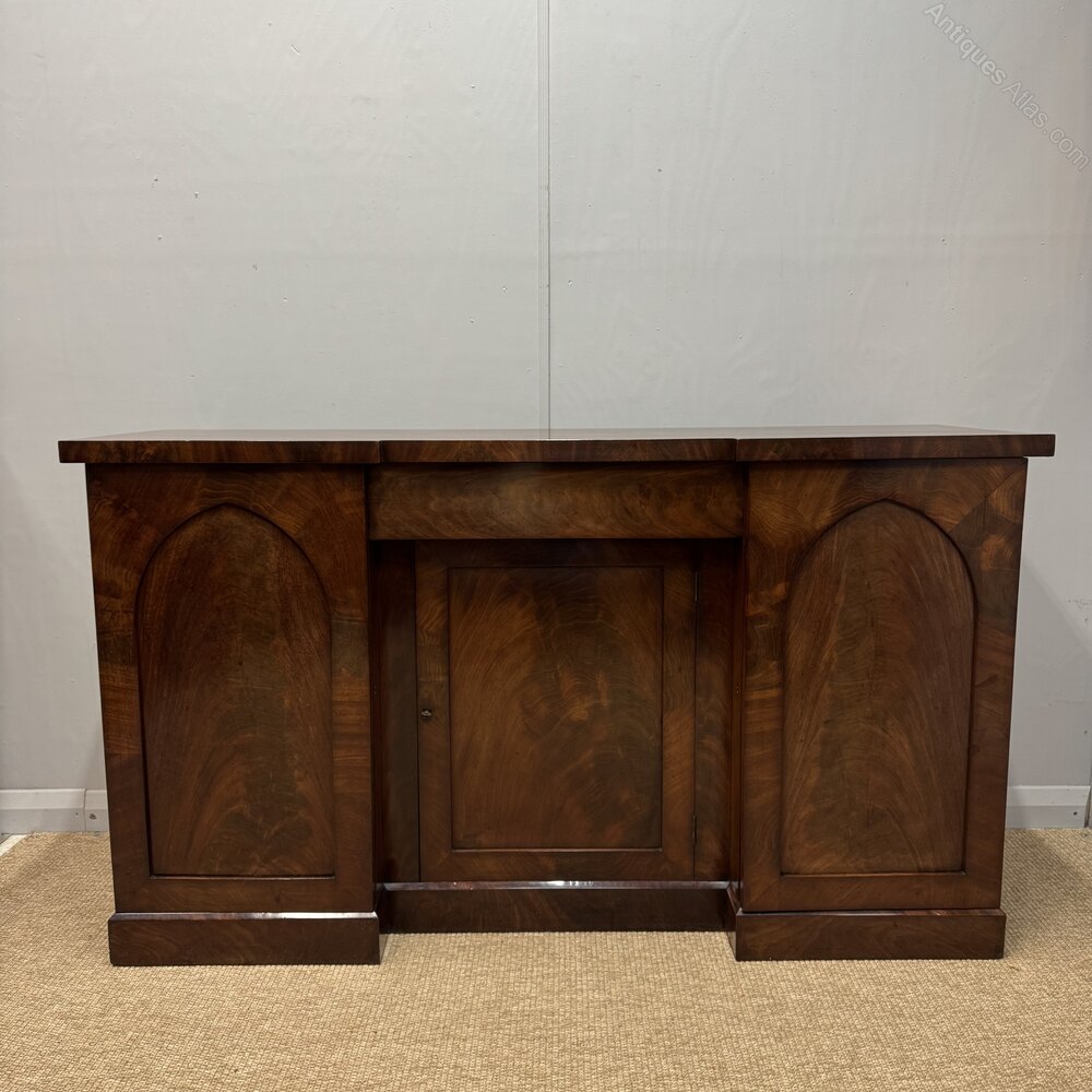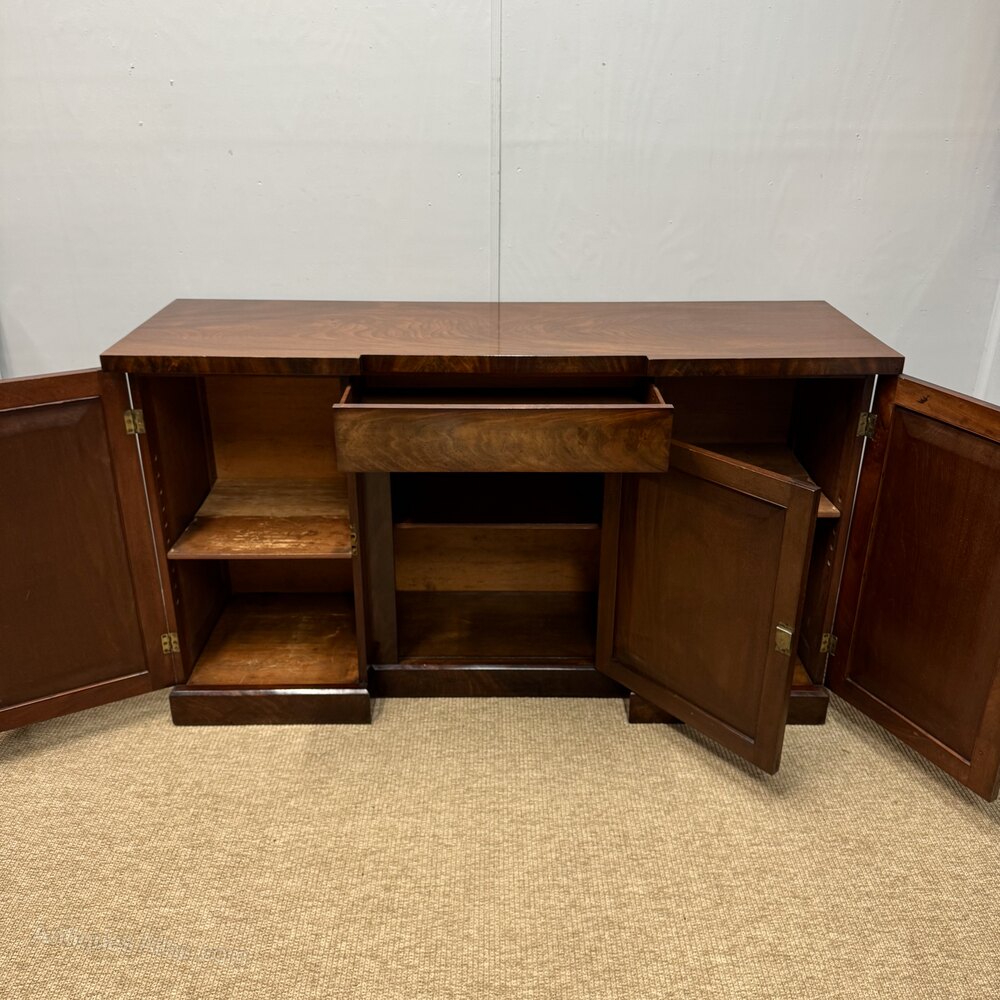Unusually smaller size William IV period mahogany breakfront sideboard with adjustable shelves and a central drawer, circa 1840.