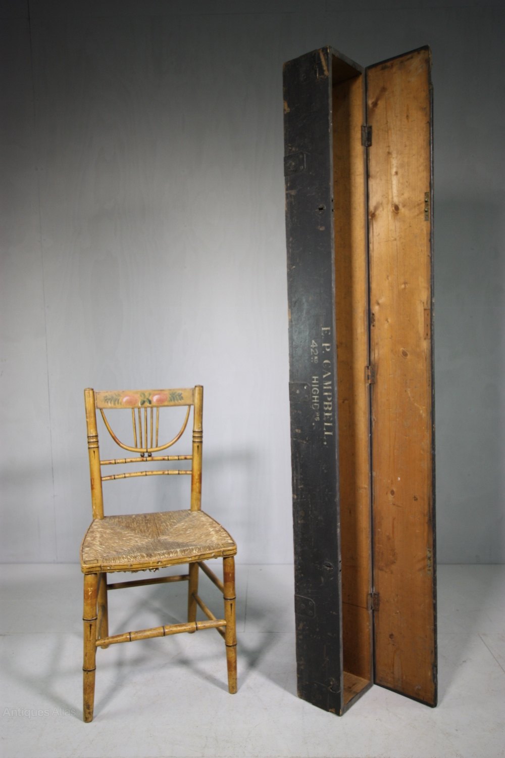 This antique pine box is in the original ebonised finish with metal bound edges. The lid hinges up and is lettered E.P. Campbell 42nd Highlanders. There is also a paper label for Colonel R.Parker Browsholme Hall, Clitheroe. In super condition, dating from the 19th century, this antique military box would be ideal for storing fishing rods in.