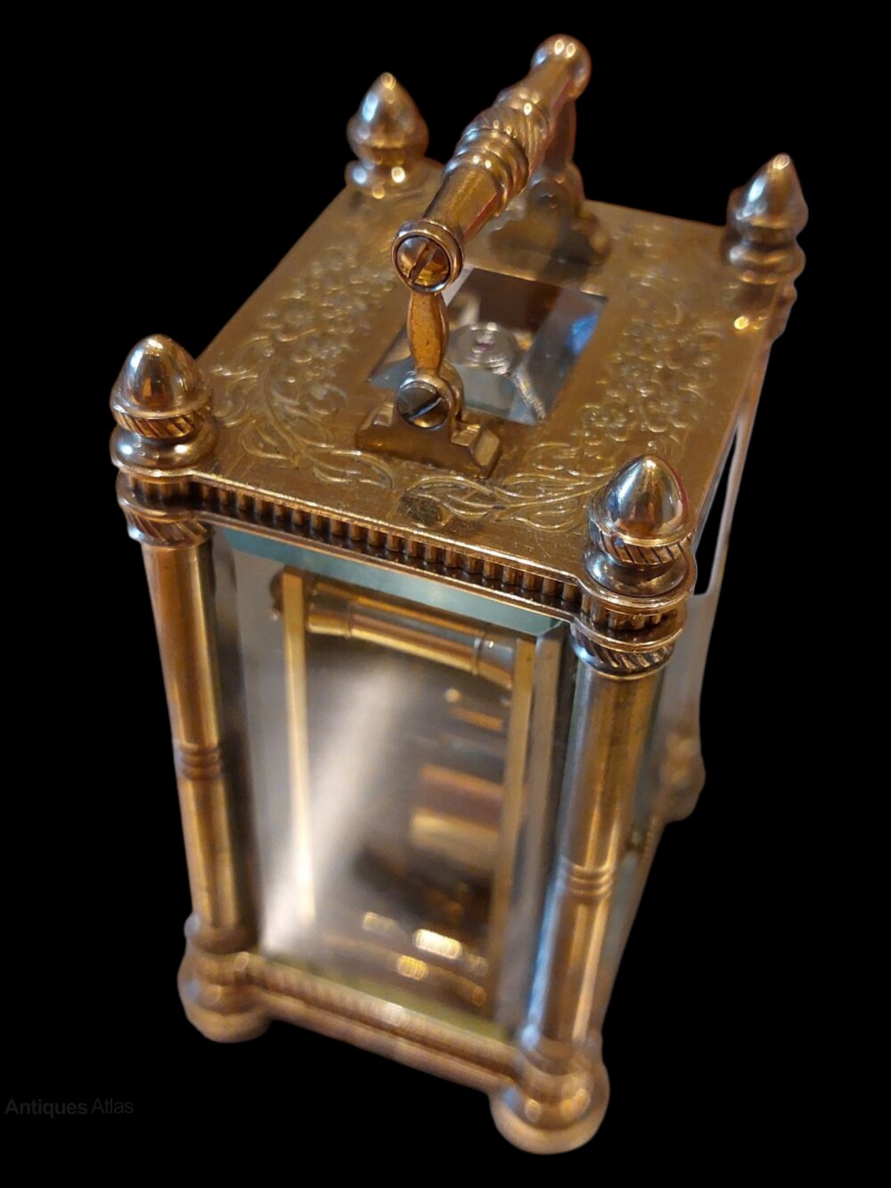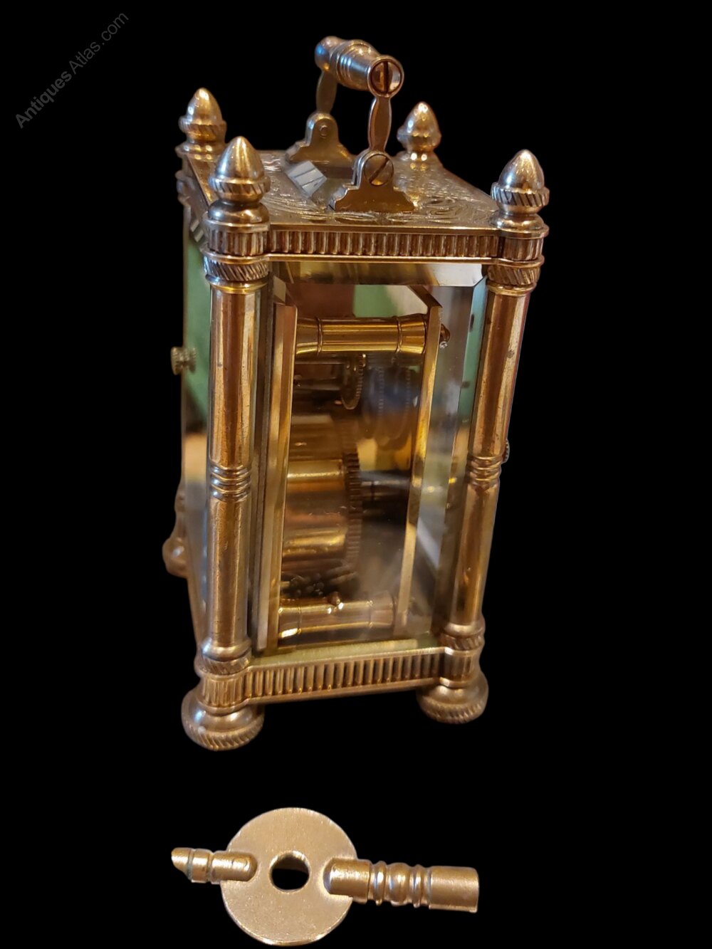 A very good quality Edwardian 8 day brass cased miniature carriage clock with French movement. Profusely engraved brass case with pillars to the four corners. Finials to the top and bun feet to the base. Bevelled glass to all the panels. Serviced and in working order. 8 day French movement with platform escapement. 4" tall to top of handle. 2 1/4" wide x 2" deep. In superb condition. With original double sided winding key.