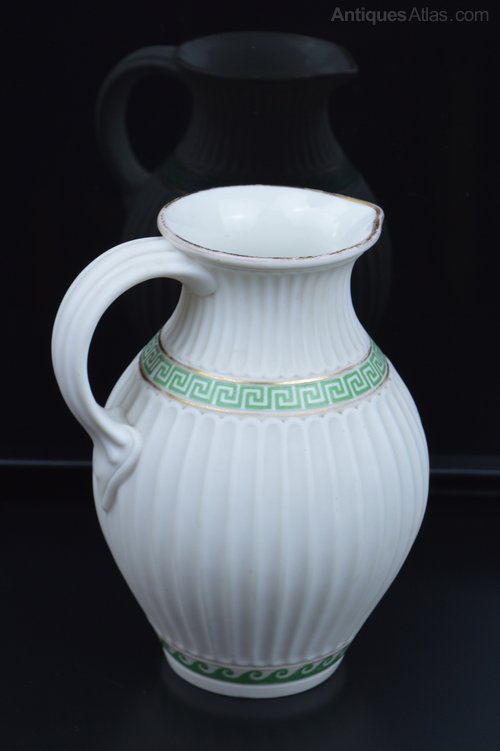 Crisply modelled elegant jug with glazed interior is based on a classical shape with vertical fluting and fret and waved scroll ornaments in green surrounded by gilding. In excellent condition no chips, cracks or restoration. Minor rubbing to the gilding on the rim.