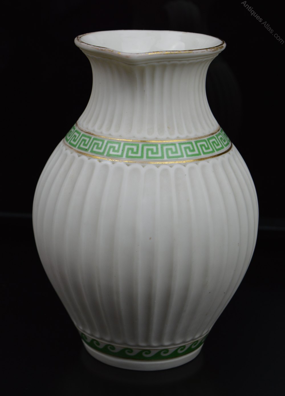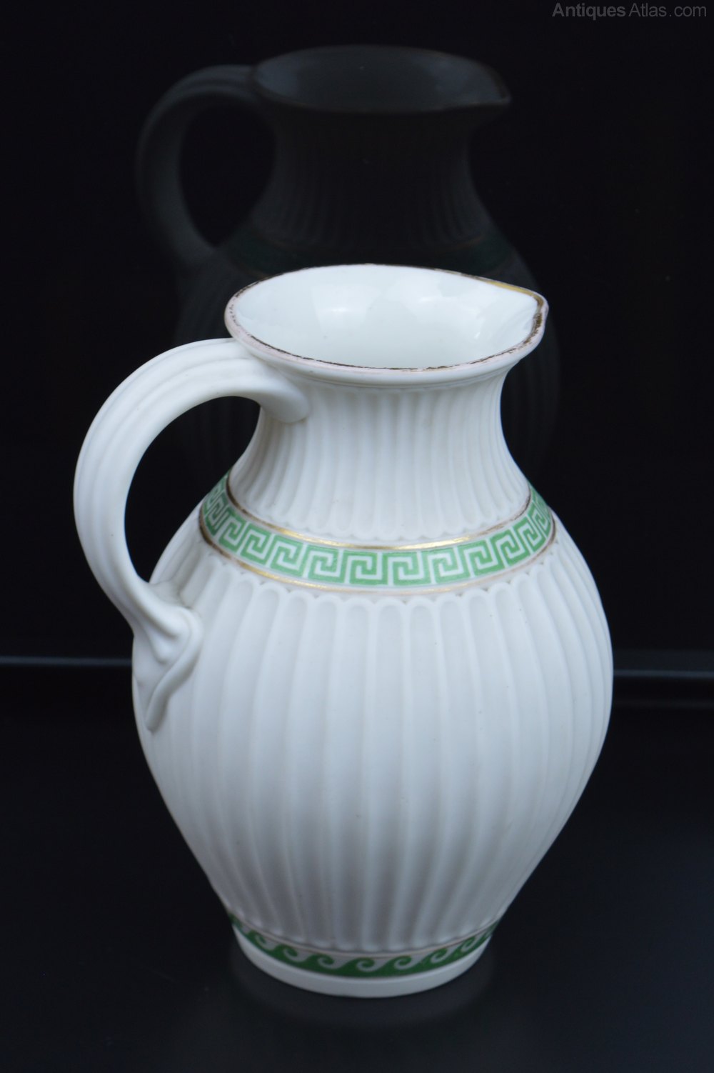 A Minton Parian ware jug/pitcher in the Lismore pattern, this particular version is decorated in a rare colourway, namely green and gold over plain body in the Greek key pattern.