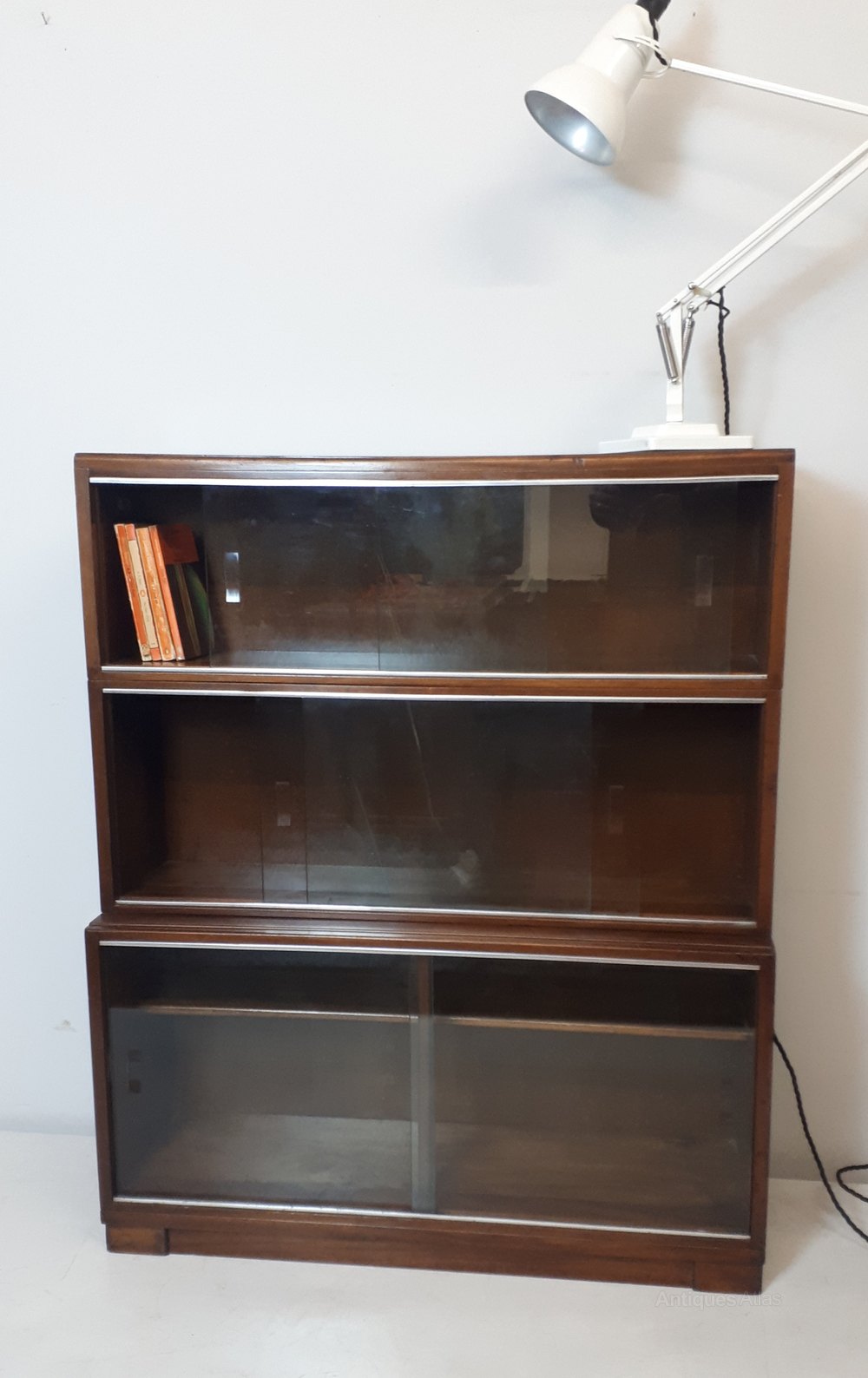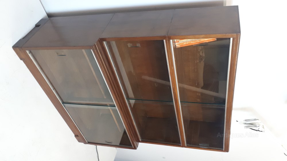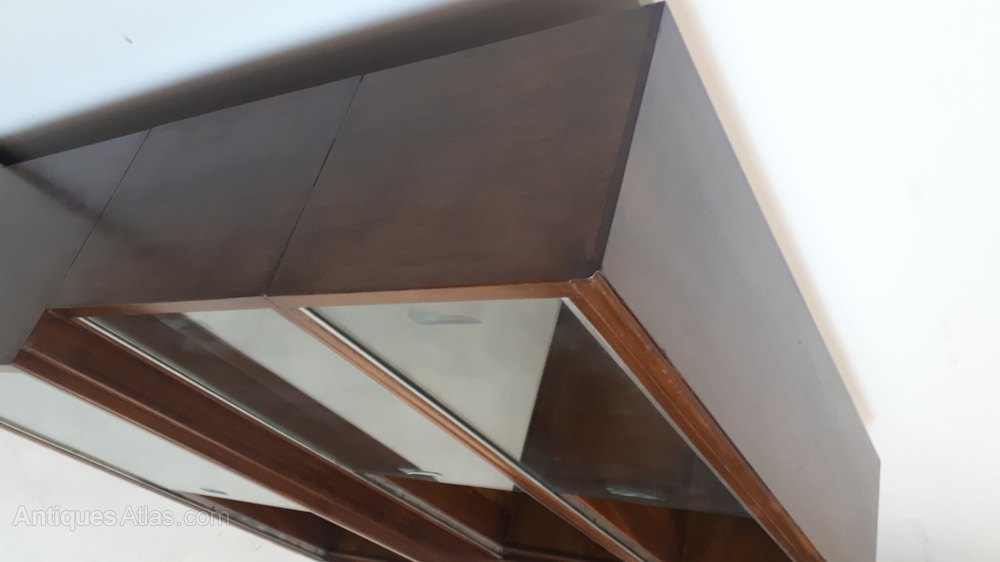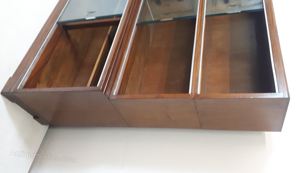 Three detachable units in mahogany with thick plate glass sliding doors.
