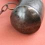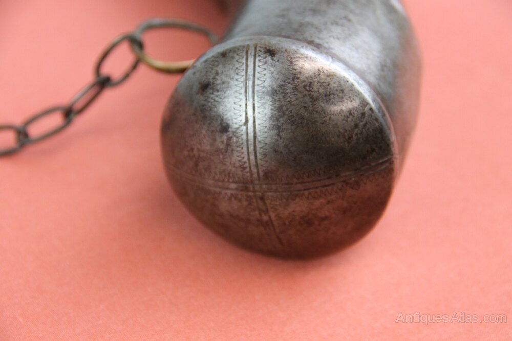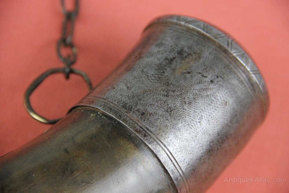Moroccan Horn powder flask with iron mounts hanging on a brass chain. Faceted spout and zigzag pattern decoration to some mounts. Has general wear wear overall with old split to end cap - see photo.