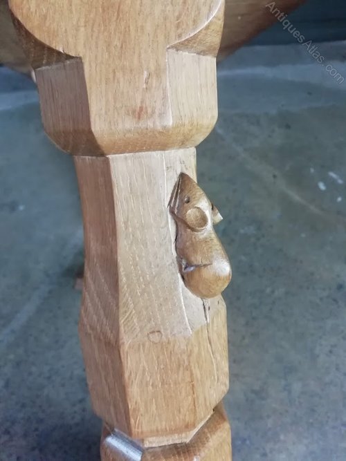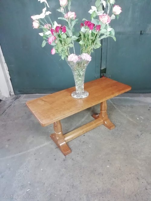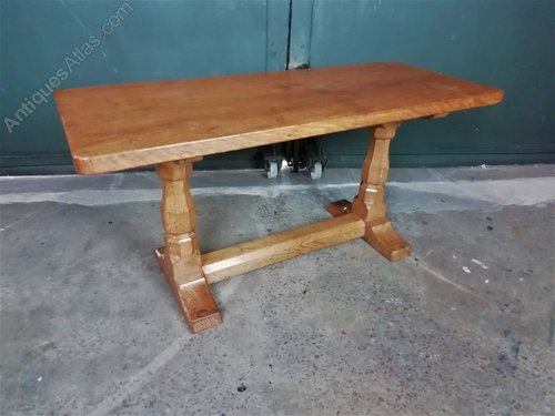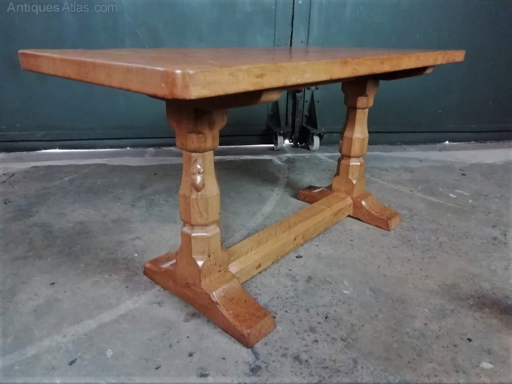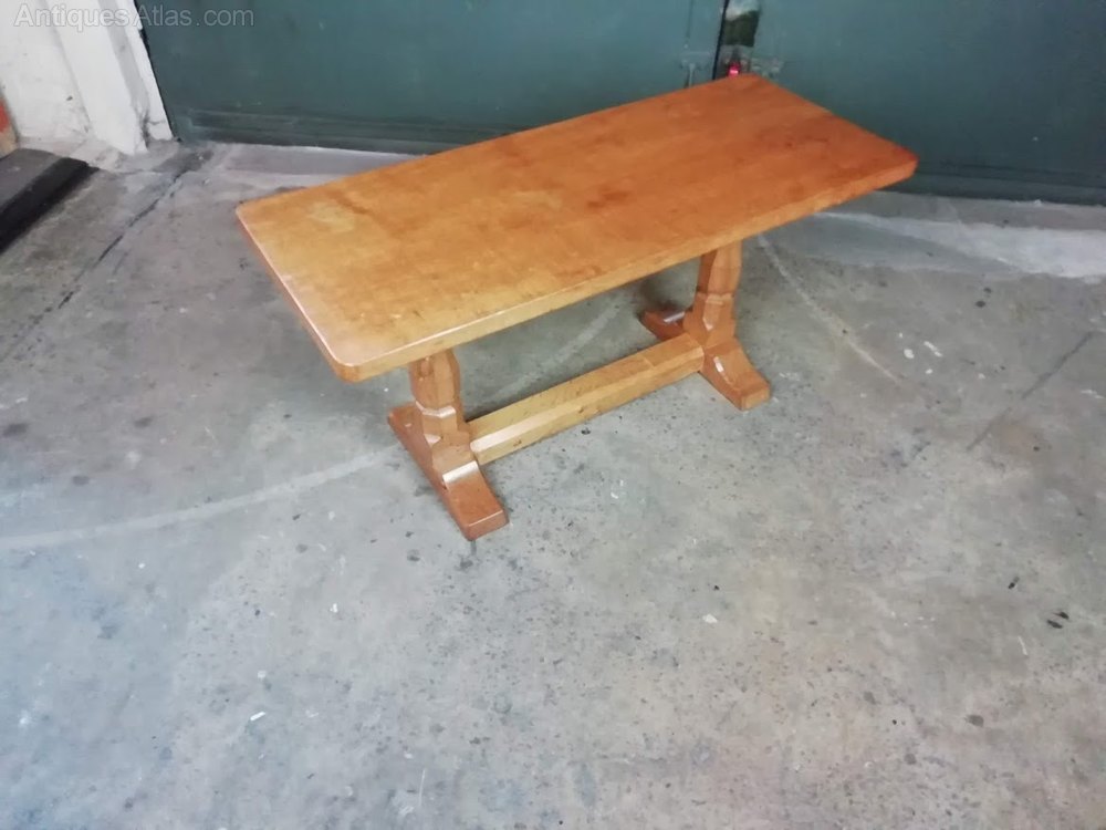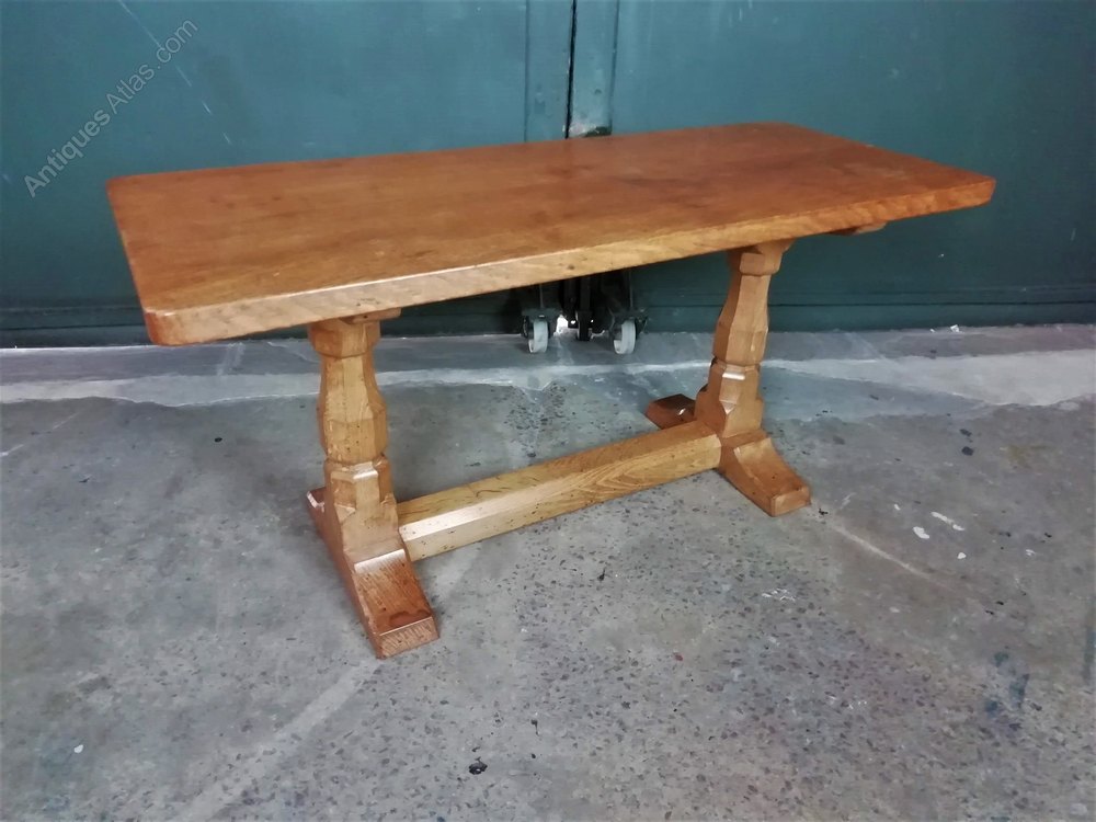 Mouseman oak coffee table circa 1960, made by Robert Thompson of Kilburn, beautifully made throughout as to be expected from such a well respected and highly distinctive firm of cabinet makers. Complete with a sturdy adzed oak top and of course the firms charming signature of a carved mouse to one of the supports