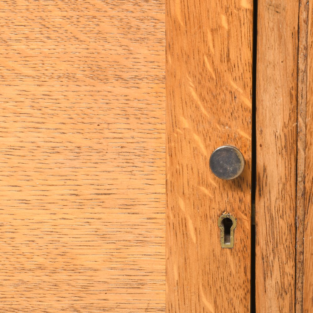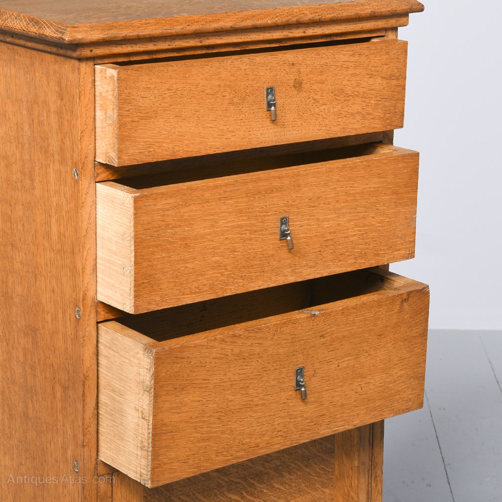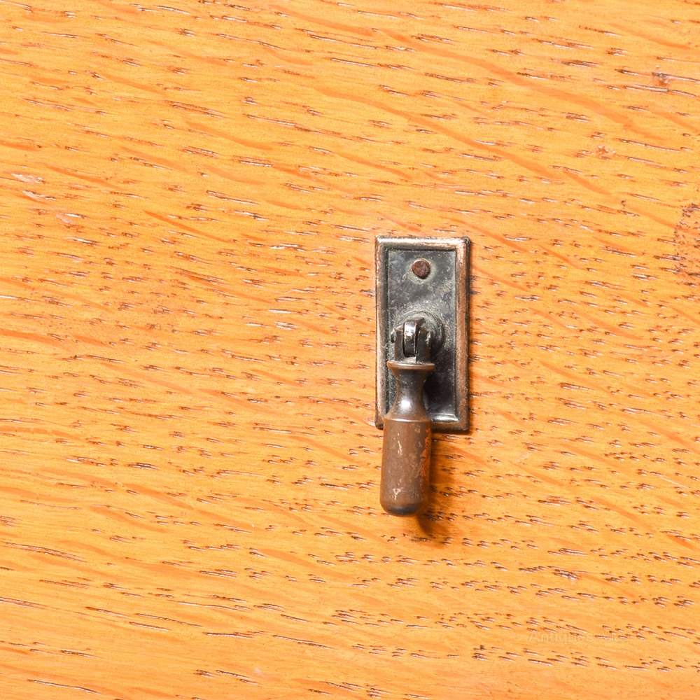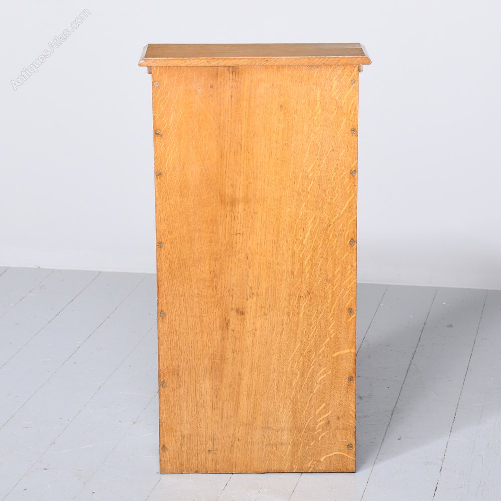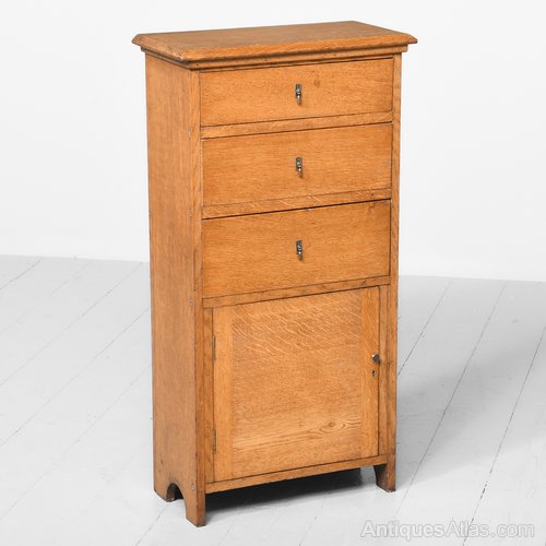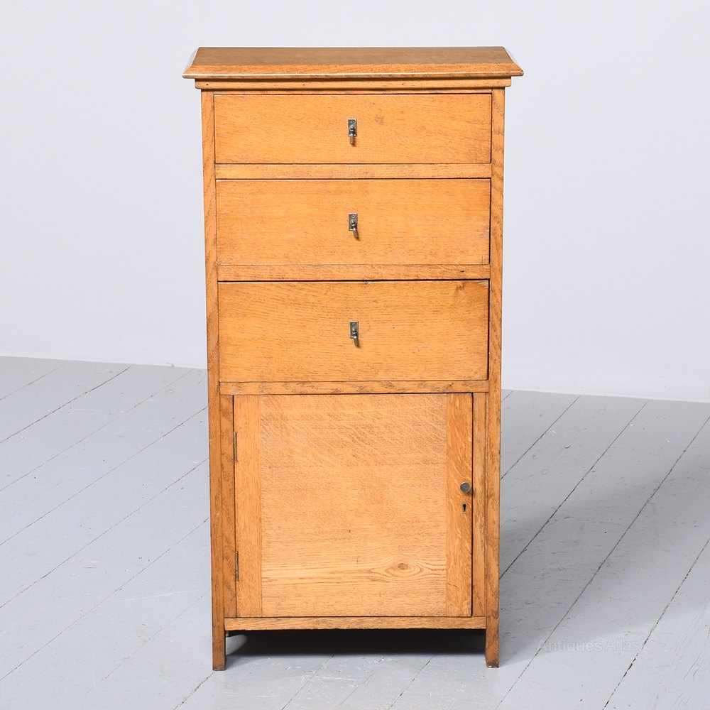 Circa 1920’s, an unusual and stylish neat size narrow tall oak chest, solid rectangular top with chamfered fore edge, to the front there is a combination of three full length drawers with dainty small cast brass drop handles, beneath the full-length drawers there’s a simple cupboard, the cabinet has solid gables with arch cut outs at the bottom which form the feet.