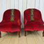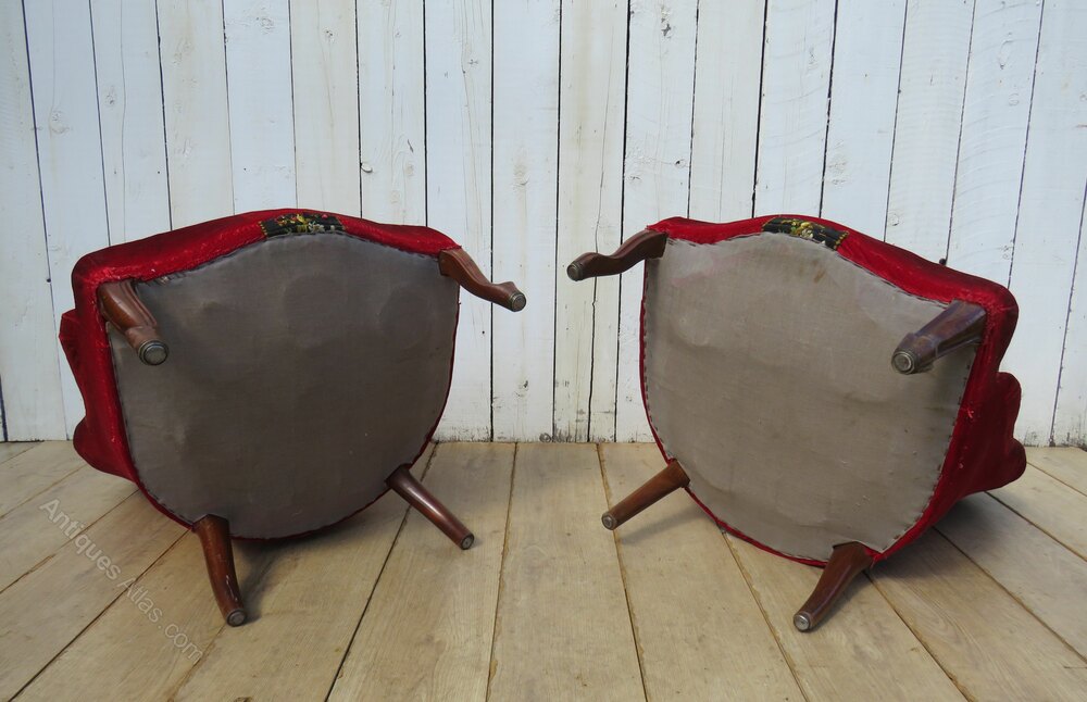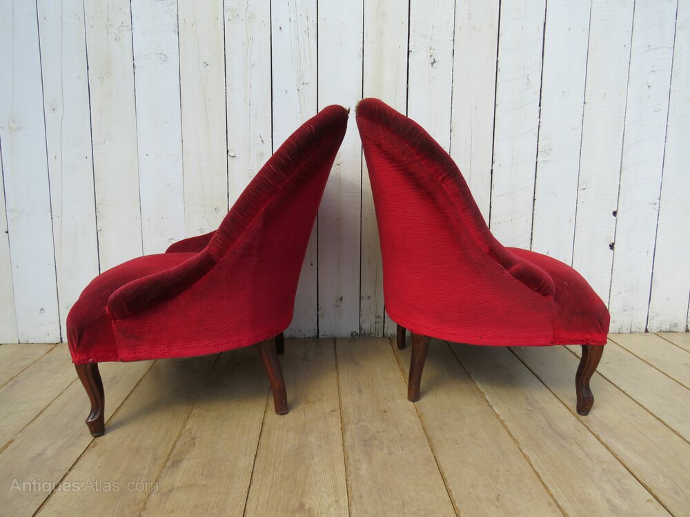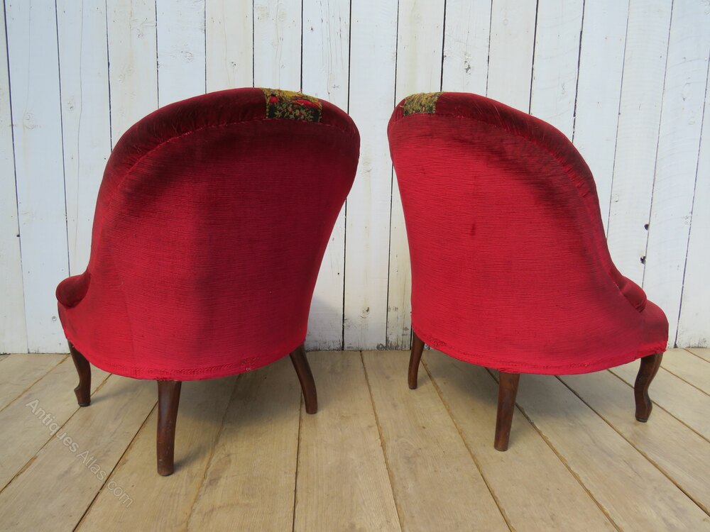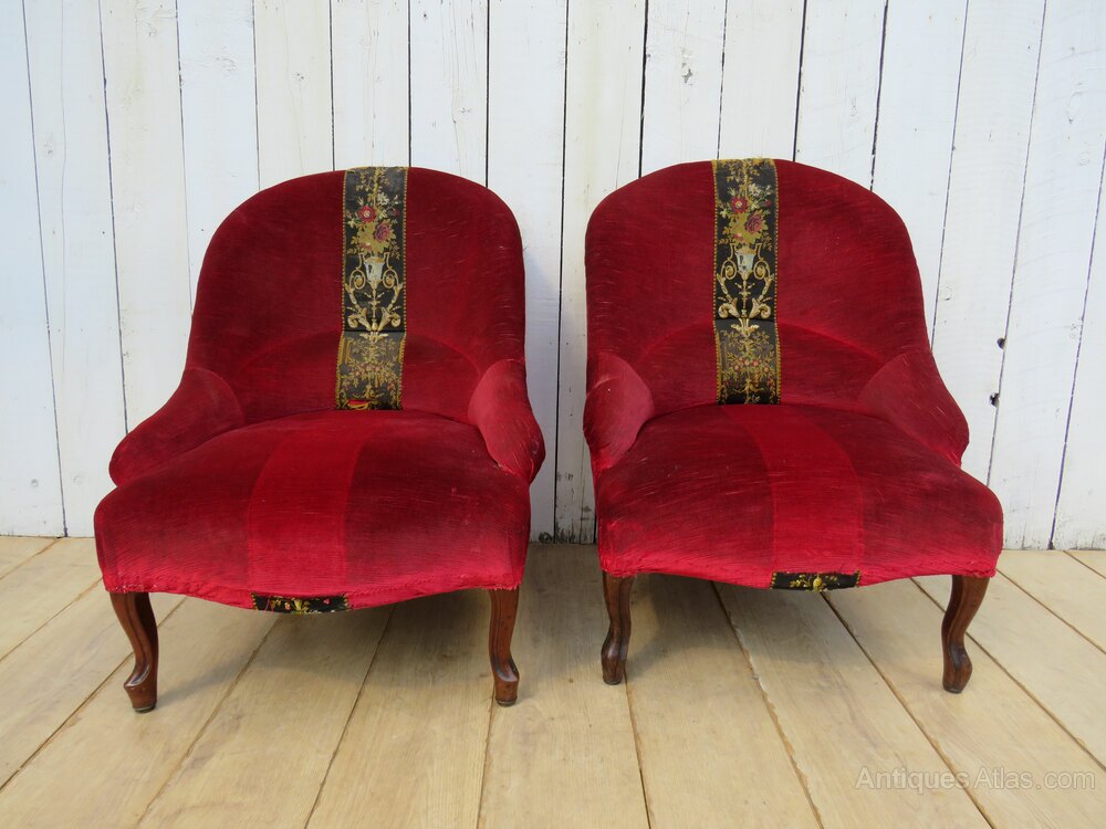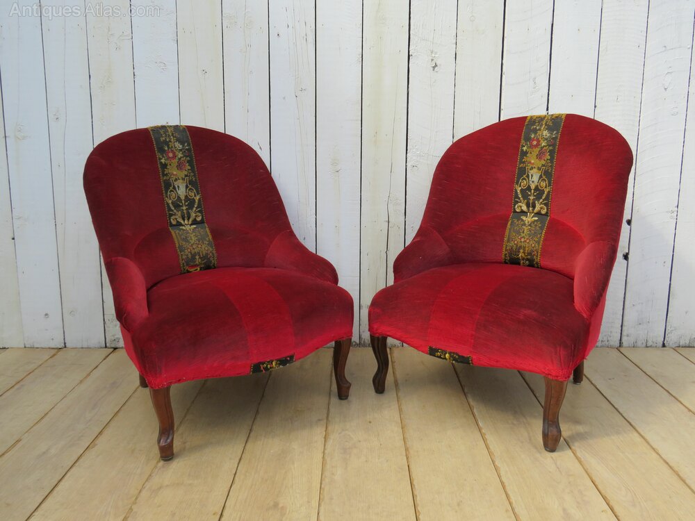 Near pair of shapely 19th century French serpentine fronted Napoleon III crapaud boudoir, nursing, tub armchairs on oak legs for re-upholstery. Dimensions are for the larger of the two.