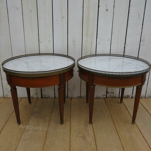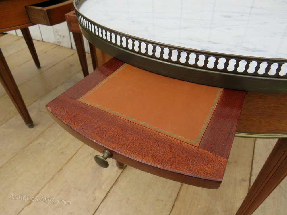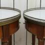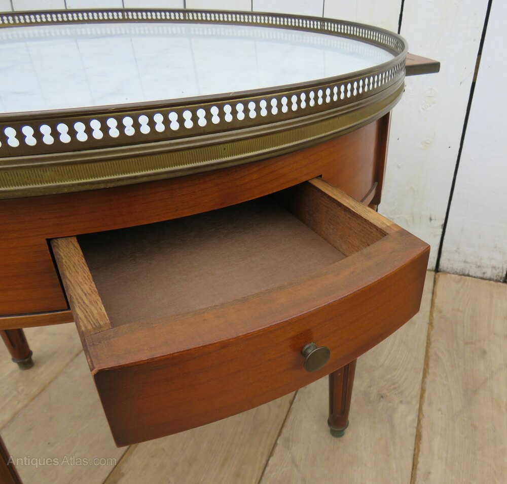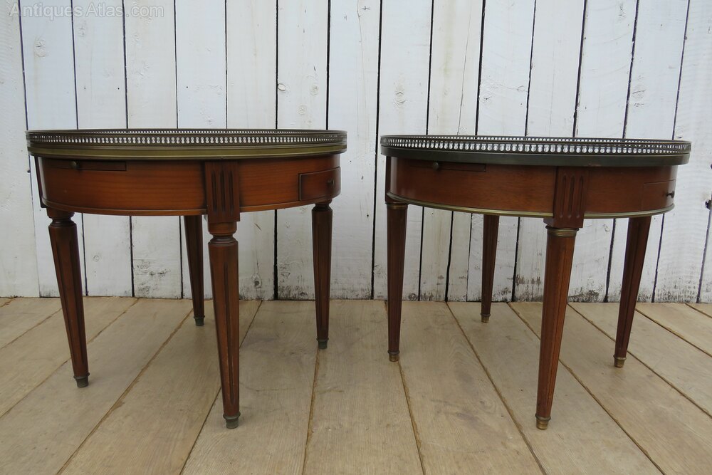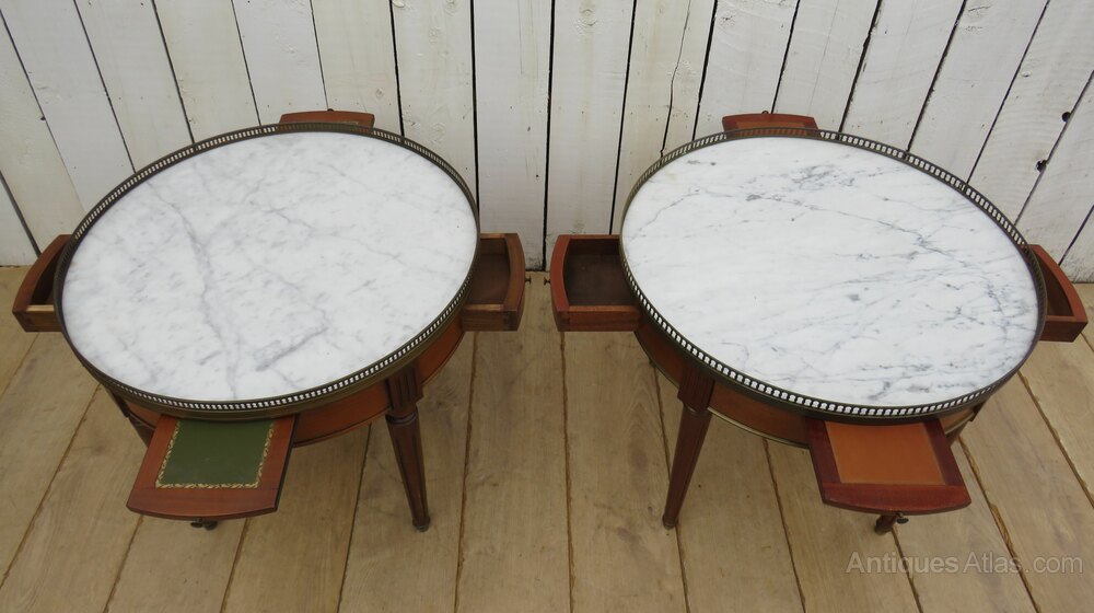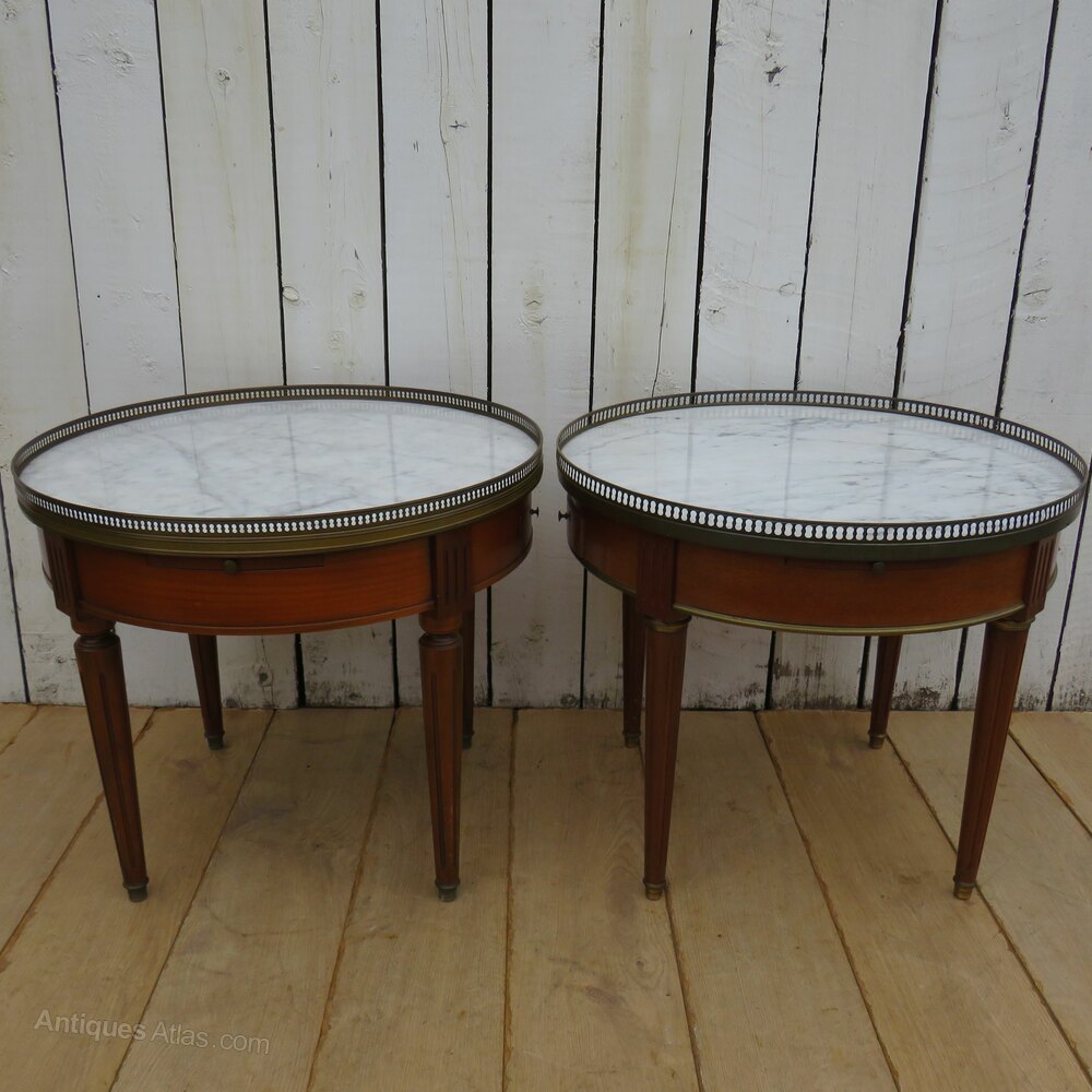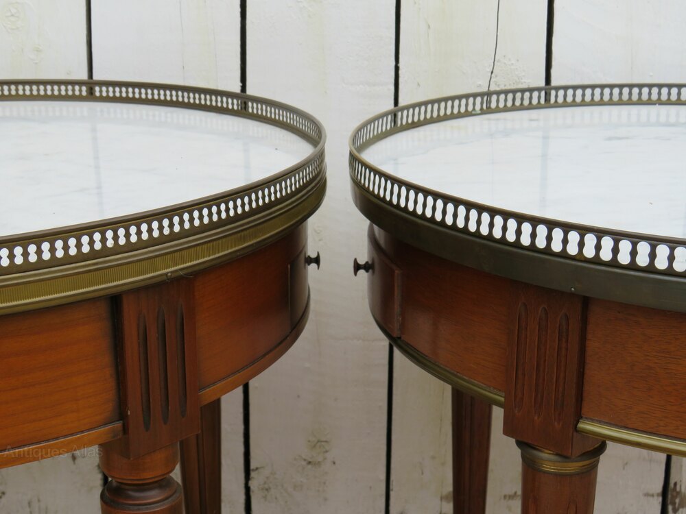 Very near pair of shapely, sound and sturdy mid 20th century French walnut and marble top side, games, coffee, lamp, wine tables with two drawers, two candle slides and pierced brass top gallery.