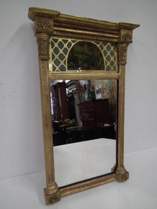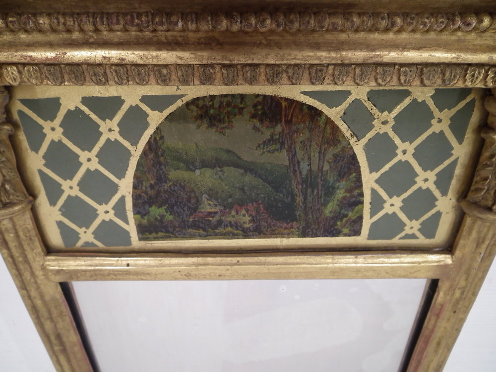 Circa 1815, neat size eglomise mirror with fluted pilasters, surrounded by acanthus columns with rural scene in duck-egg and gilt background.