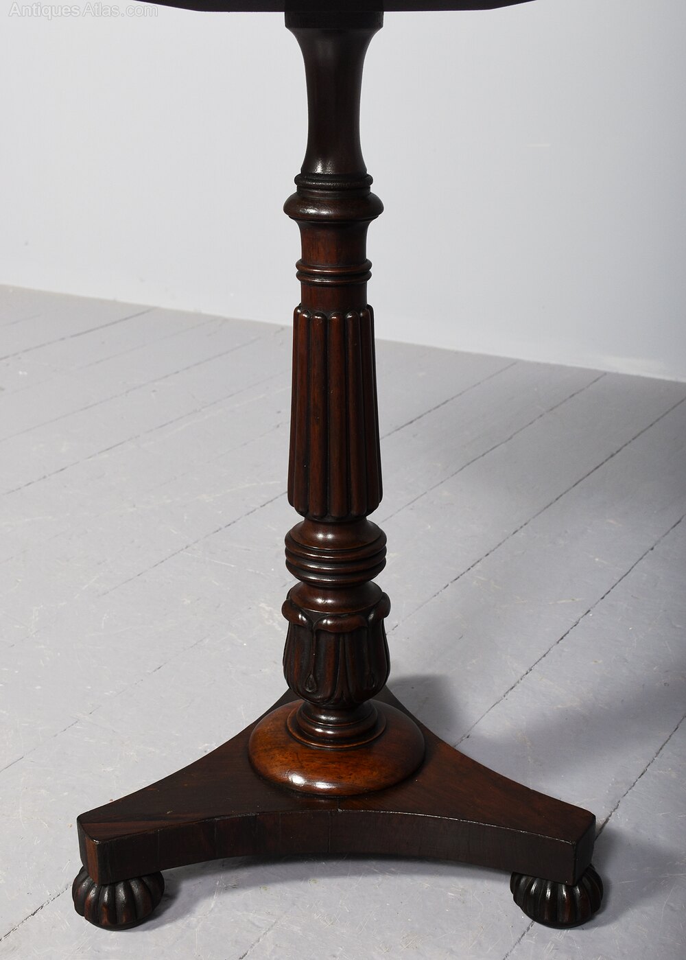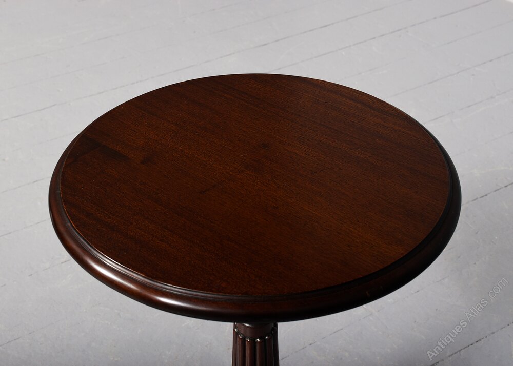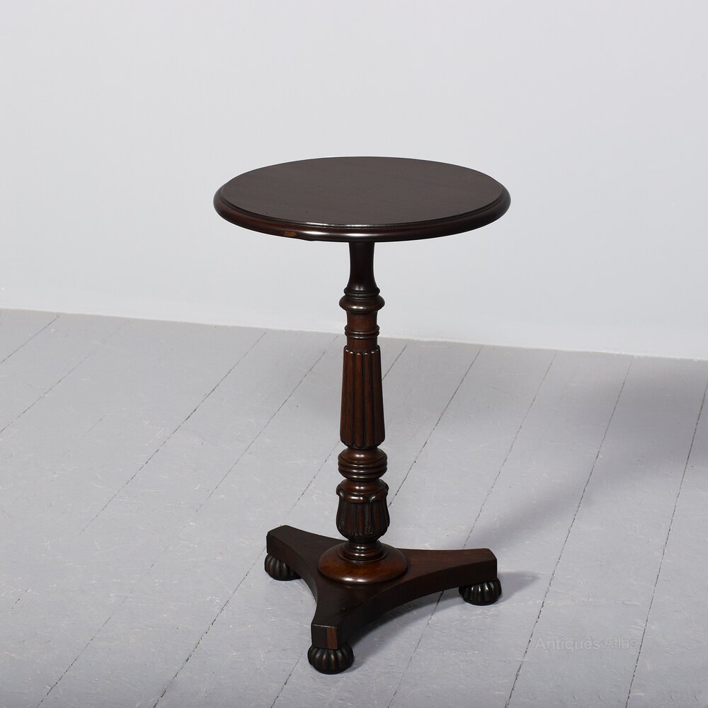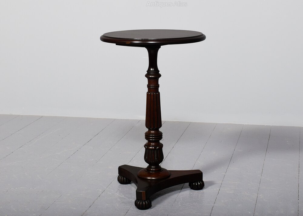Circa 1830 (with alterations). Neat size Regency occasional wine table on a fluted tapering stem. The circular top with a moulded rim, with a beautiful tapering fluted base with acanthus carving and a turned collar over a tripartite base on fluted bun feet