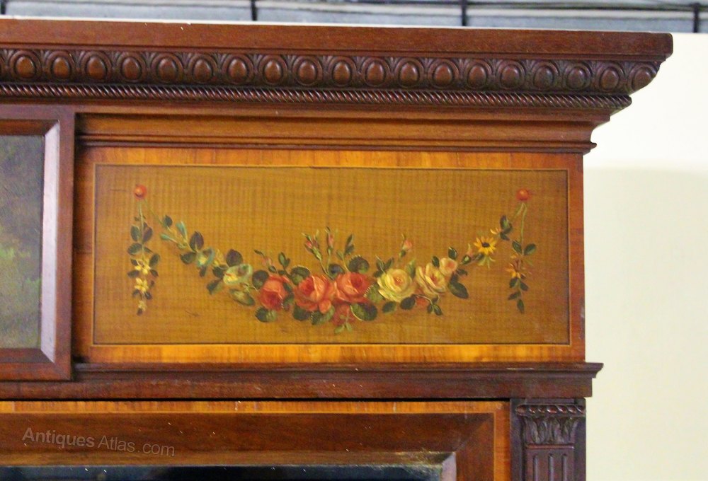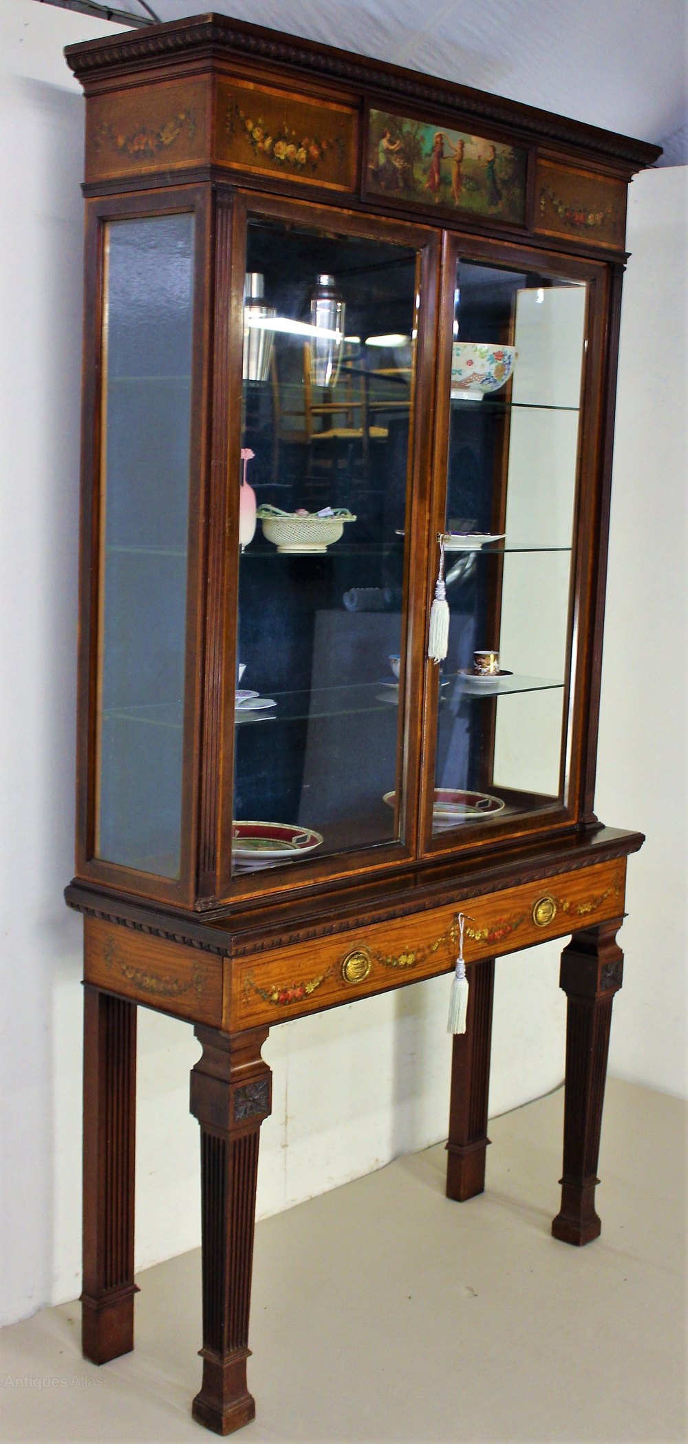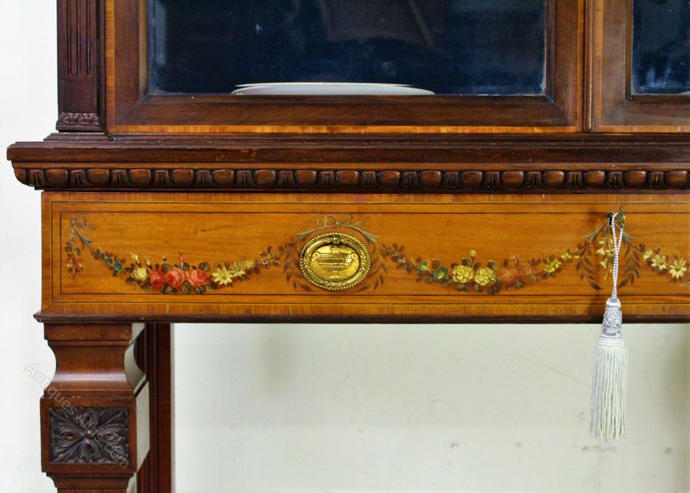 A superb mahogany display cabinet in the neo classical style of generous proportions. Of fine construction in solid mahogany with satinwood veneers and embellished with hand painted decorations in the manner of Angelica Kaufman. The pair of glazed doors are fitted with their original beveled glass plates and open to access a shelved and lined interior. Surmounted by a substantial cornice with hand painted decorations. The base section has a single long drawer fitted with satinwood veneers and further embellished with hand painted floral swags. All standing on square fluted legs. This stunning cabinet affords generous display space and is offered for sale in excellent original condition.