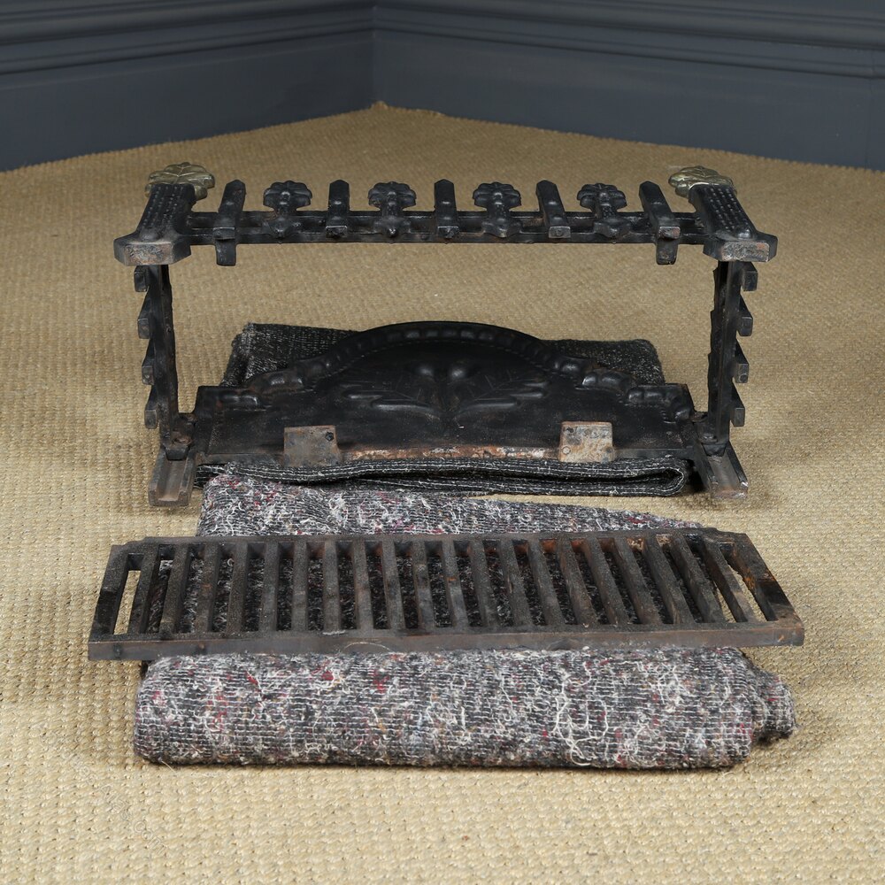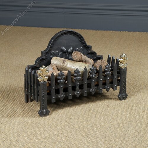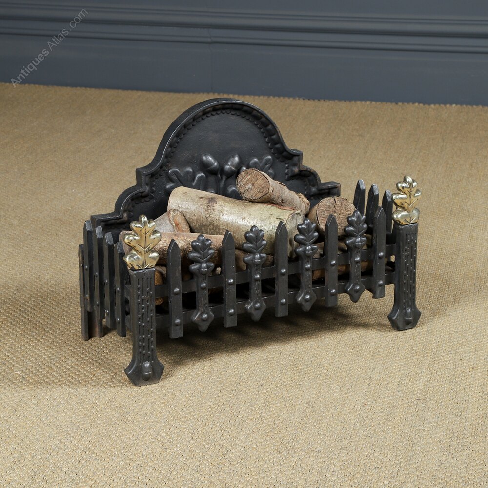 Condition This is a fine quality antique English traditional 18th century style fire grate, incorporating a neo-classical oak leaf design, made from cast iron, circa 1890, in excellent condition. The cast iron frame and brass finials have been cleaned. The fire grate is solid in joint and is robust. Nominal old use marks, but nothing significant considering the age of the item. There are no breaks to the cast iron basket. The internal grate floor is sturdy in good condition. The grate features an attractive rustic finish, giving it a lovely colour and appearance. This log basket is reassuringly solid and heavy (30kg) and is ready to use.
