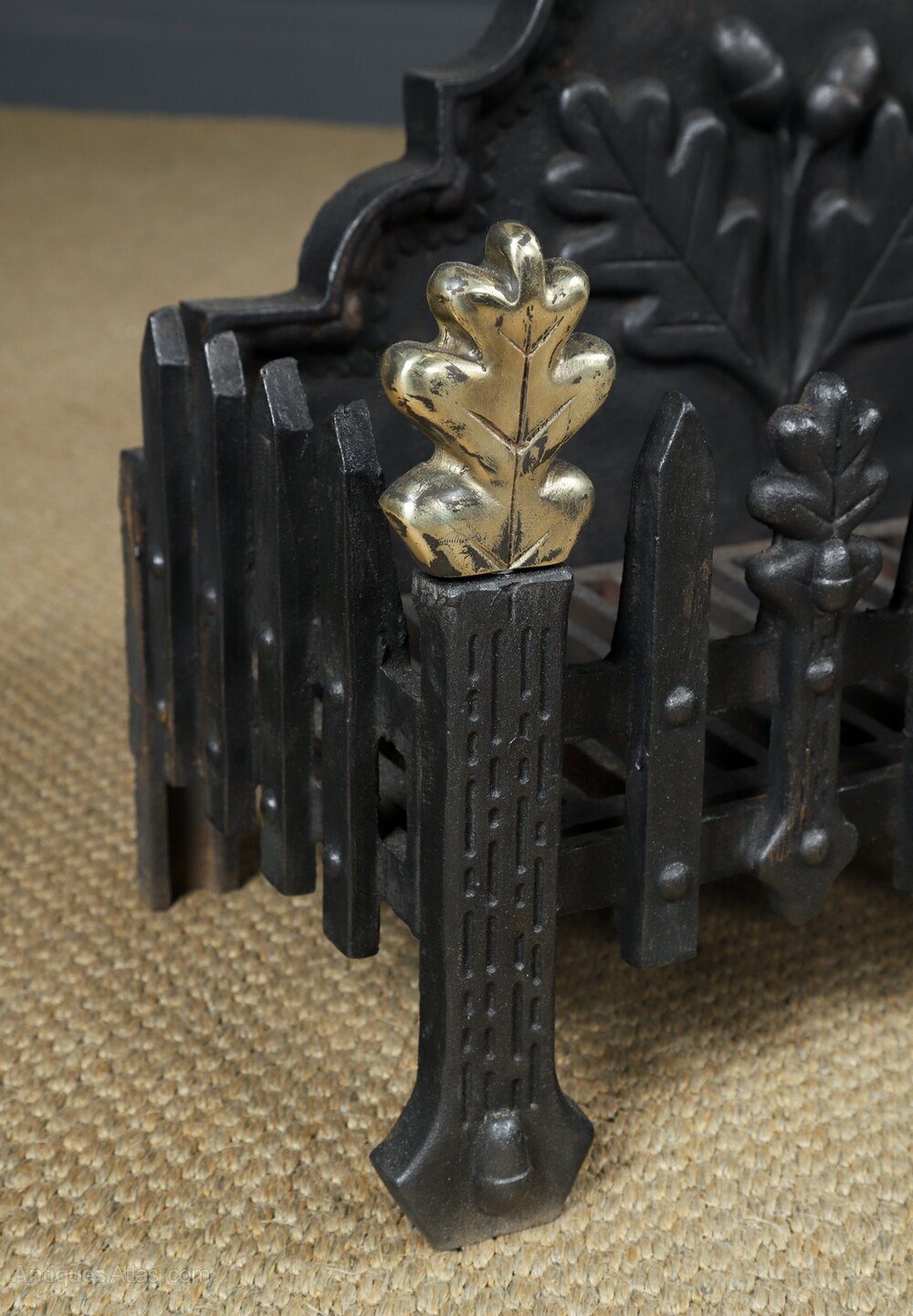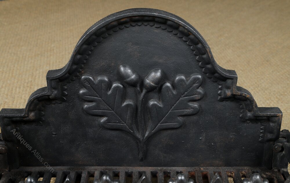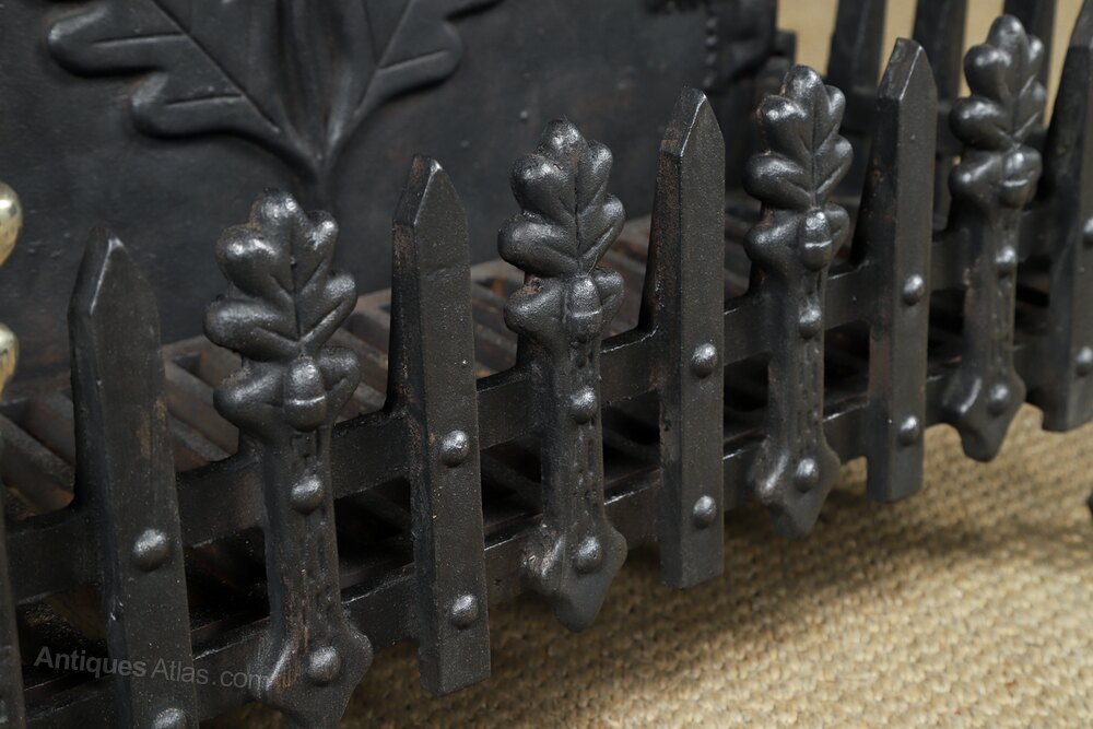This is a fine quality antique English traditional 18th century style fire grate, incorporating a neo-classical oak leaf design, made from cast iron, circa 1890, in excellent condition. Benefitting from a freestanding neo-classical / renaissance design, this fire grate features a domed backplate, decorated with an embossed oak tree leaf motif design. The fire grate is constructed with two taller rectangular legs at the rear, and two smaller shaped legs at the front, which support a pair of brass oak leaf finials.