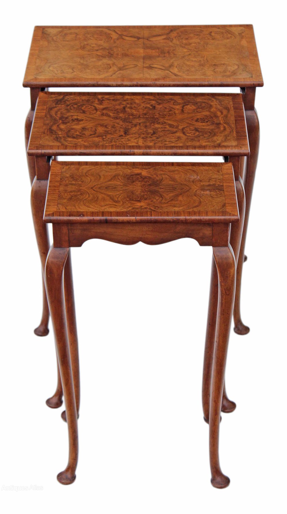 Antique nest of 3 burr walnut side or occasional antique tables.