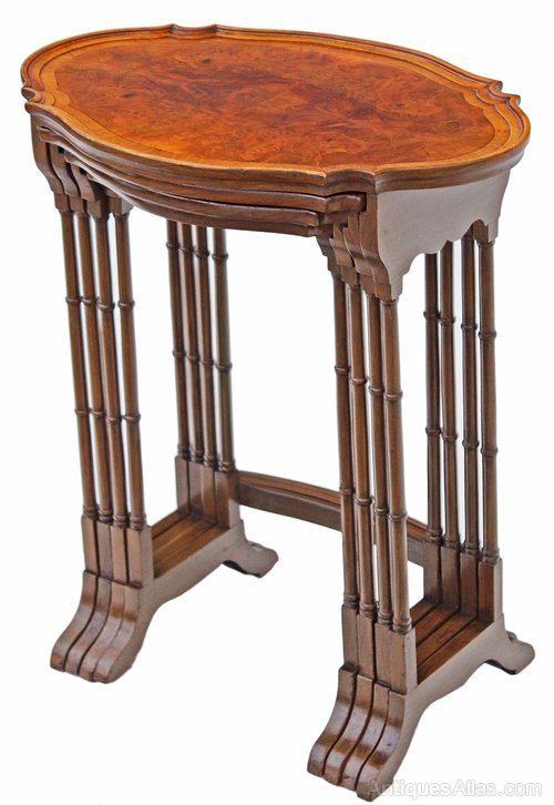 A quality, attractive nest, with no loose joints or wobbles. Solid mahogany construction with burr walnut veneered tops. No woodworm.