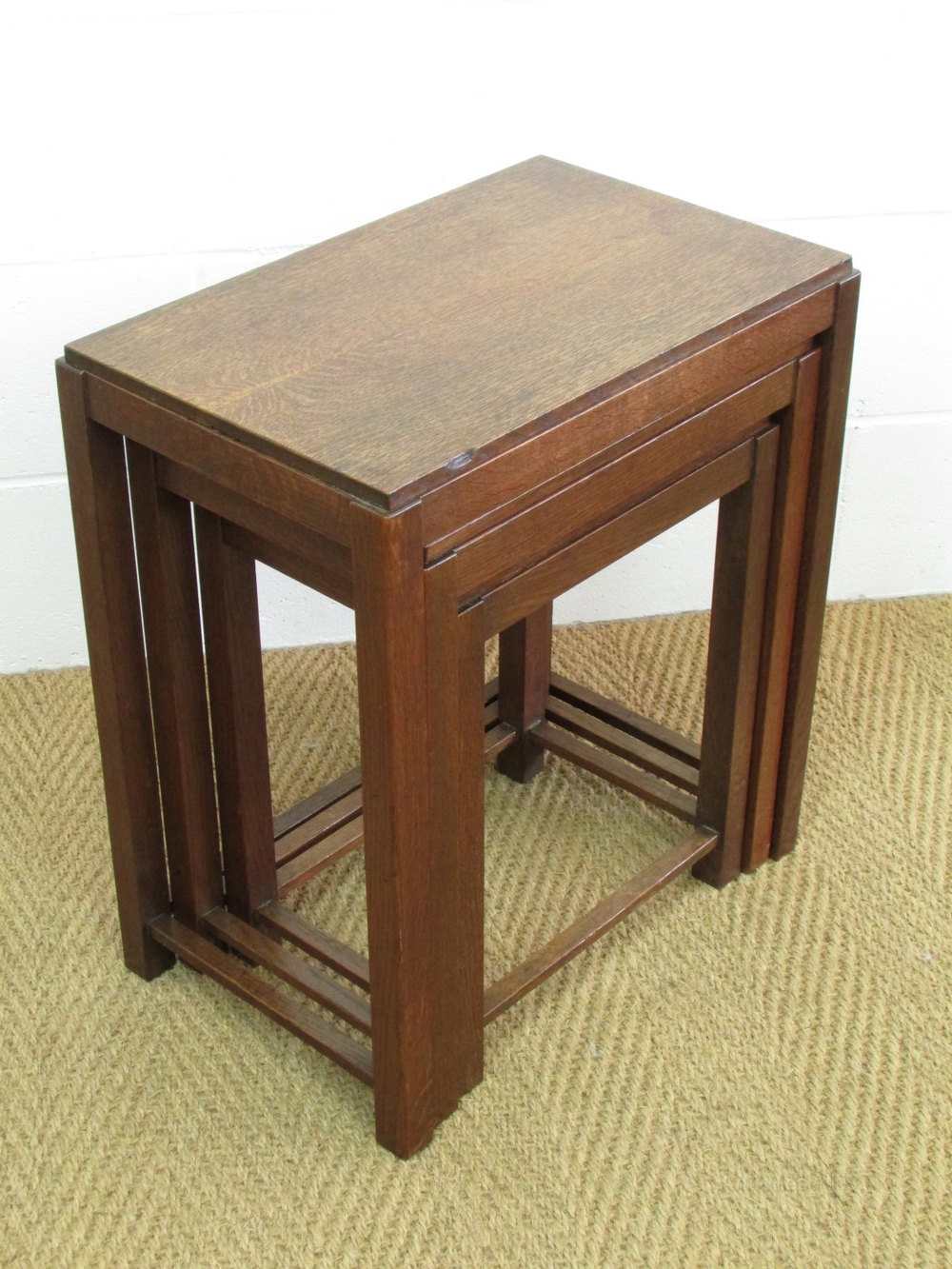 A nest of three oak occasional side antique tables constructed in well figured quarter sawn oak attributed to Gordon Russell c.1925. No label but there is an impressed catalogue number to the underside of each table. See Good Citizens Furniture by Annette Carruthers and Mary Greensted pg.148 for similar.