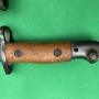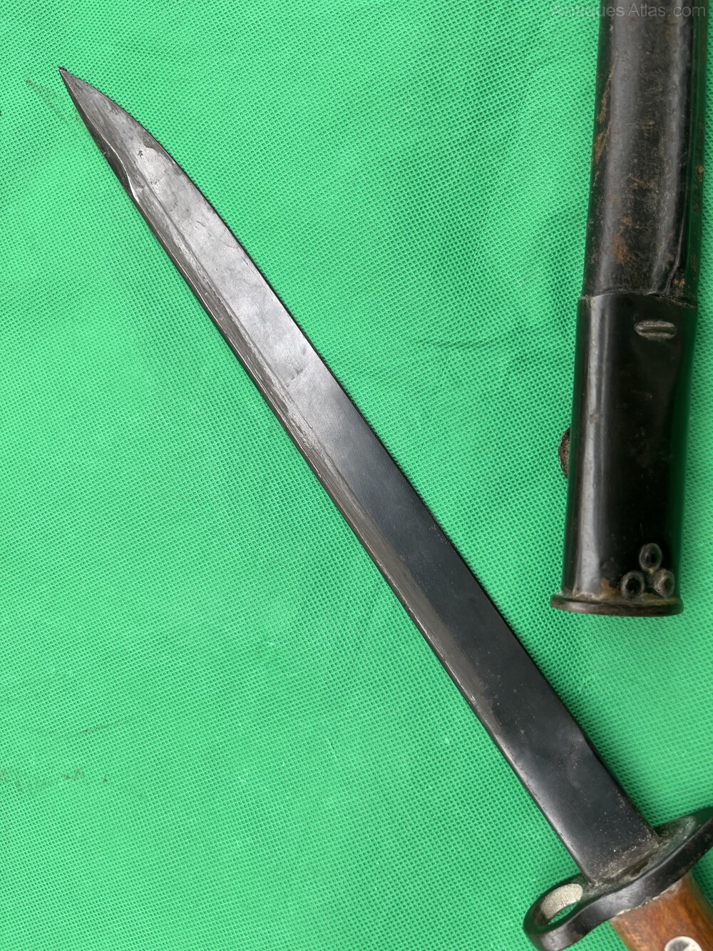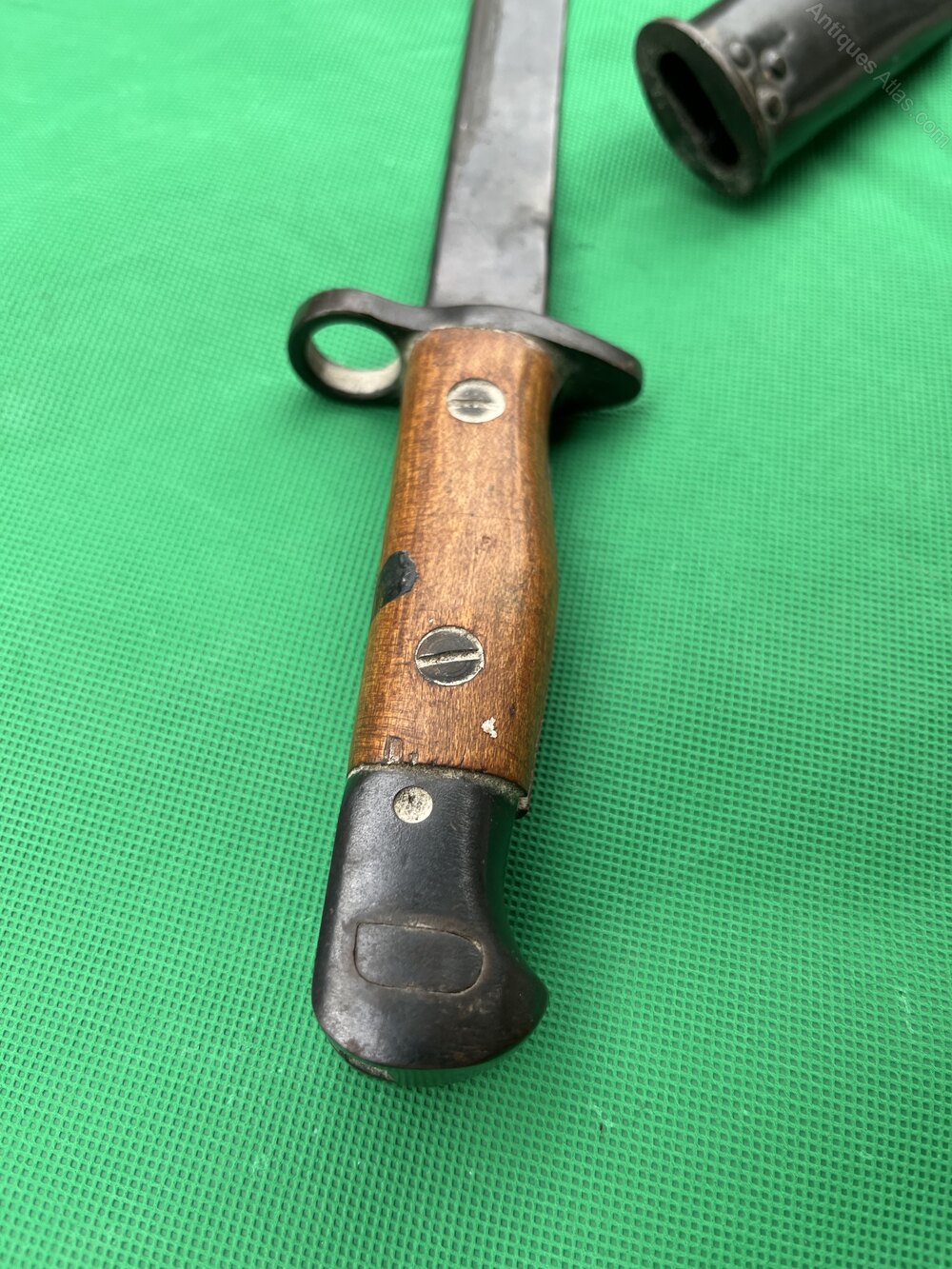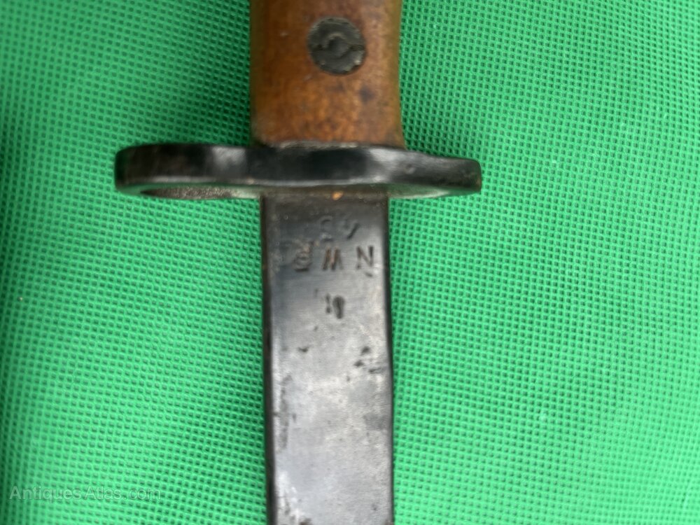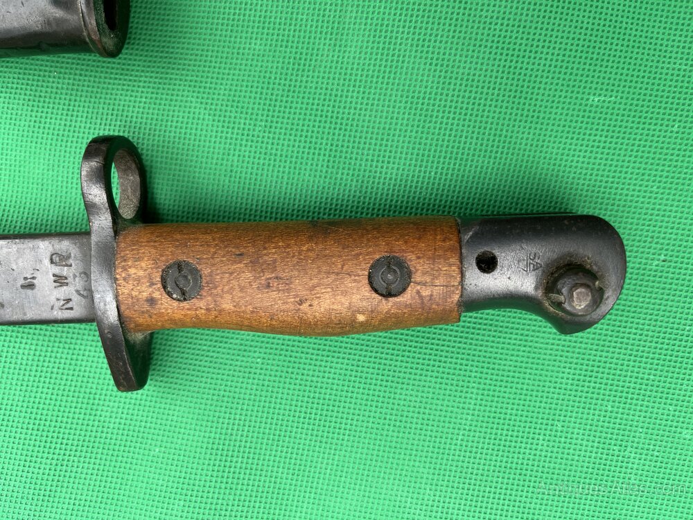 A good example of a No.1 MKII bayonet stamped NWR 1943. Made by North West Railways in India for the British Army.Blade 30 cms long, stamped NWR 43, hilt stamped SA17, Toatl length 43 cms. Scabbard in good condition.