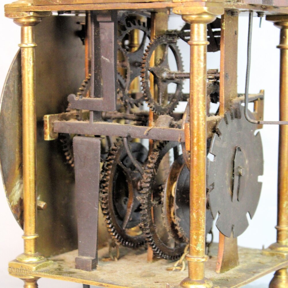 Condition Very dirty and dusty. The iron work has been painted black to prevent rusting and the brass case and dial have been coated in lacquer which is breaking down.There appears to be some damage to the dial and it has been repaired. The top finial does not match and the doors, backplate, weight, pendulum, hoop andspikes are missing also, the bell strap has joined legs which are too long. Both chain sprockets appear to be original.The pictures are self-evident. Upon examination, the movement appears to have very little wear and a clean and lubrication may well place it into working condition.