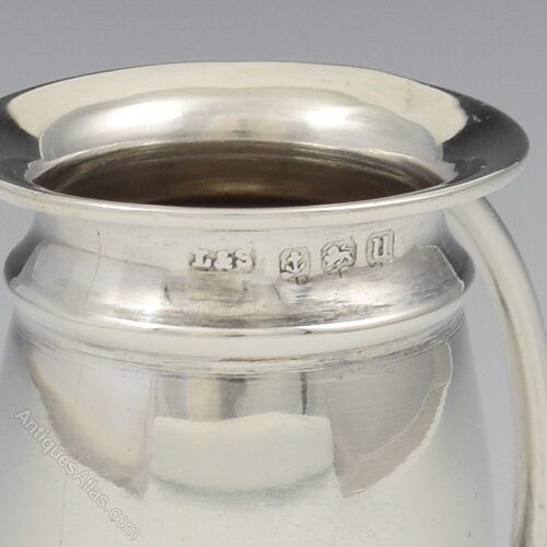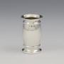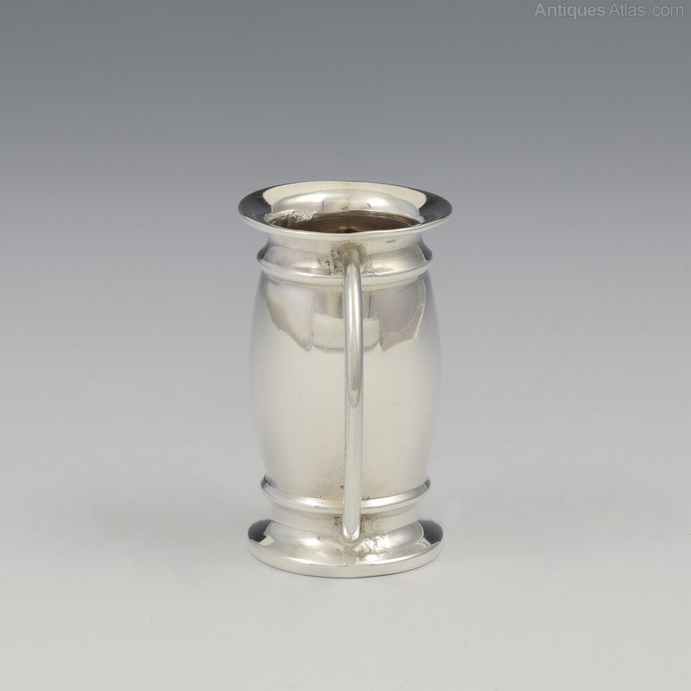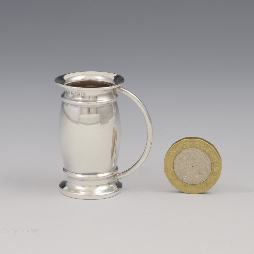 A very sweet novelty miniature silver flagon of baluster shape with reeded bands above and below a flared foot and rim and curved tubular handle. Hallmarked to the neck for Birmingham 1919, makers Levi & Salaman and a further lion passant mark to the base.