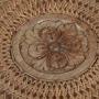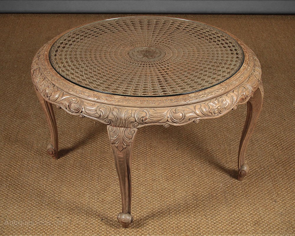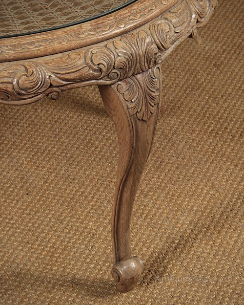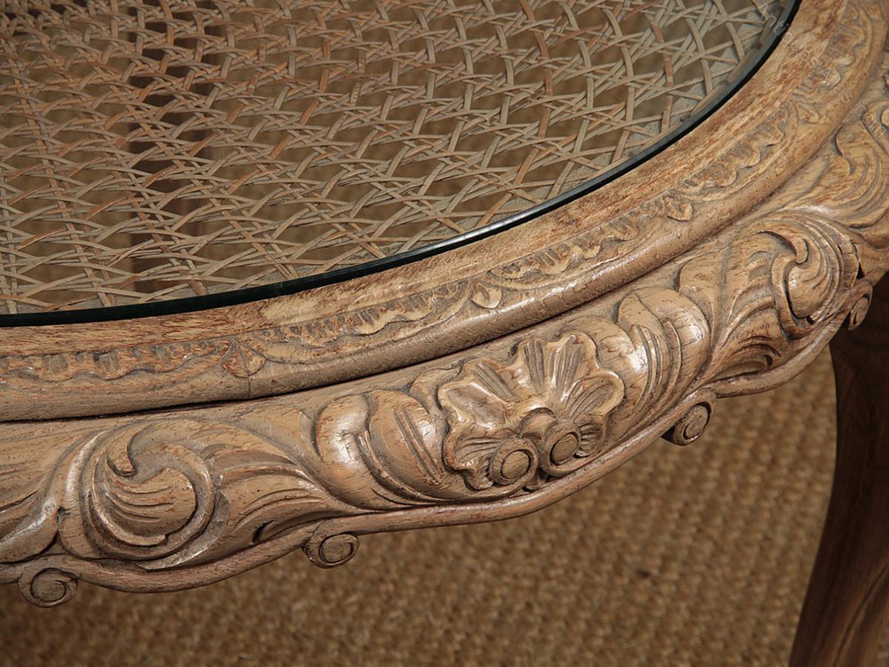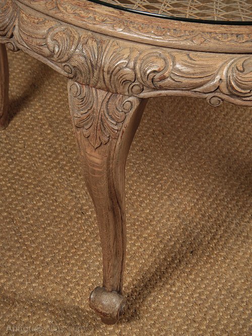 Oak and bergere coffee table c.1930. Begere or canework top with a carved medallion at the centre all under glass. Pale carved oak frame with foliate and scallop carved detail. Raised on slim shaped legs with a scrolling foot. Very good condition.