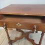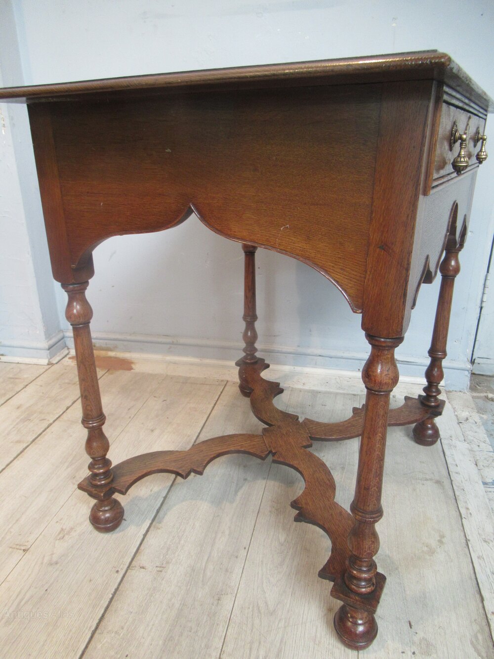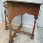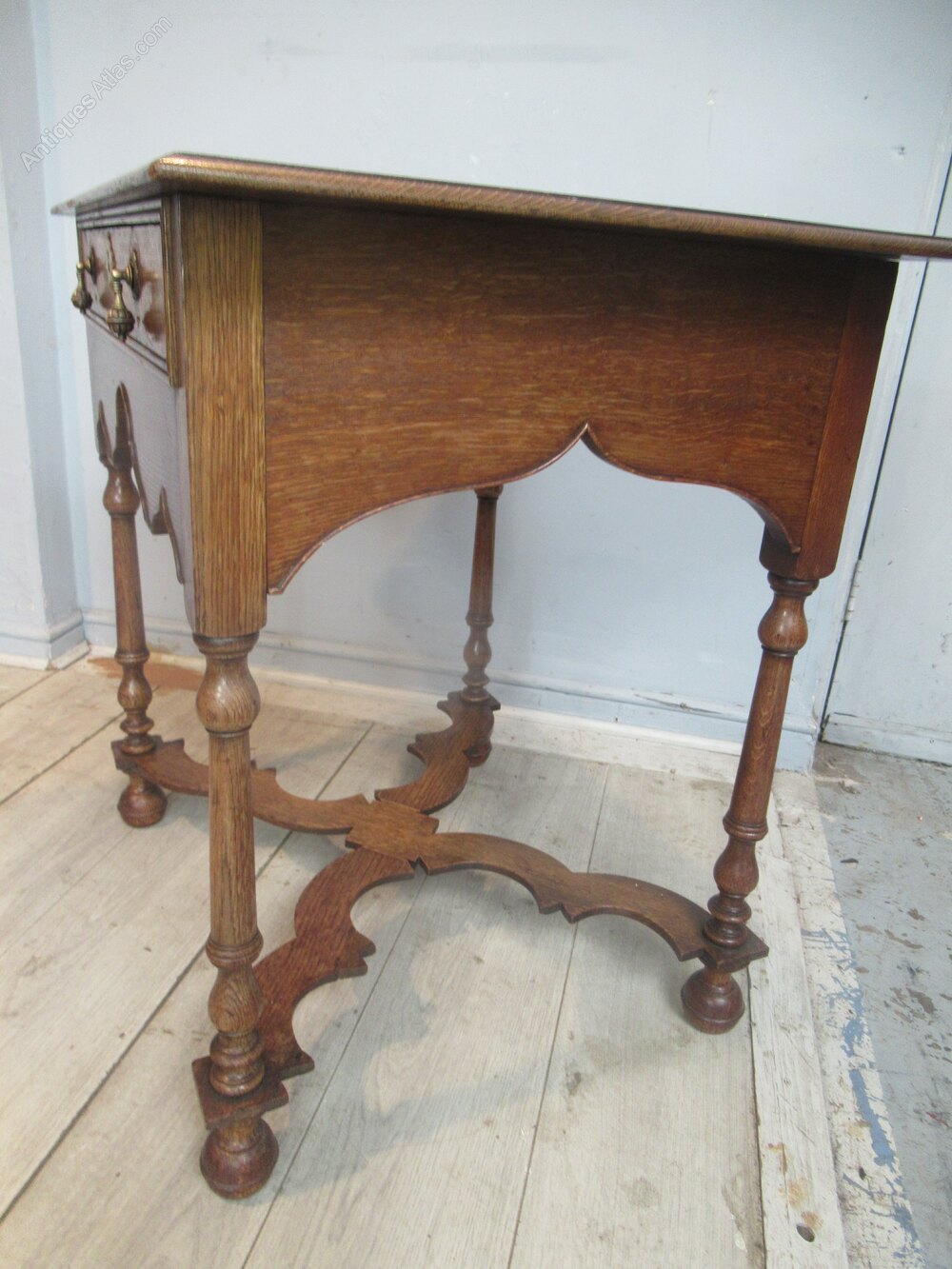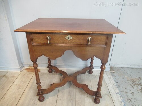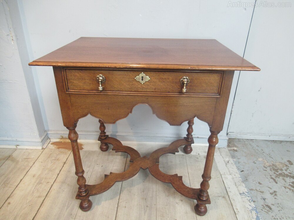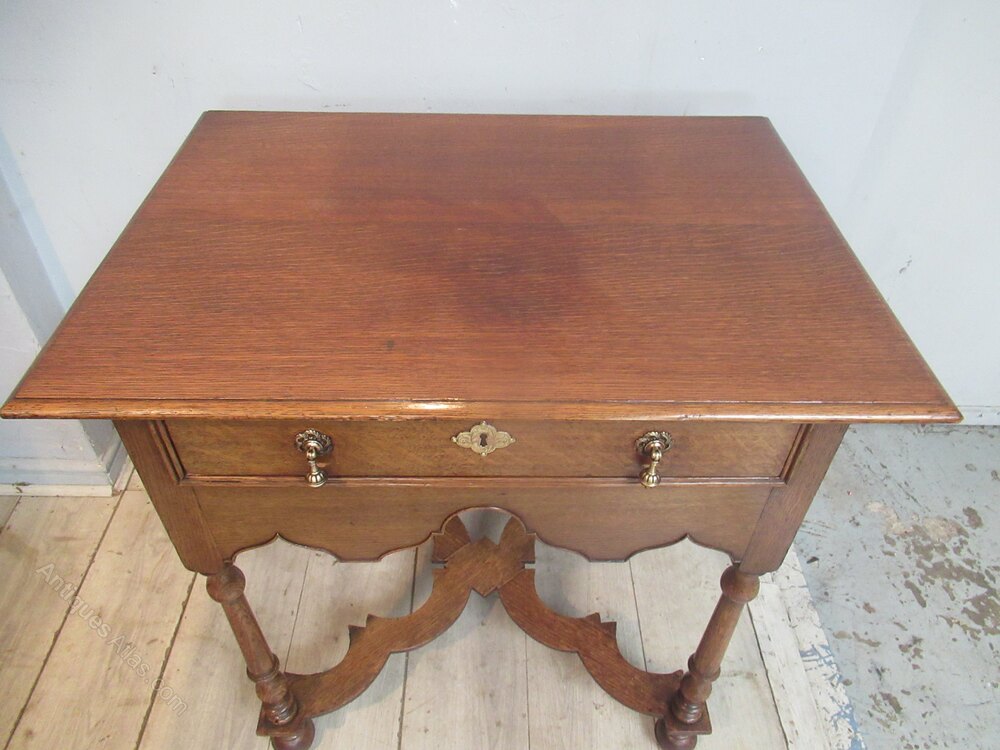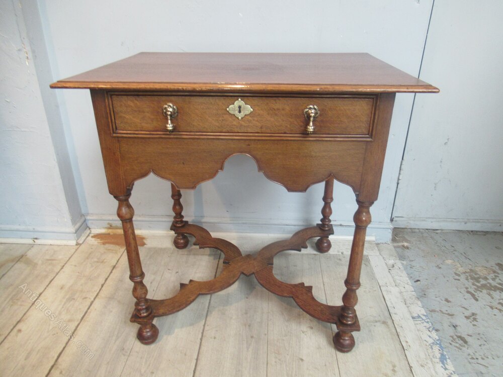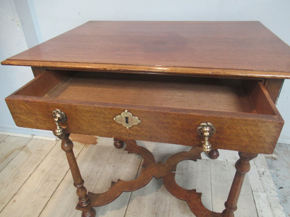 Oak side table in the William and Mary style , dating from around 1910. With a plain top , long drawer with brass handles. Standing on turned legs with ball feet and a cross form flat stretcher.