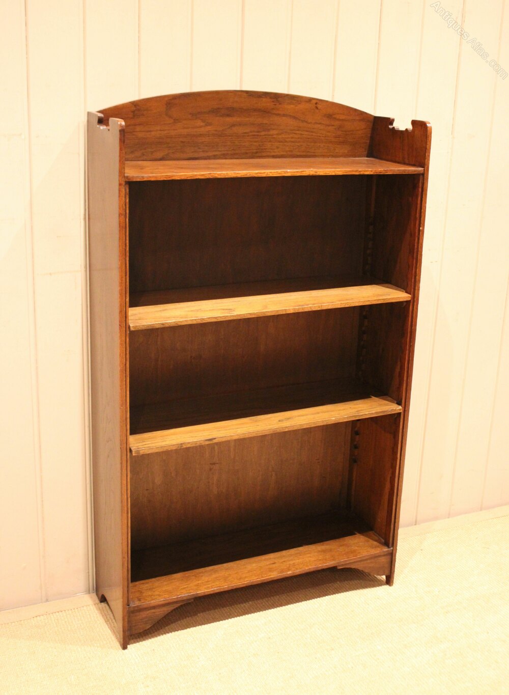 Oak arch top open bookcase having shaped sides with two adjustable shelves , raised on bracket feet .