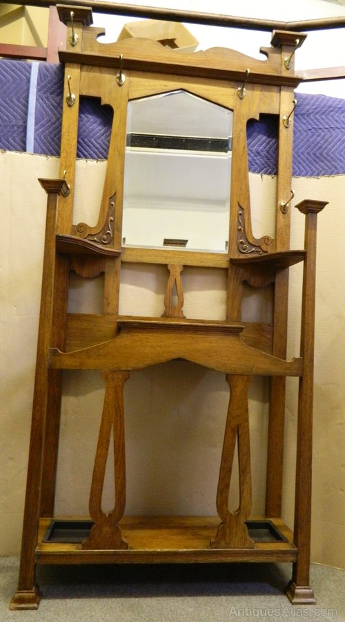 The back with shaped bevel edged mirror in stylised carved surround with two small shelves below, lidded storage compartment, umbrella / stick stands to either side with drip trays fitted below.