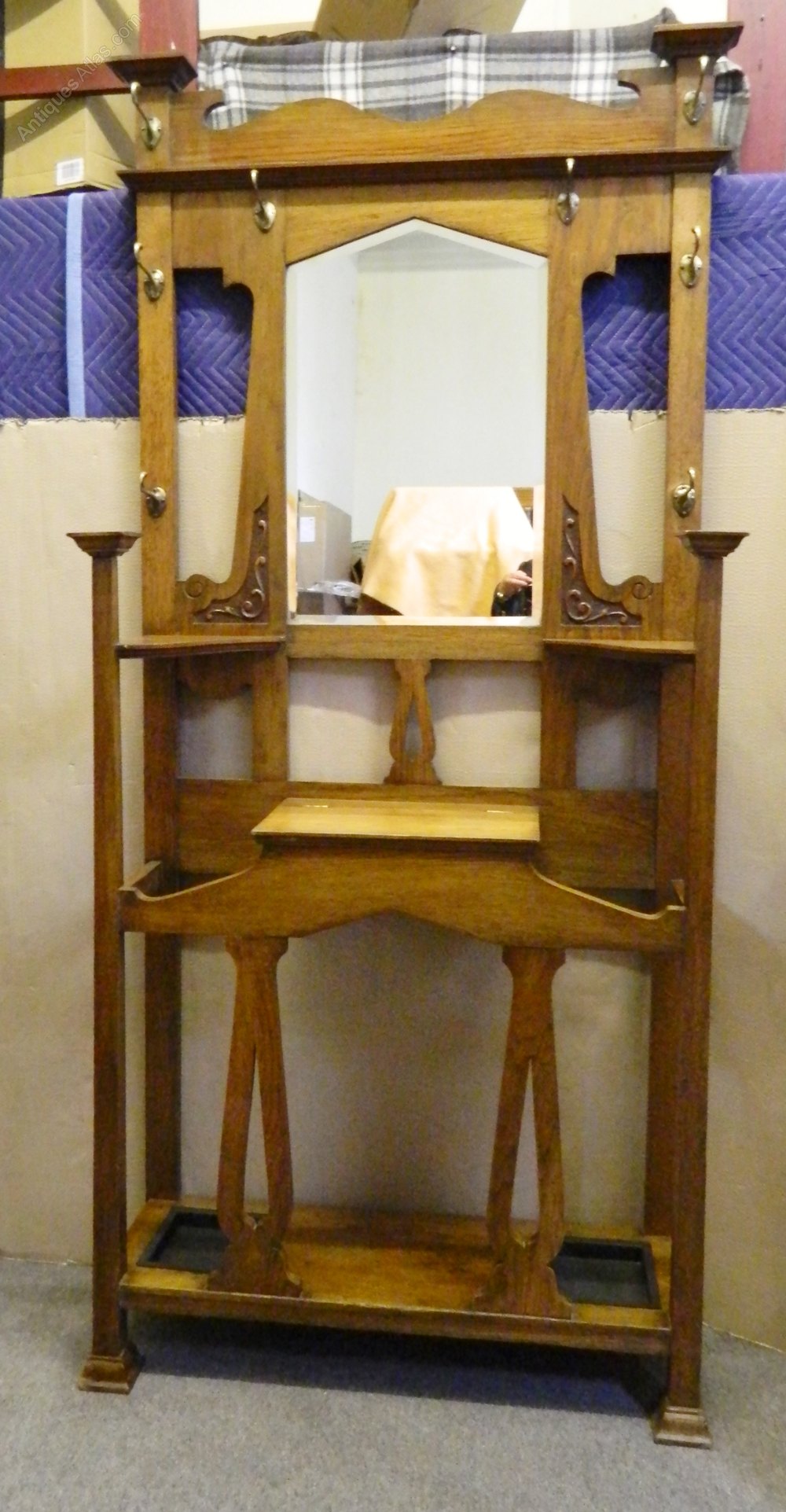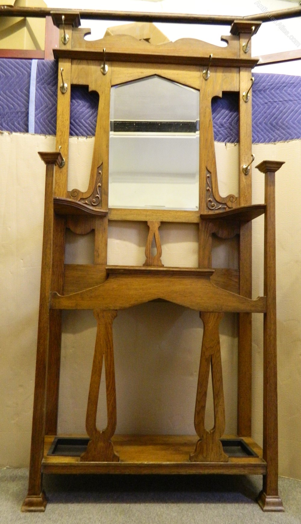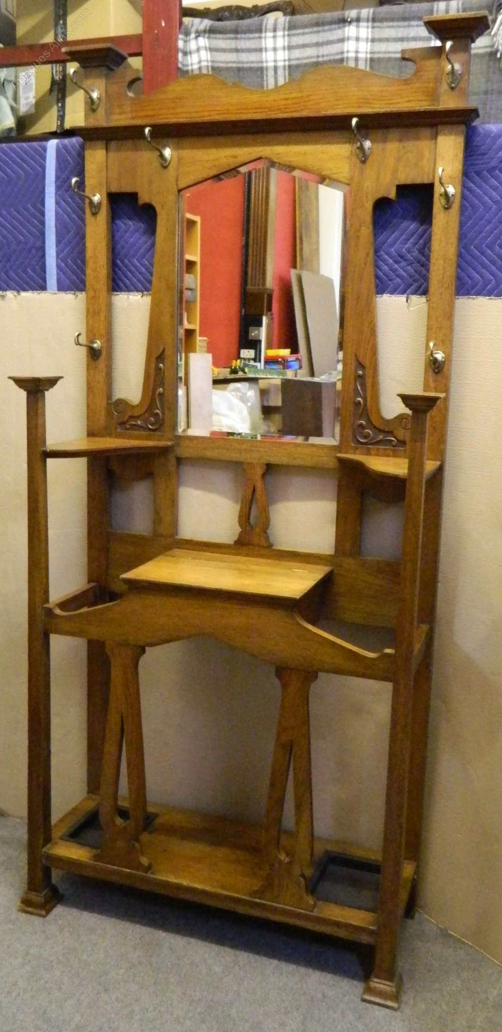 with normal marks / scuffs commensurate with age and use, this charming hall stand is a lovely example of arts & crafts design in a warm golden oak and really is not done justice by the photographs.