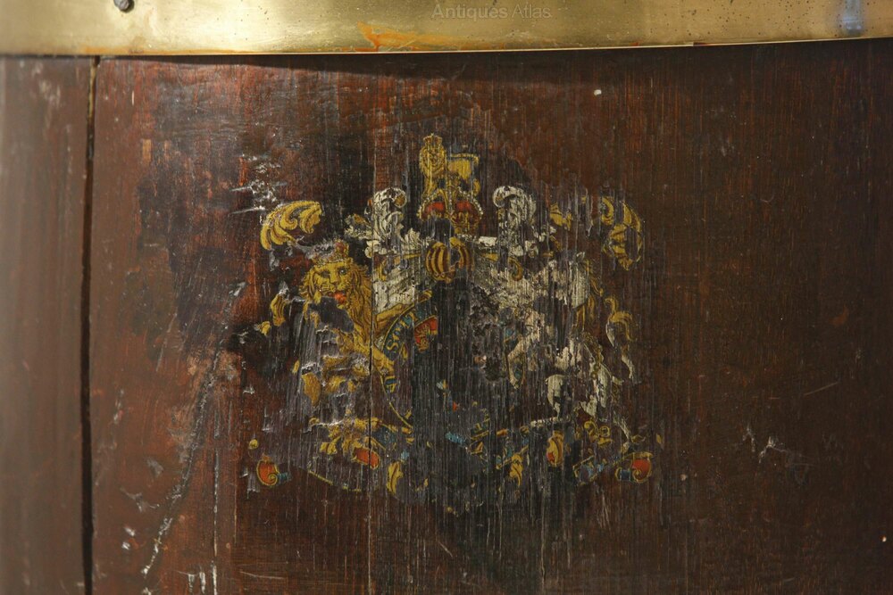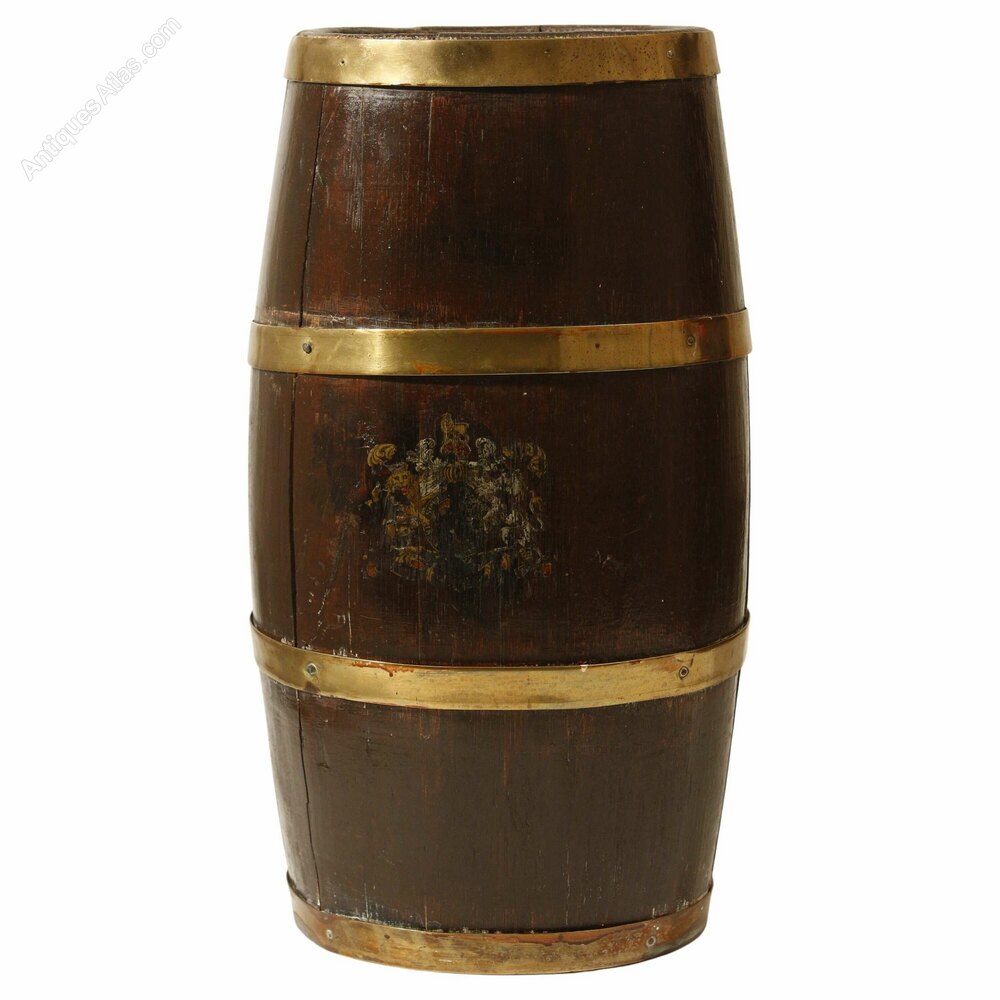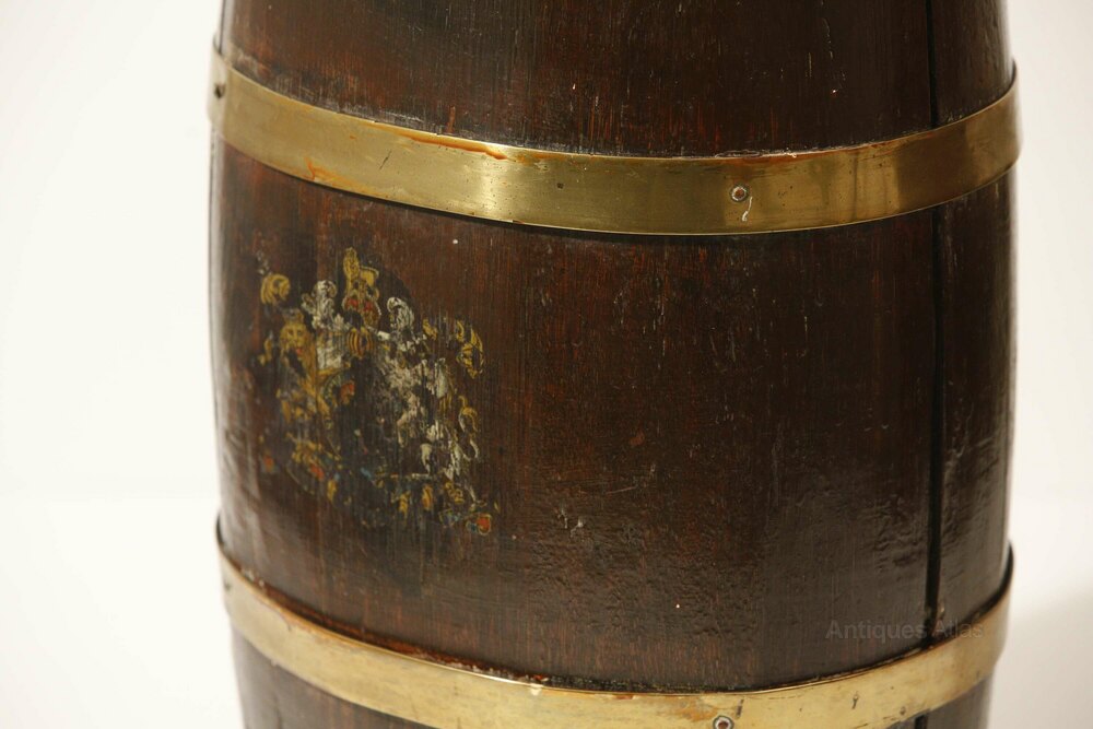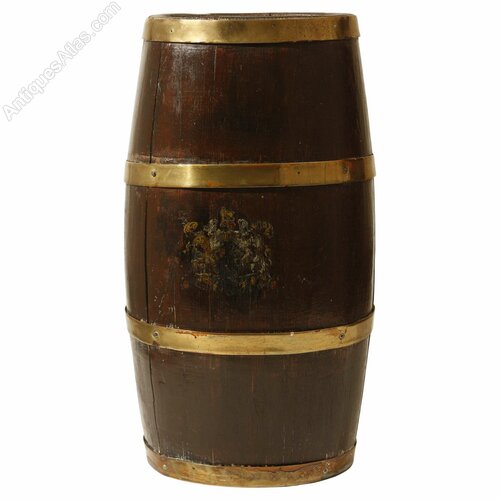 Oak Barrel Umbrella Stand with Brass Braces English Coat of Arms 19th Century