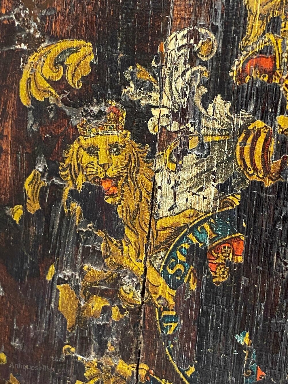 Adorned with faded remnants and traces of a polychrome décor coat of arms.