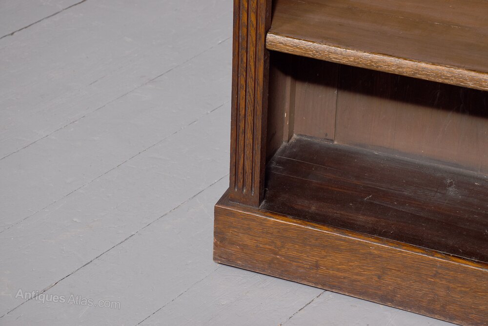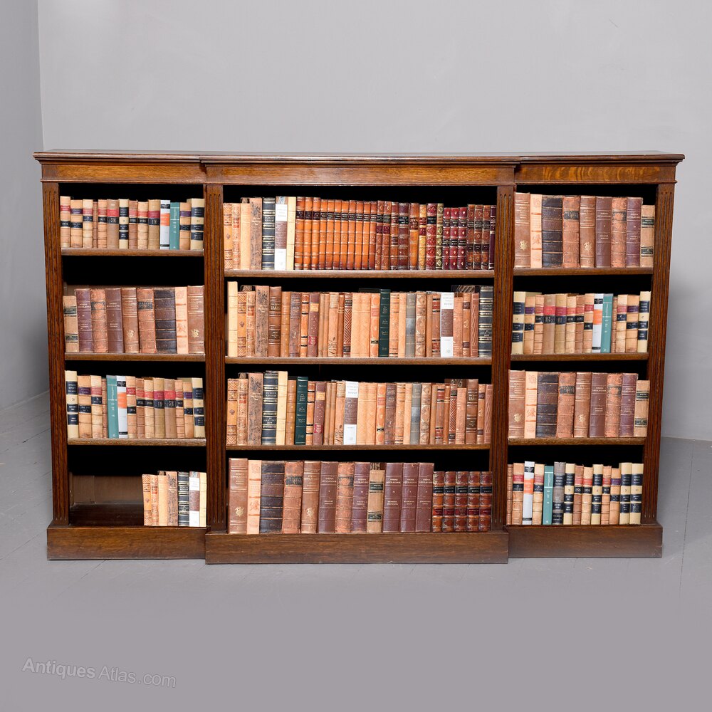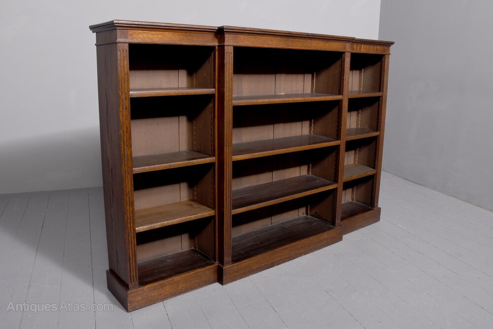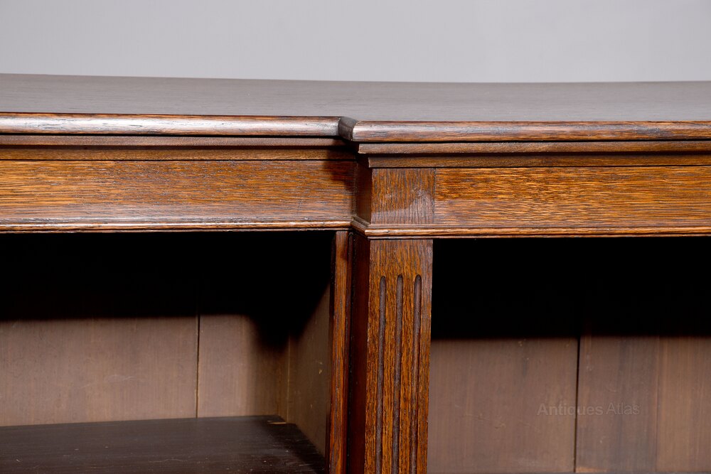 Circa 1900. A neat size original late Victorian oak breakfront open, floor standing bookcase, the solid top with nice figuring and simple rounded moulded foredge, the bead frieze with ribbed pilasters separating each of the open sections, each with three adjustable shelves with rounded facings similar to the foredge. The bookcase is resting on an enclosed plinth which follows the form of the top.