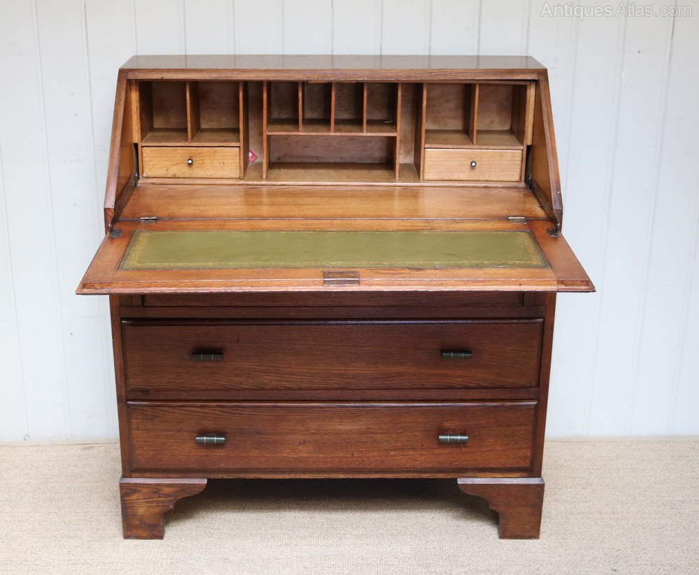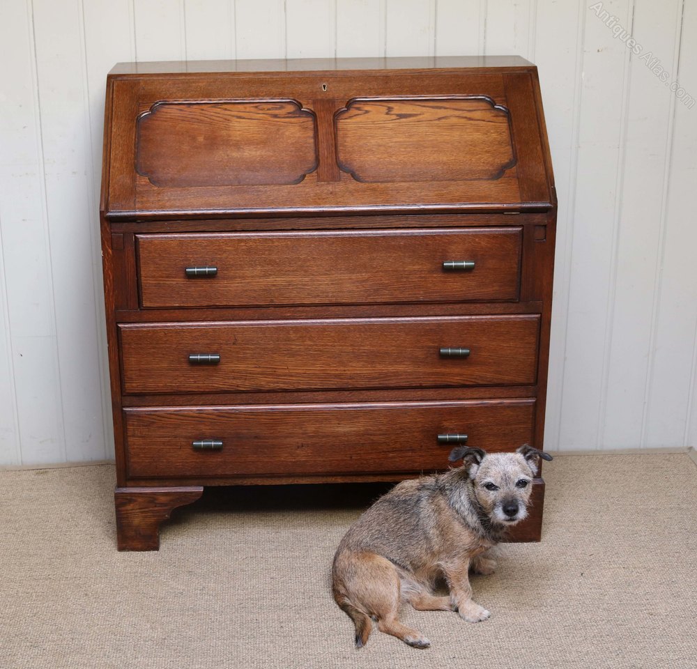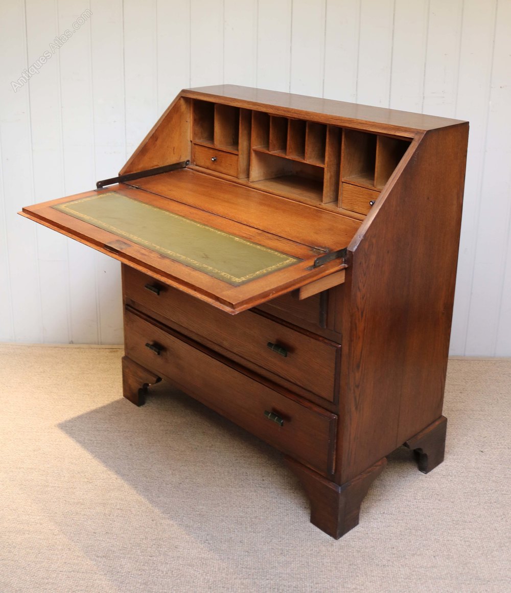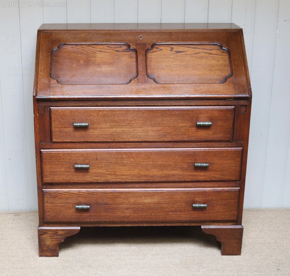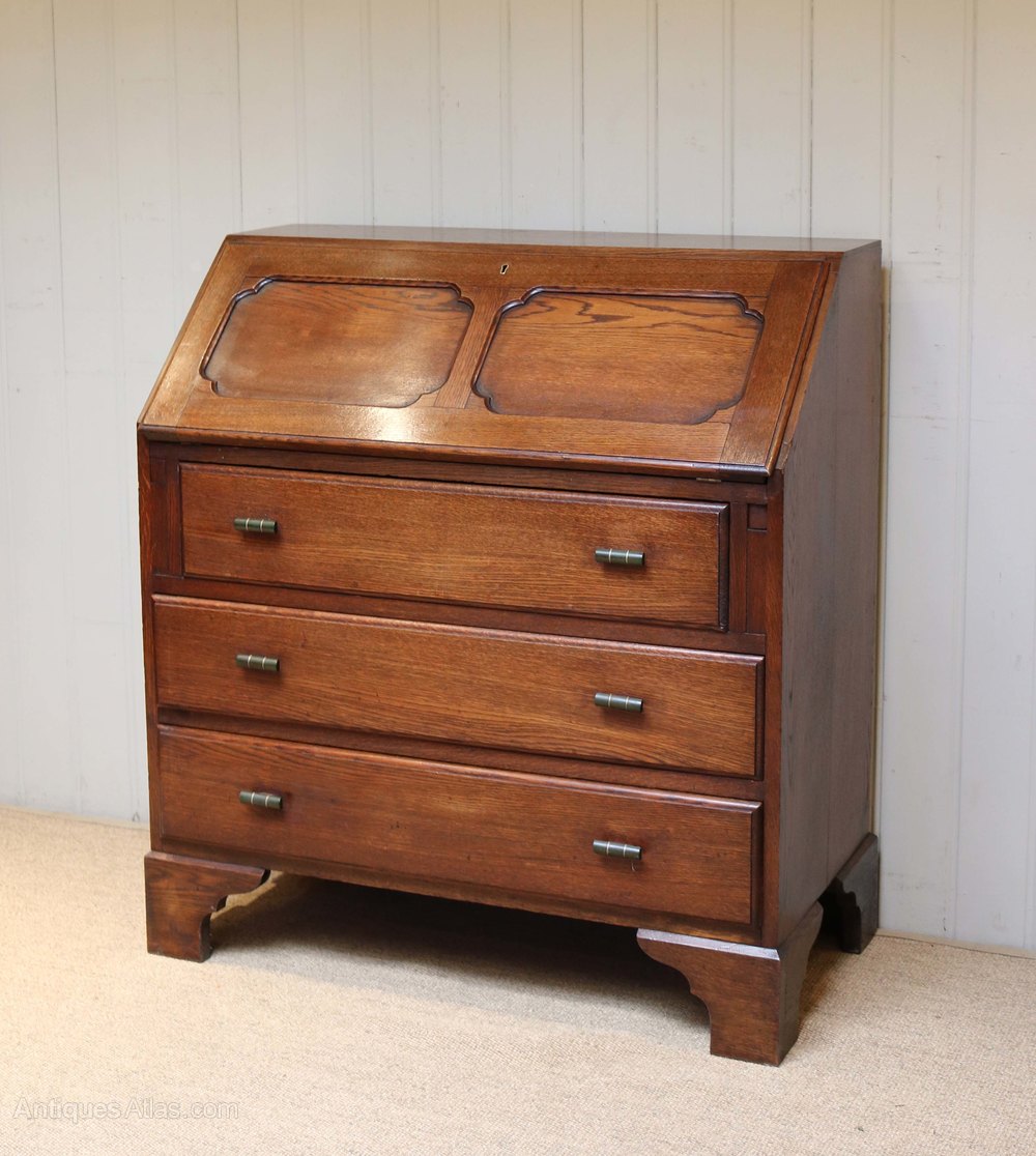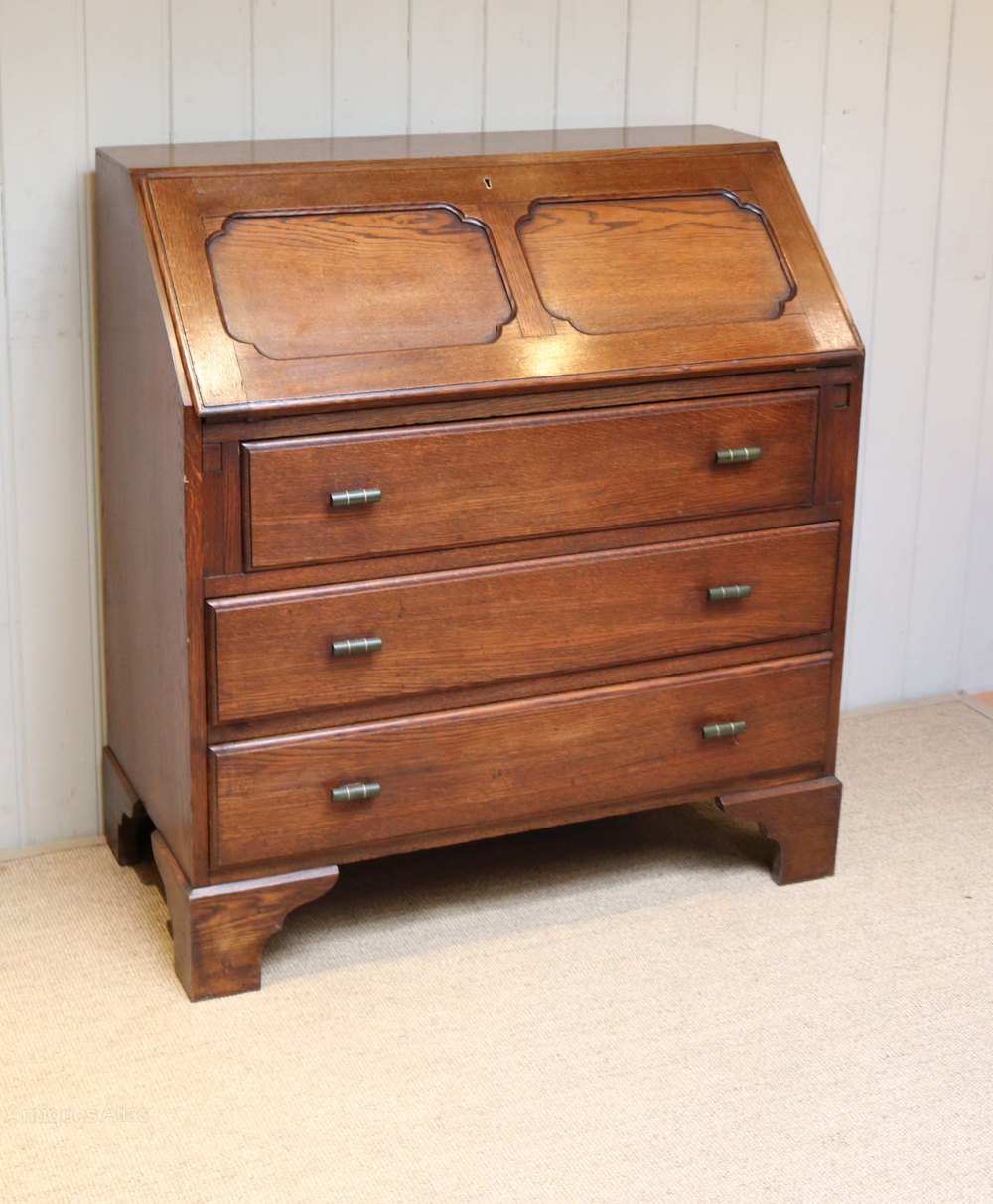 Oak bureau having three long drawers below a panelled fall front opening to reveal a fitted interior with leather scriber raised on bracket feet