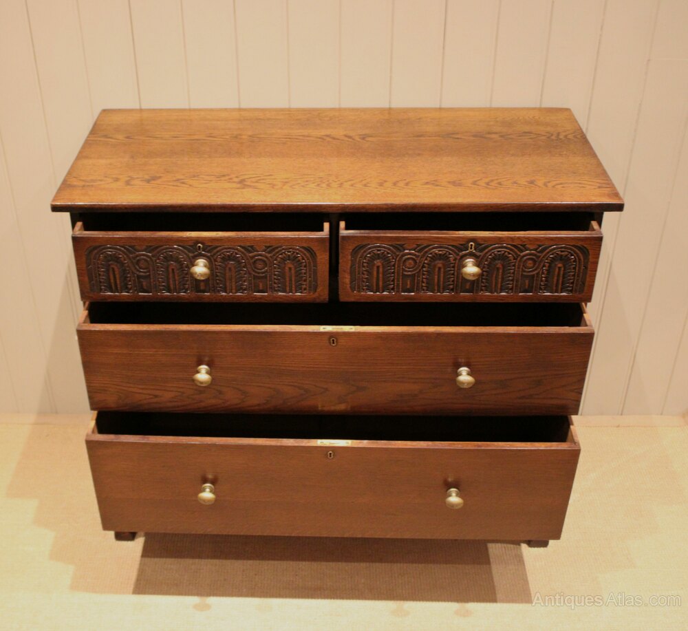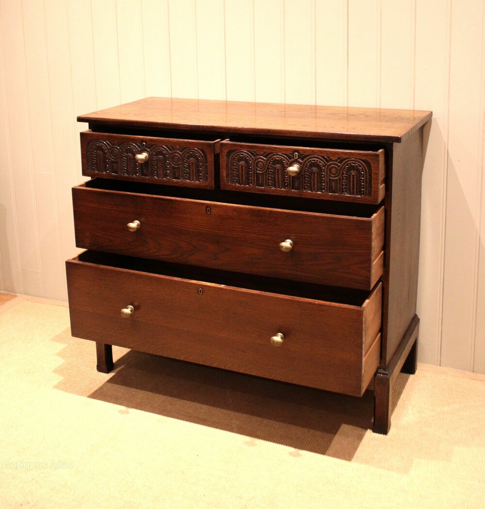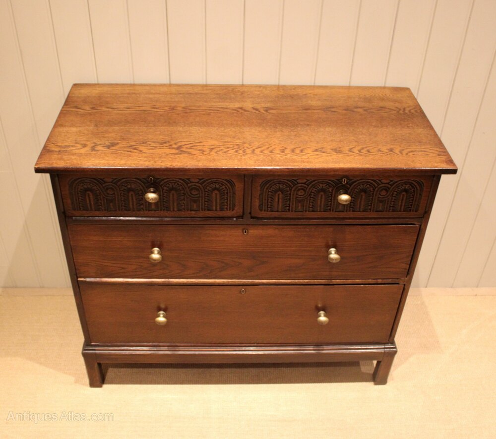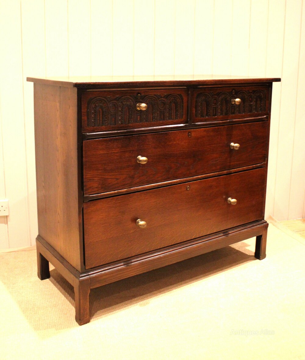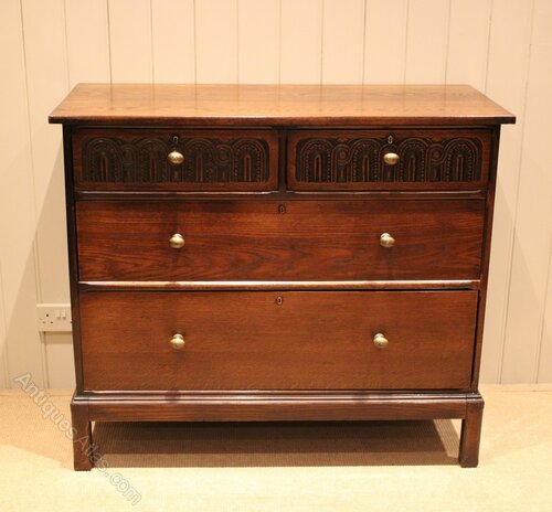 Oak chest having two short and two long drawers , having carved detail to the top two , raised on short square legs . The drawer depths are from the bottom 24.5 cm high , 17 cm high and at the top 12 cm deep .