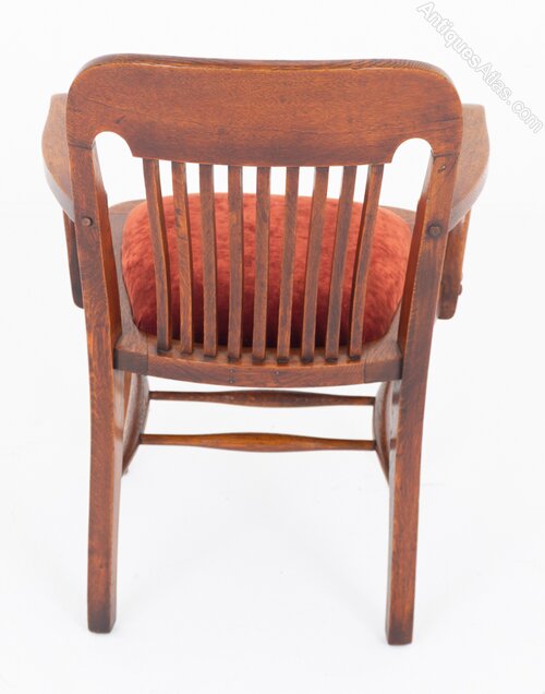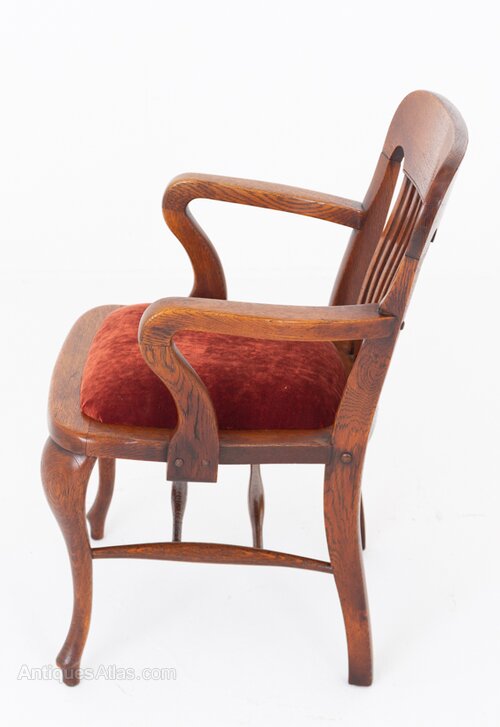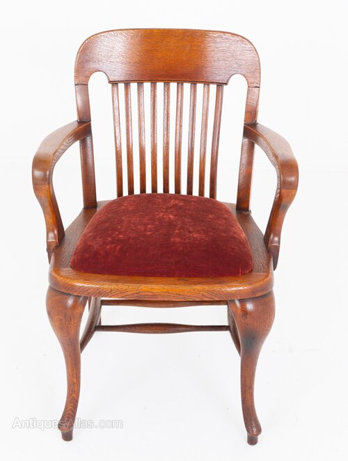 This attractive oak desk chair stands upon elegant cabriole legs fitted with castors and joined by a sturdy H-frame stretcher, providing both strength and stability.