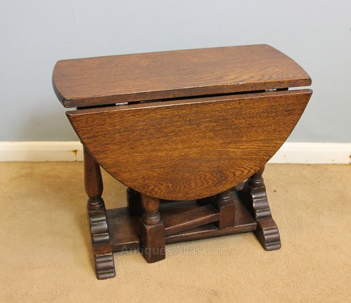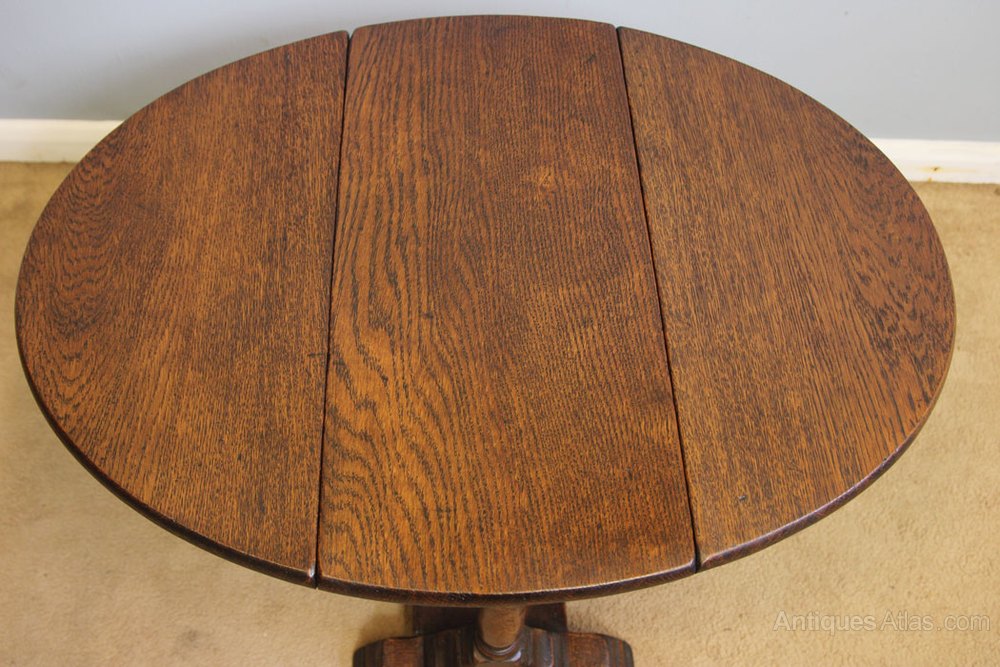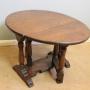 Antique Oak Drop Leaf Occasional Table. This solid oak oval drop leaf occasional / lamp / side / coffee table has a oval top supported by turned legs and stretchers and shaped feet.
