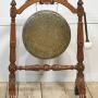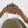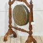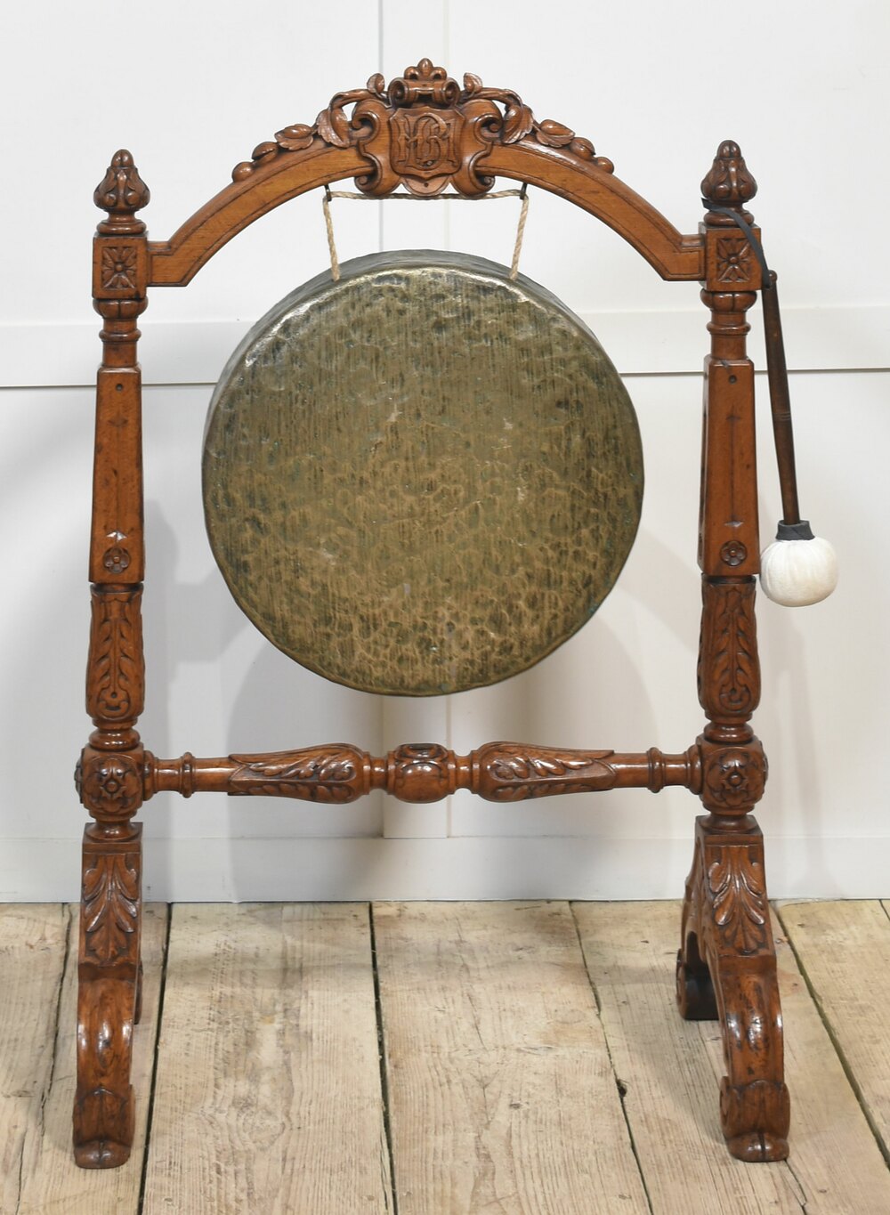 Oak-framed floor-standing diner gong and beater, the carved crest flanked by turned finials raised on carved pillars and turned stretcher below. Raised on scrolling legs.