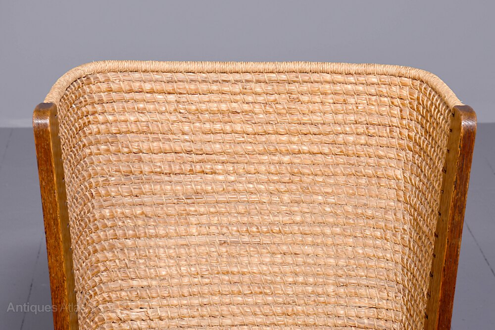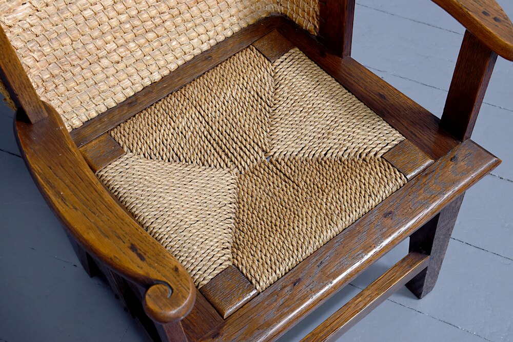 Circa 1950s, oak framed Orkney chair, likely by Kirkness. With a hand woven straw back, and top rail finished in marram grass with an oak framed and rattan weave seat. The chair follows the form by Kirkness, with arms and back screwed to the main body of the chair with brass screws, and shaped arms with small scrolling end. The uprights are in quarter sawn oak and the legs are united by simple square stretchers.