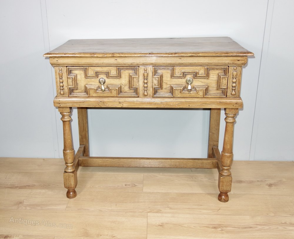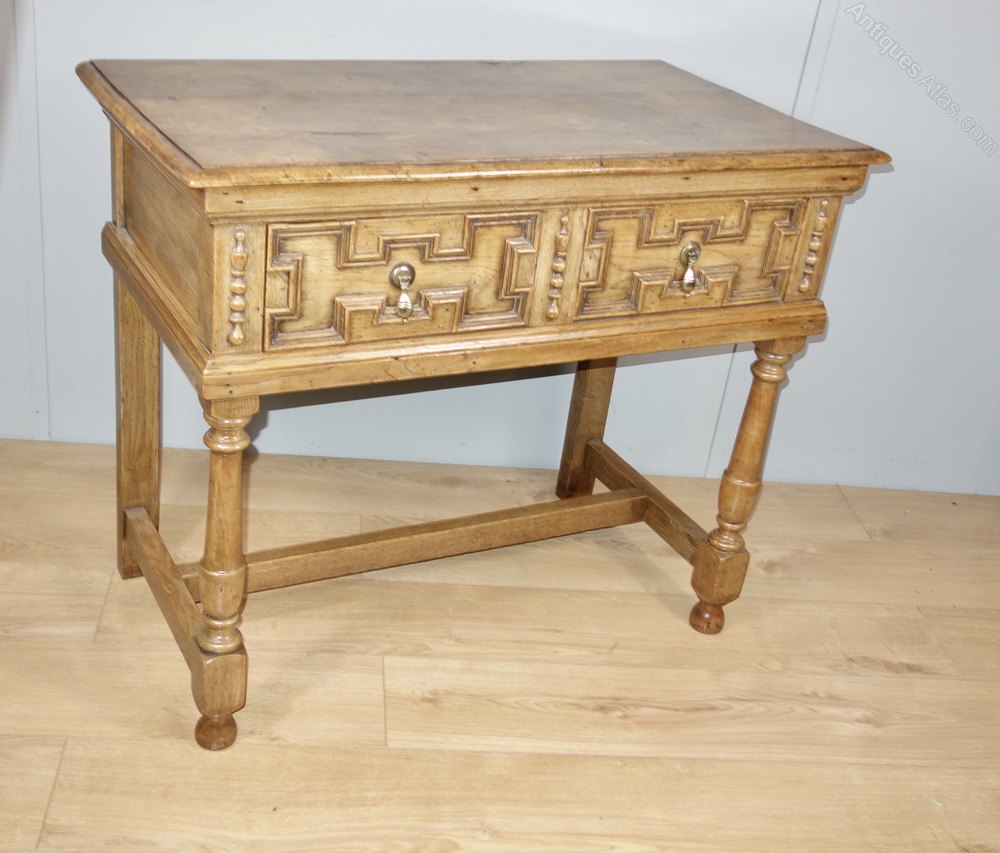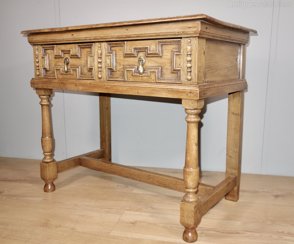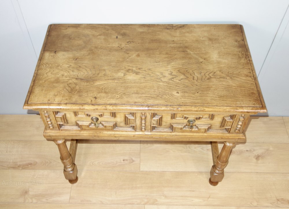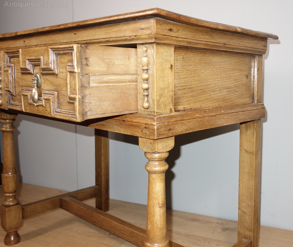 An attractive oak table with one drawer, circa 1910. Constructed in the 17th century style, it has a wonderful colour and patina, the timber is heavy quality with a beautiful grain. Of solid construction and with geometric mouldings on the drawer fronts and good quality drawer runners.