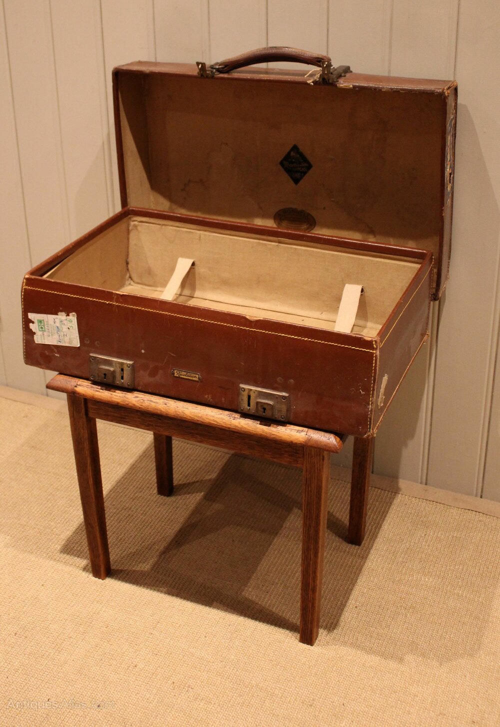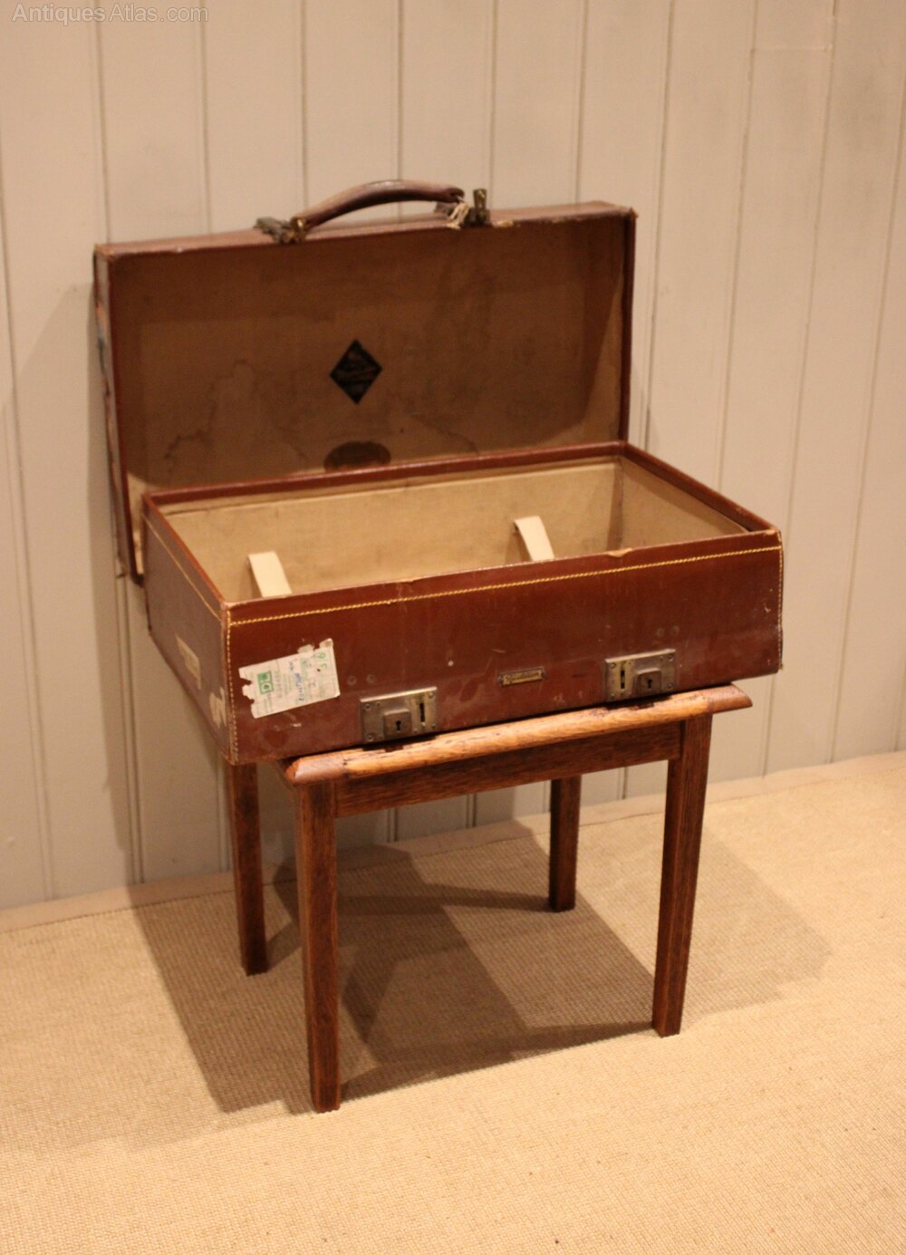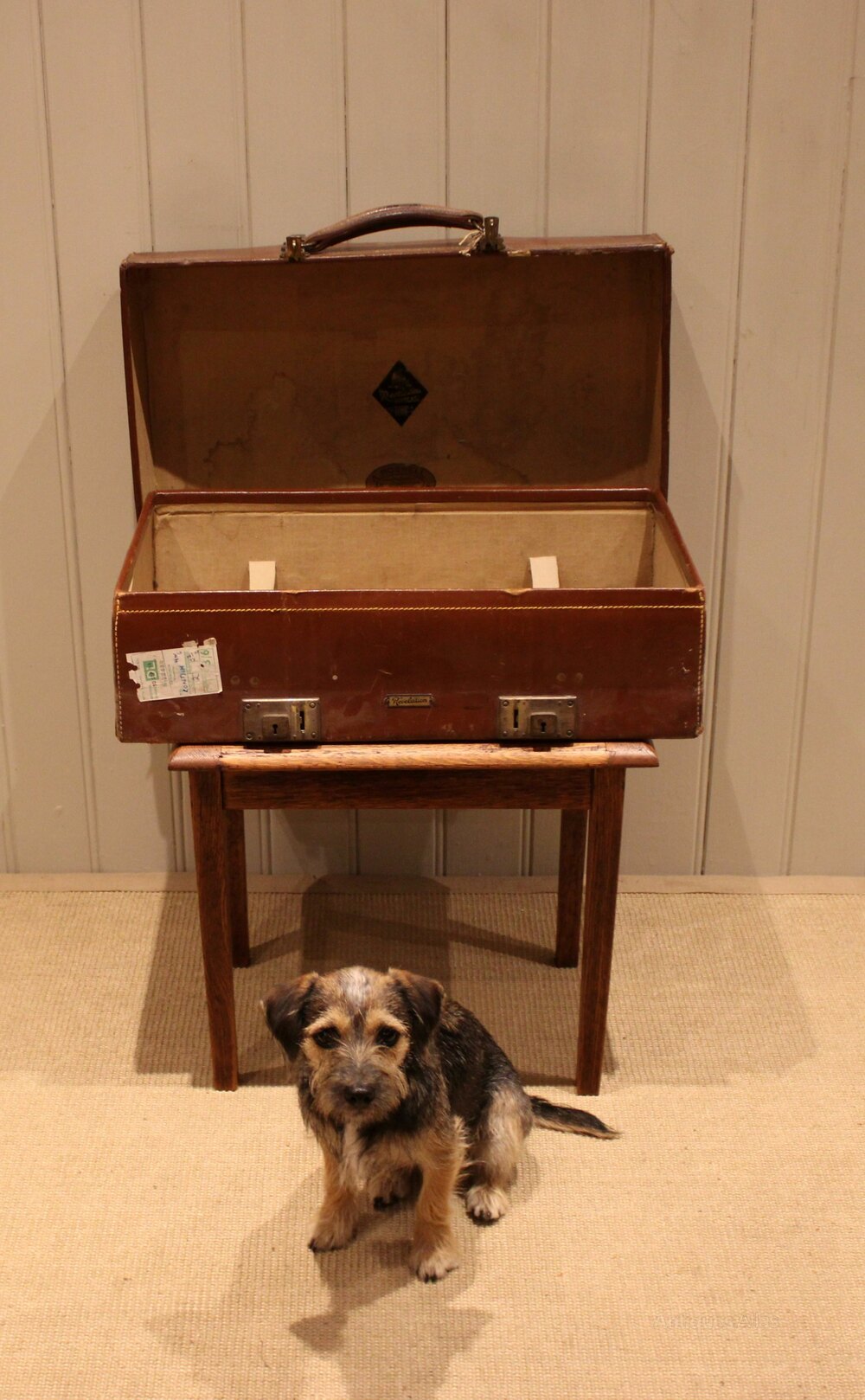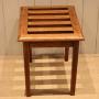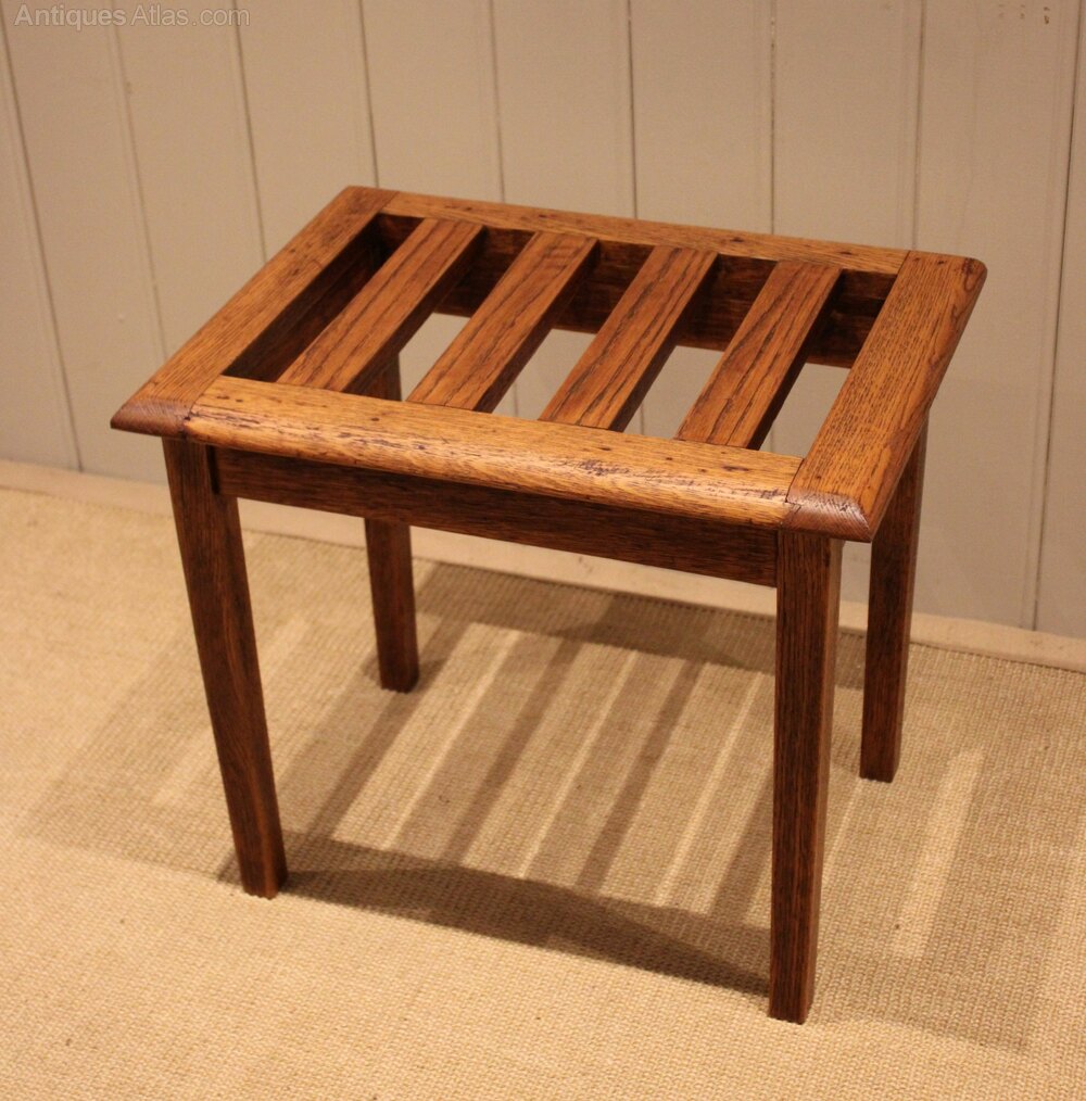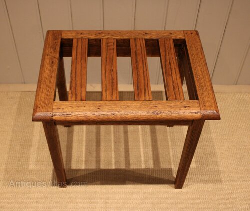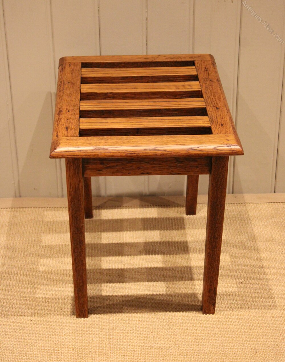 Oak luggage stand having a slated top , raised on straight tapering legs .