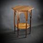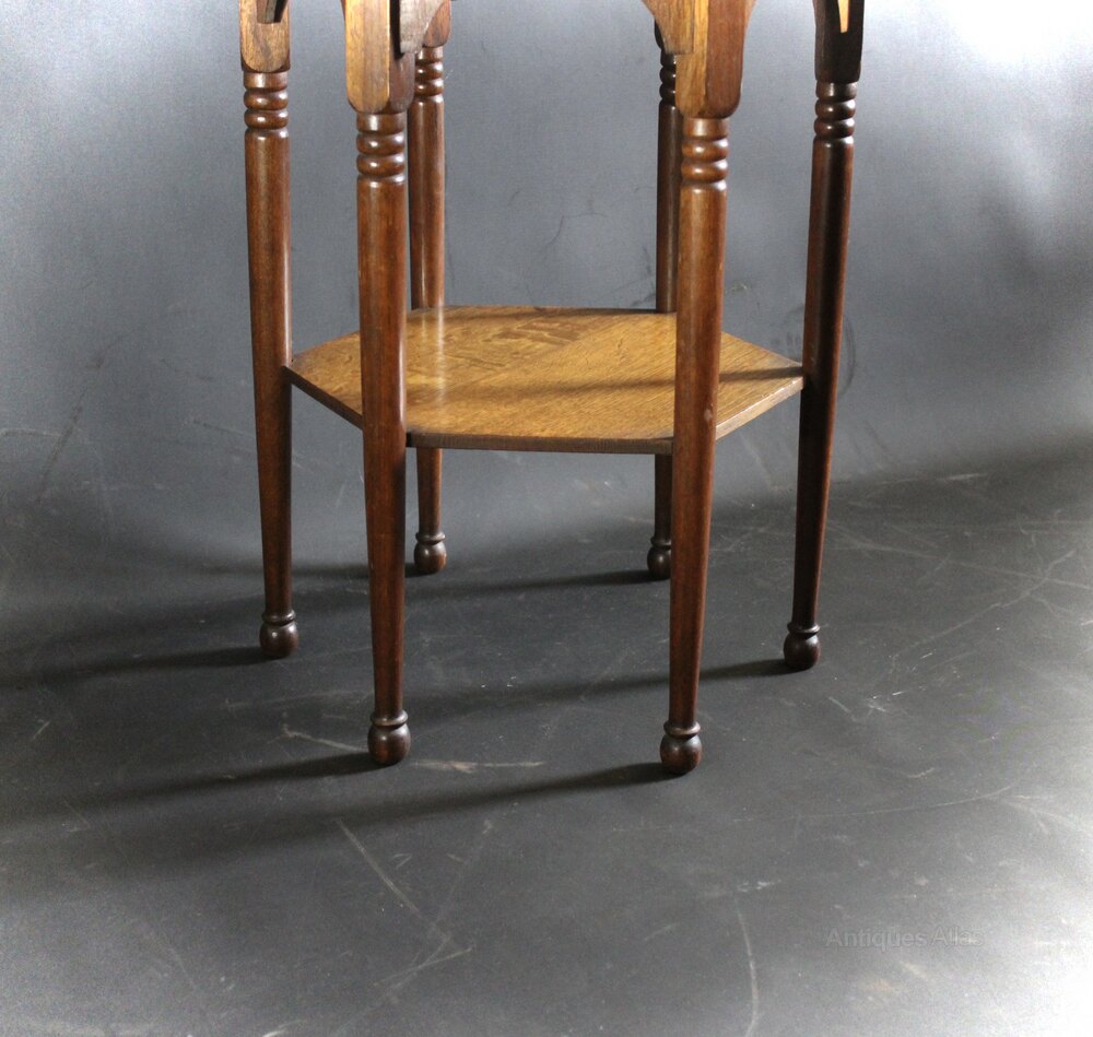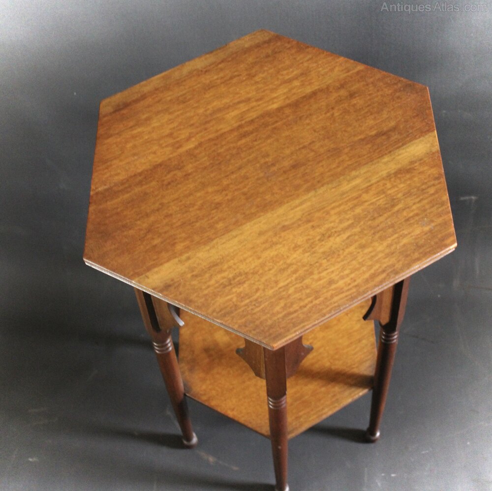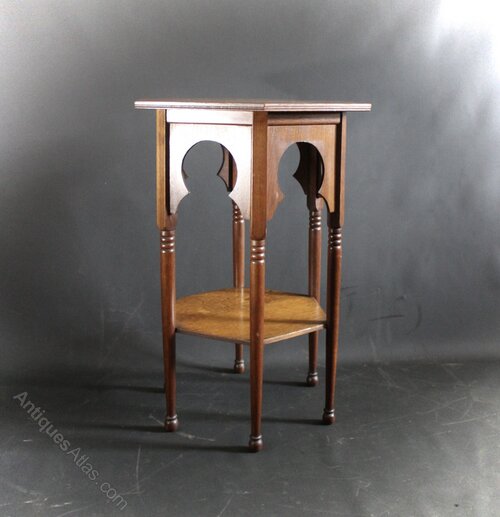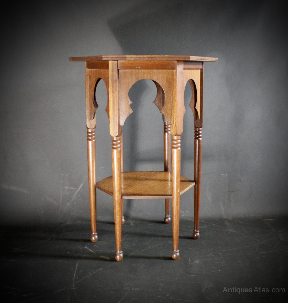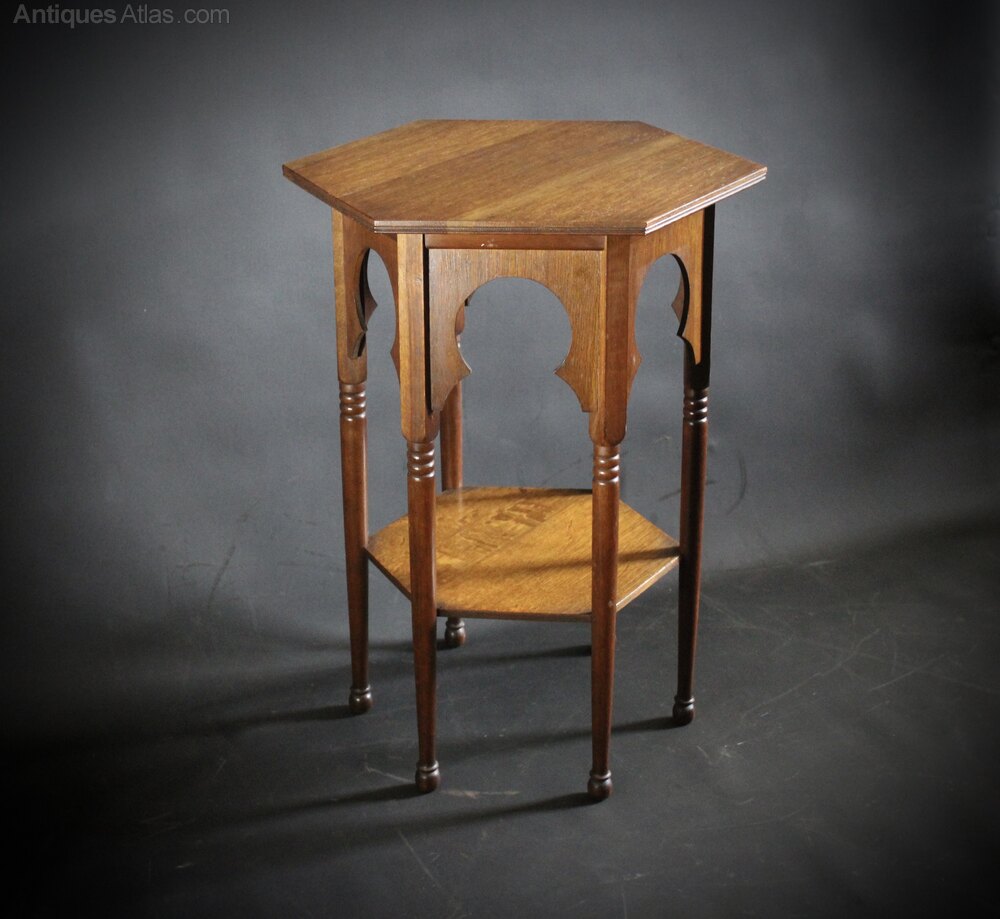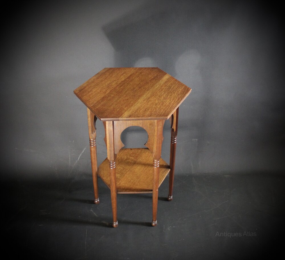 Oak arts and crafts occasional table in the Moorish style retailed by Liberty & Co. Hexagonal top above Moorish cut outs and six turned legs. Offered in great condition and with the originaL finish. Measures 71.5 cm high x 47 cm x 54.5 cm