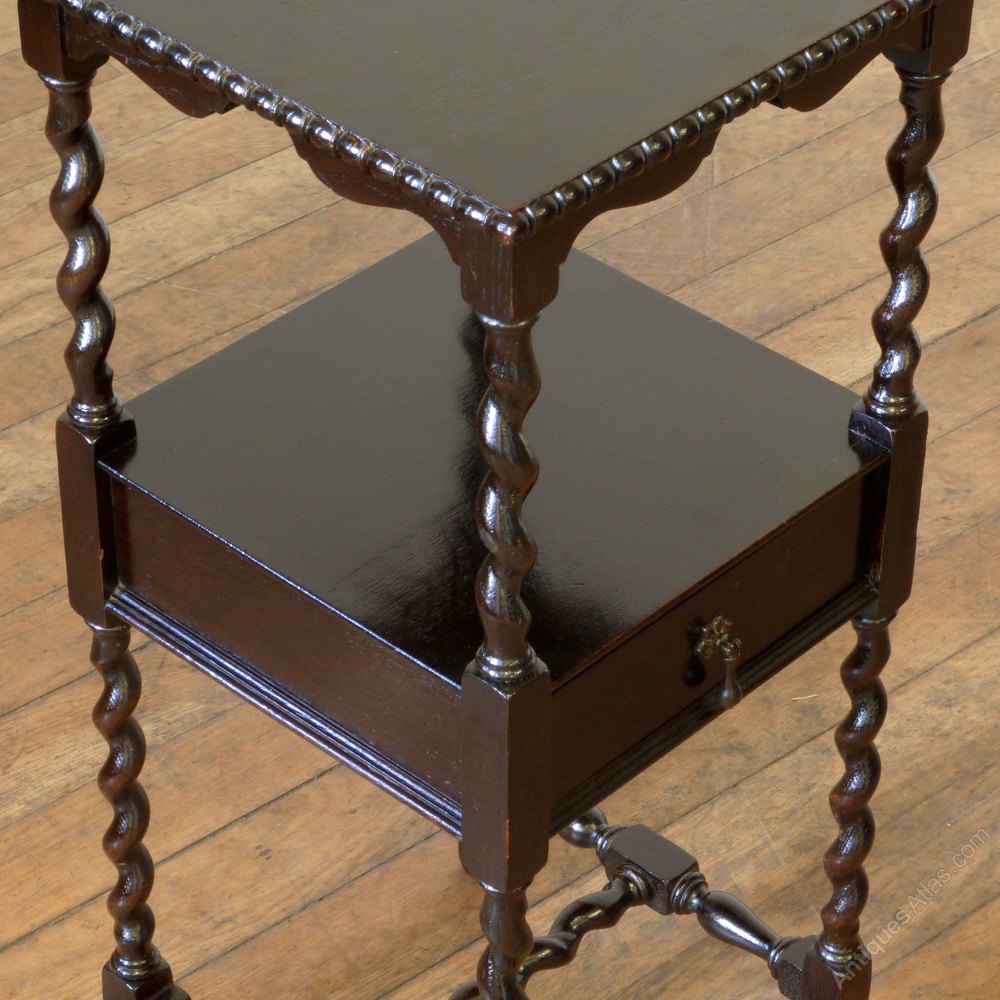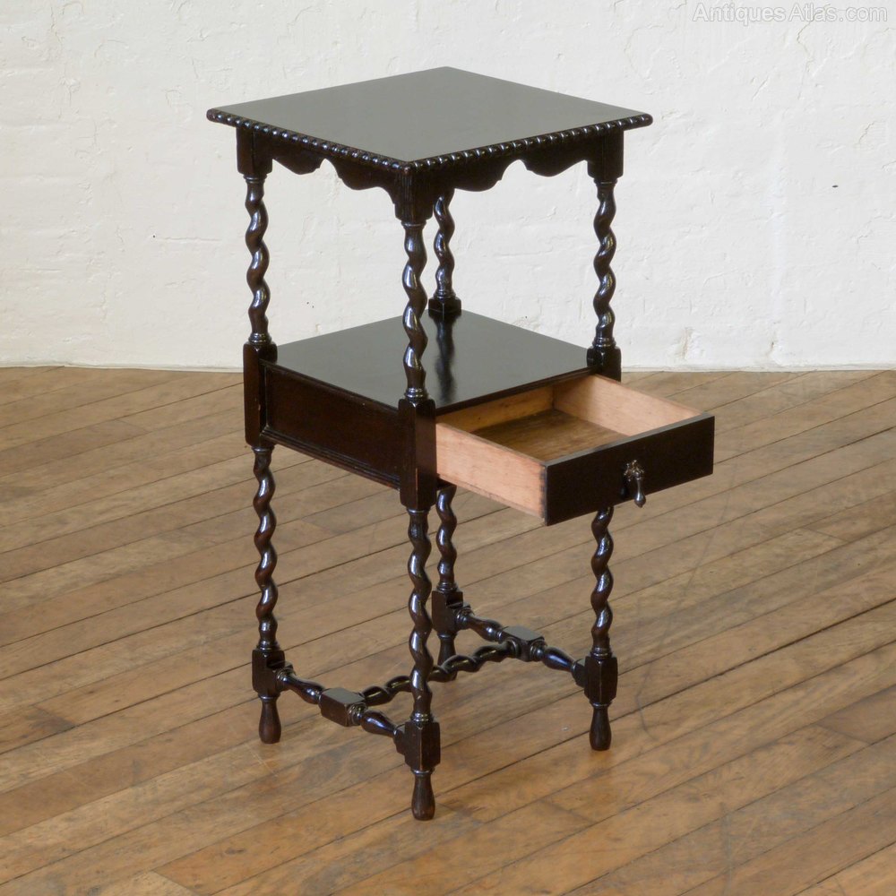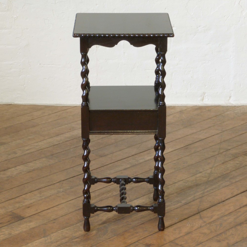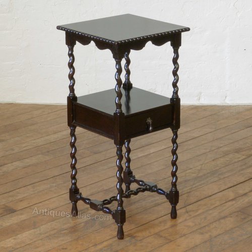 The top has an attractive split-moulded edge, above a shaped apron and twist supports to the single drawer and lower stretchers. Almost ebonized in finish and solid oak throughout, including the drawer linings and bottom. A dainty piece yet very sturdy. Condition is excellent and ready to use.