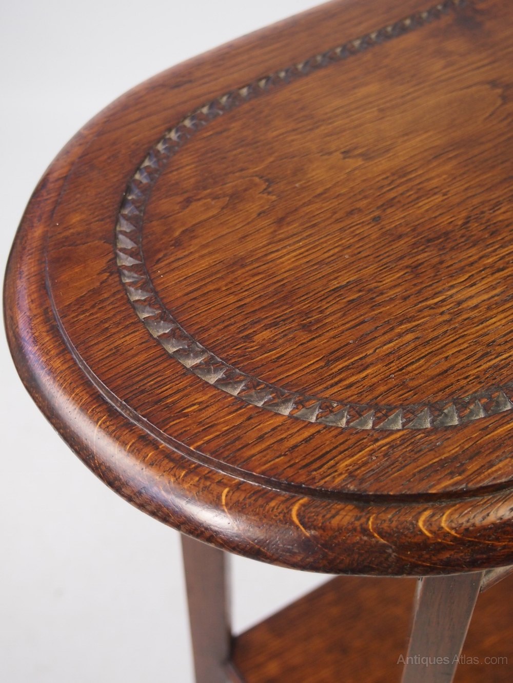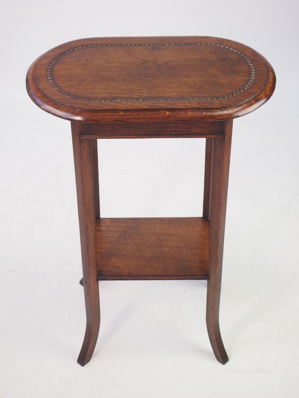 A small vintage oak occasional table / lamp table dating from circa 1920s. With rounded rectangular top on four outswept legs united by lower tier. In beautifully figured oak, with good patina to top has a chip carved style border. Solid and sturdy, a stylish occasional table.