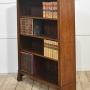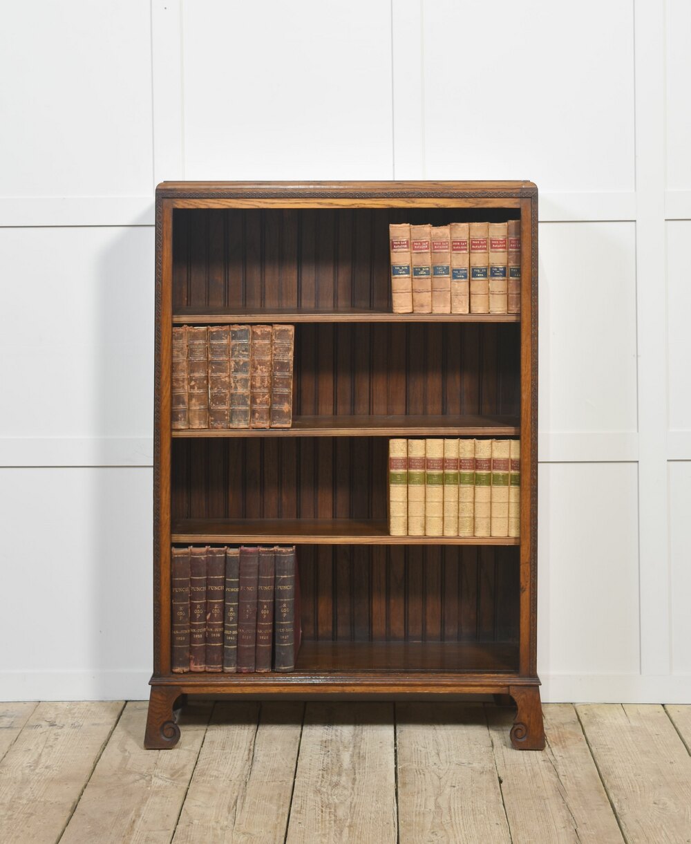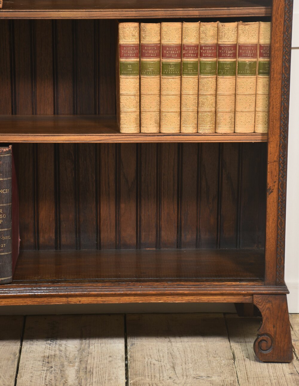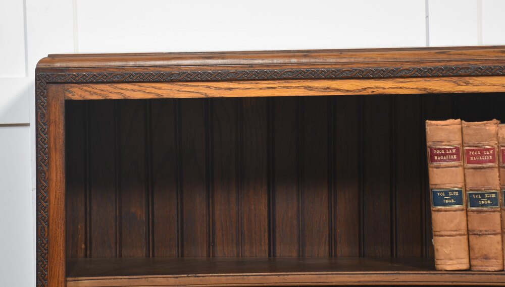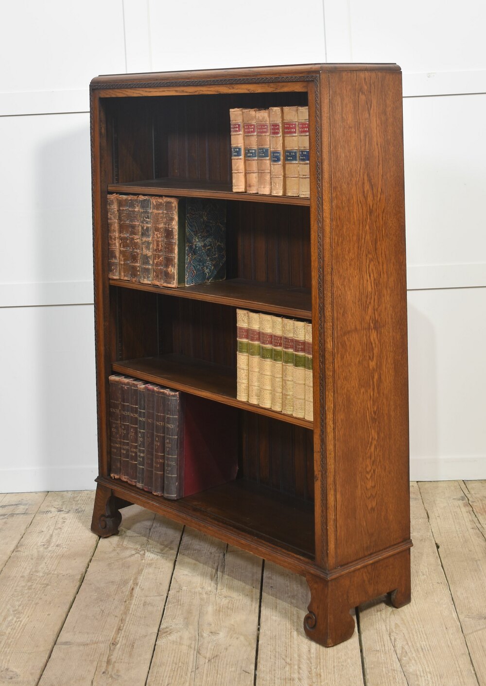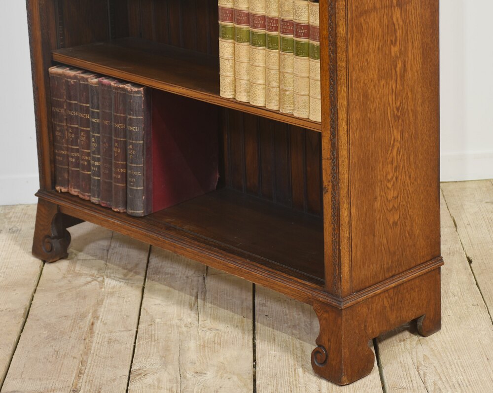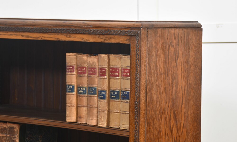 Oak open bookcase, the rectangular top with moulded edge to the carved freeze, above an adjustable shelved interior, flanked by carved columns. All raised on bracket feet.