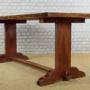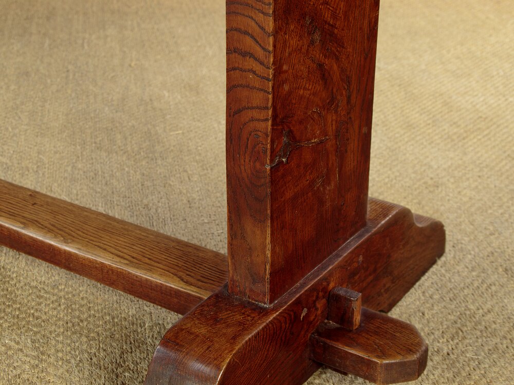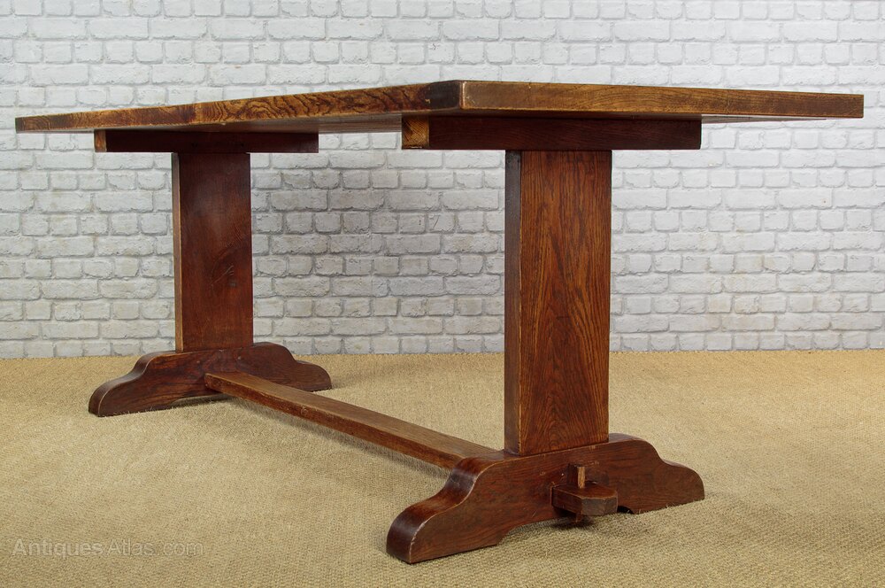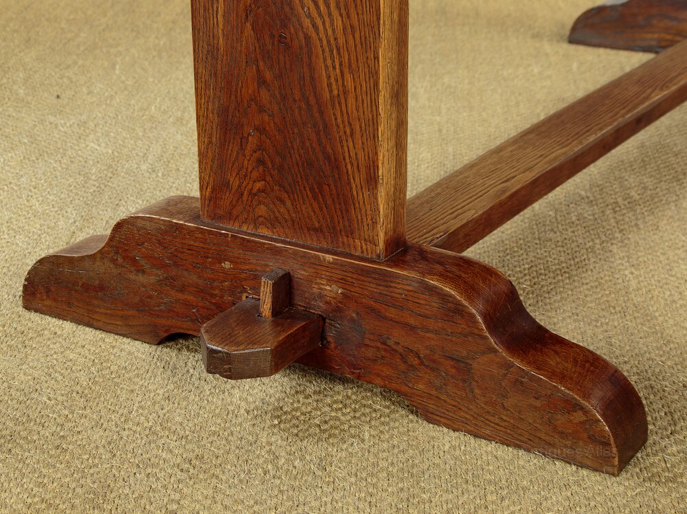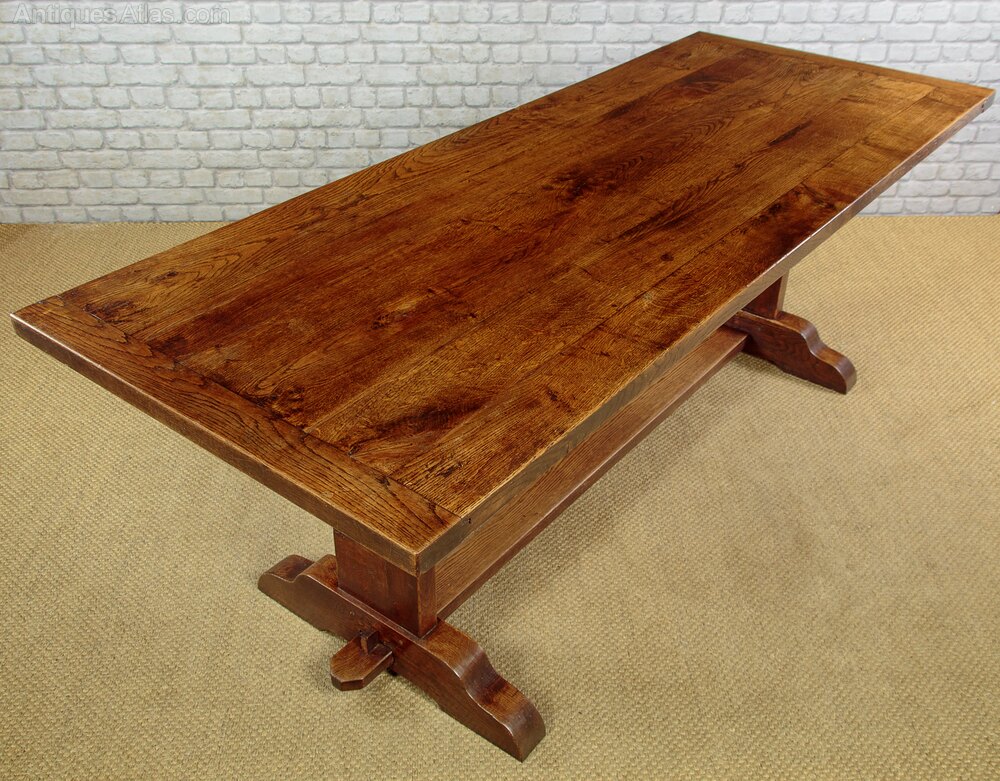 Superb oak refectory dining table c.1910. Simple design with a 79" x 31" top to seat 8, made from 1½" thick solid oak boards joined with cleated ends. Raised on nicely figured slab ends with a shaped foot. Joined with a low stretcher with a through tenon and tusk joint. Excellent colour and condition, cleaned and waxed in our workshops.