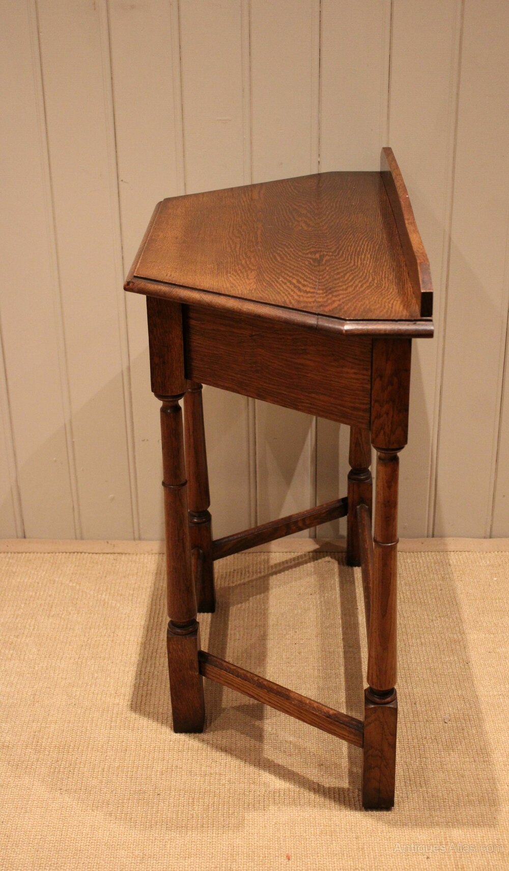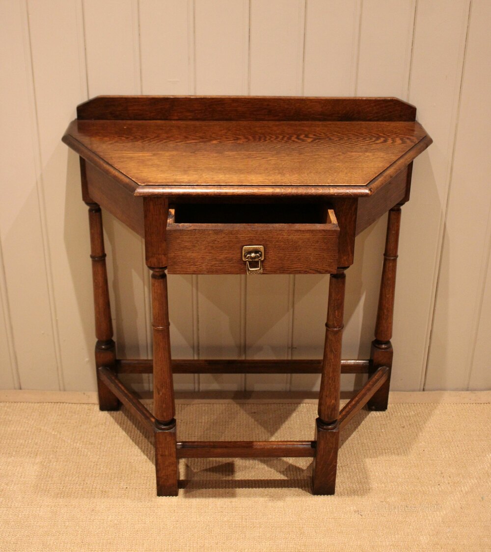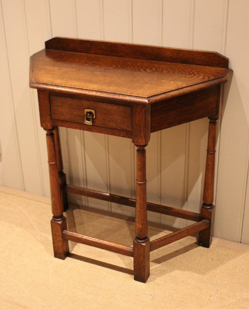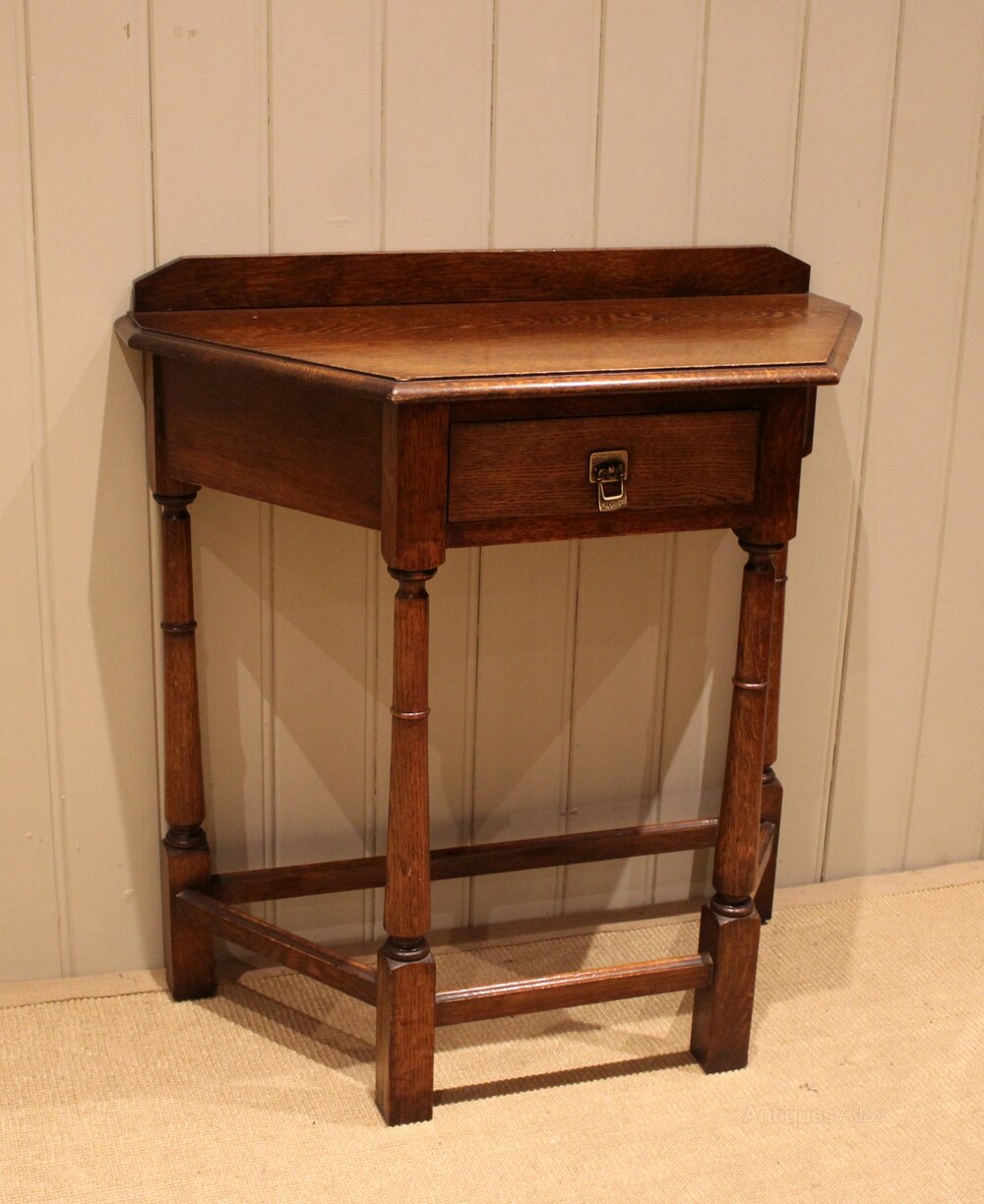 Solid oak hall table having canted corners , with a single drawer , raised on turned legs united by a stretcher.
