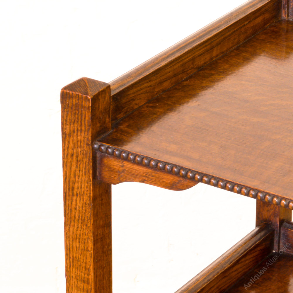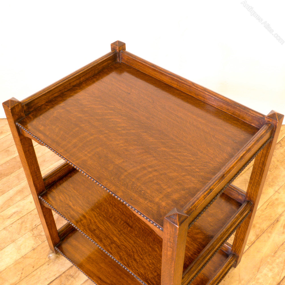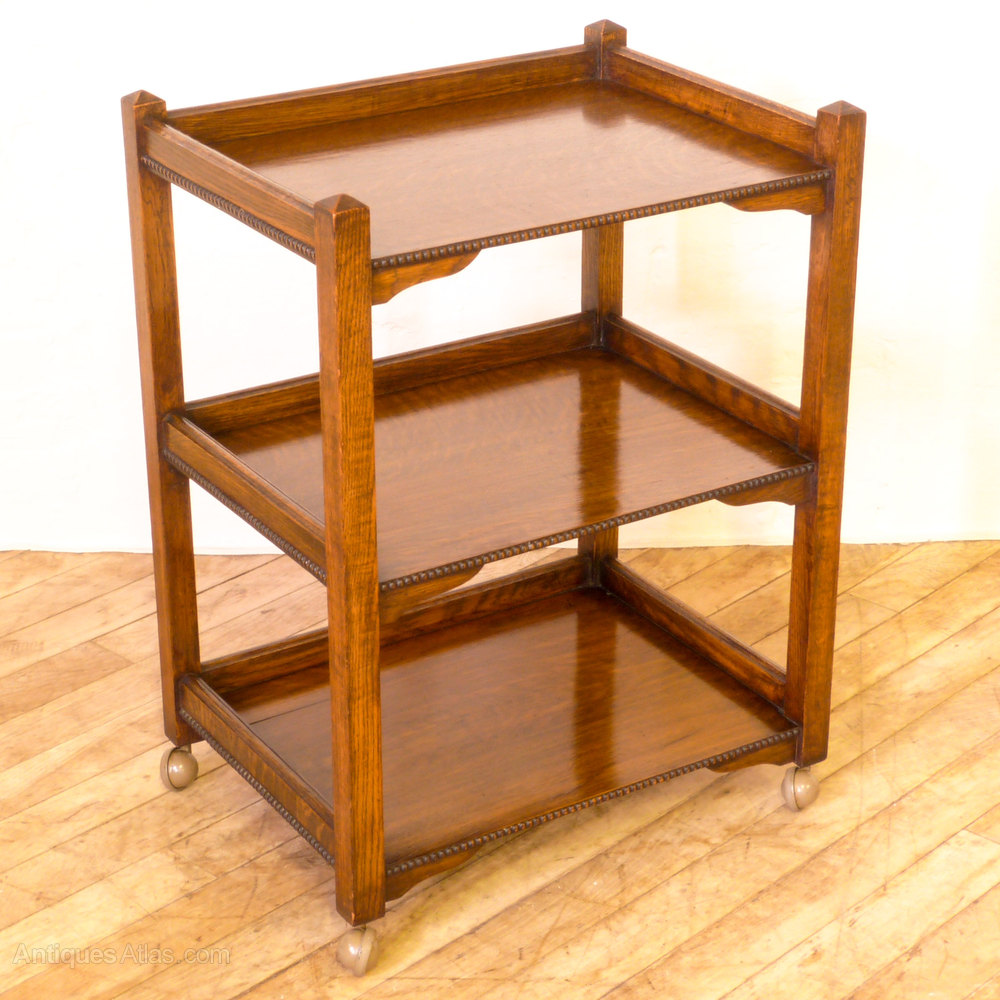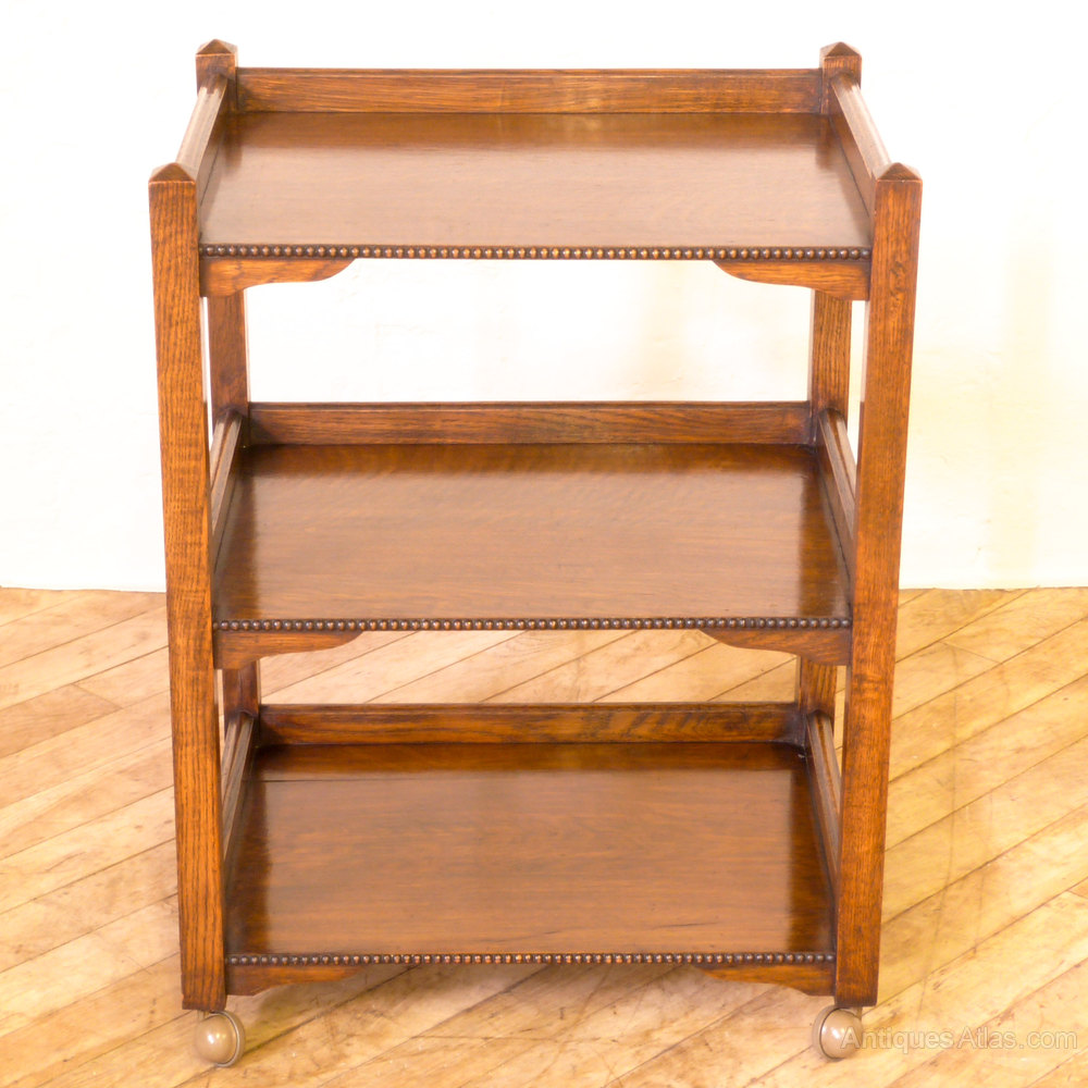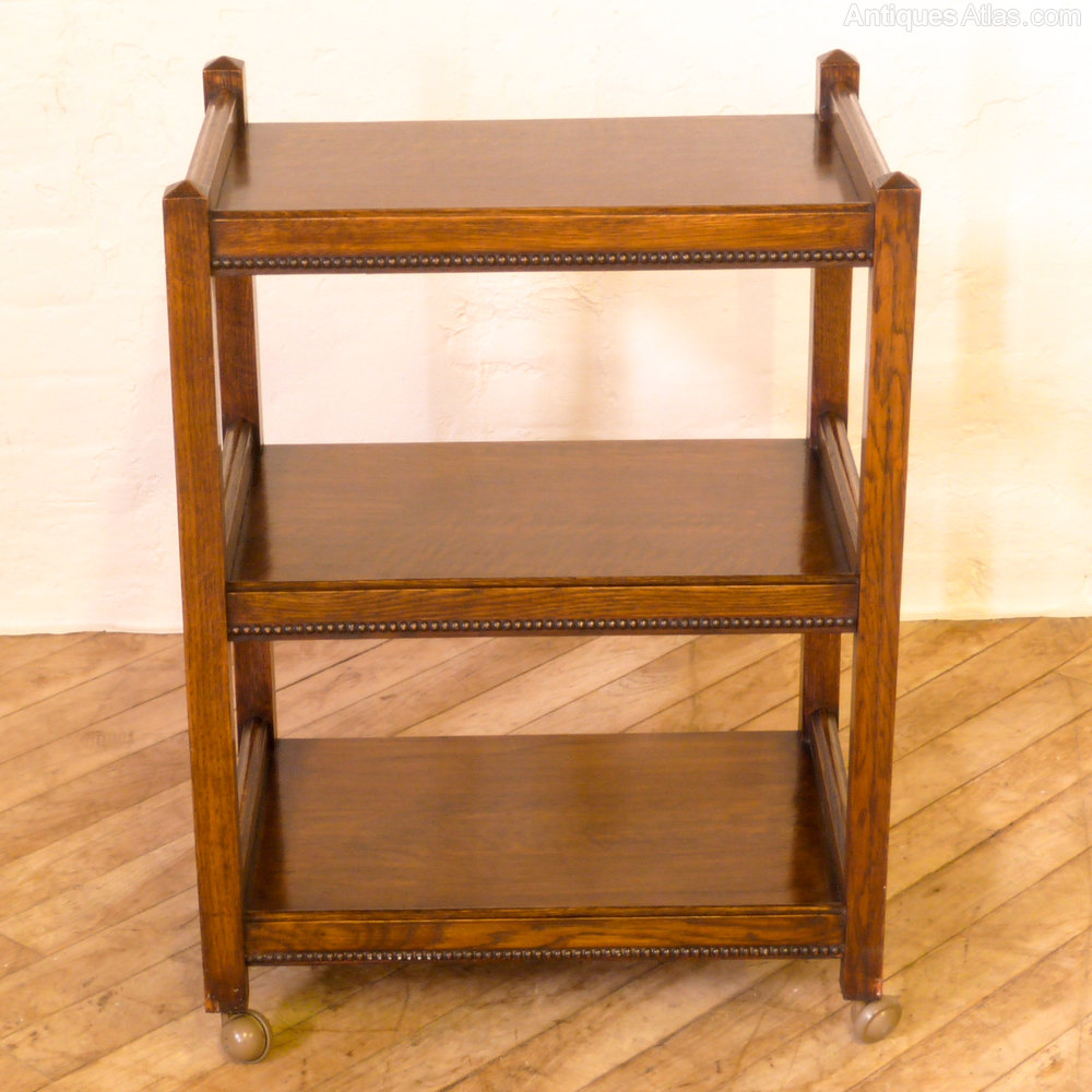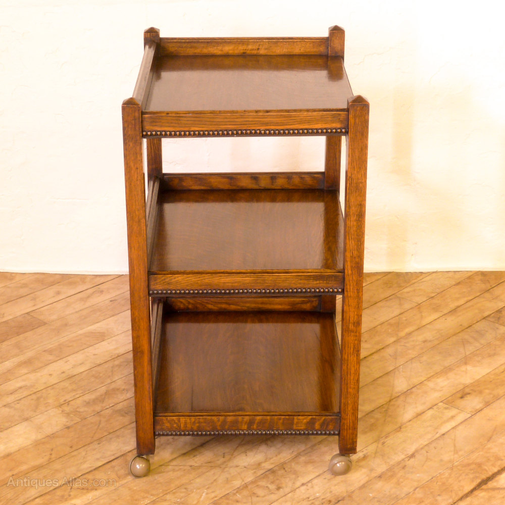 A solid oak square legged tea trolley with a beaded edge and an extra bottom tier which is unusual. Later casters fitted in the 1970's which makes it glide easier. In great condition.