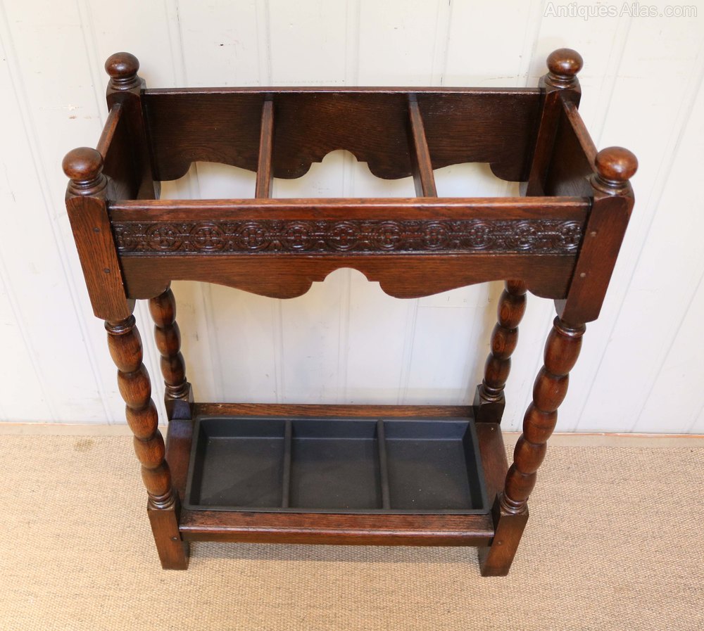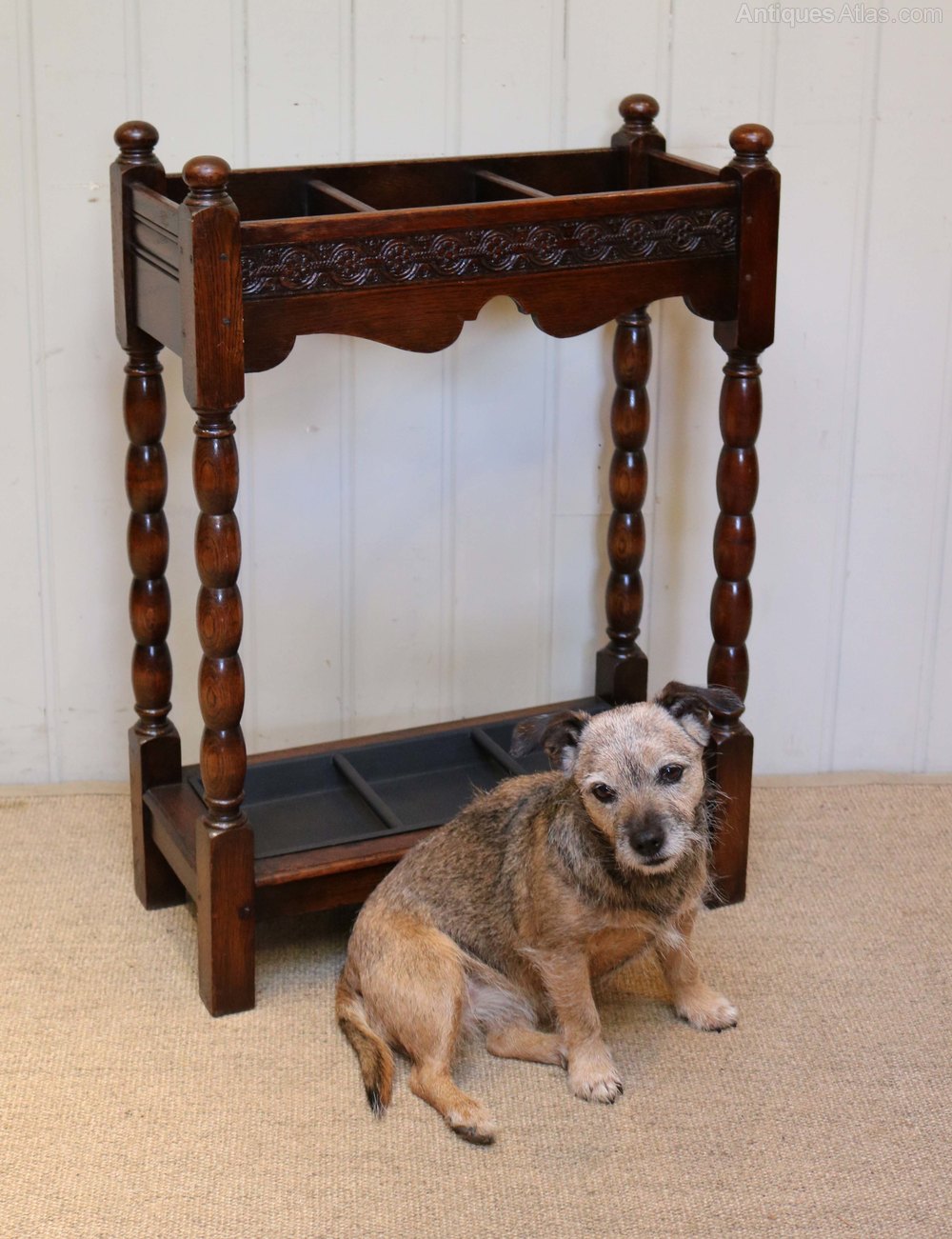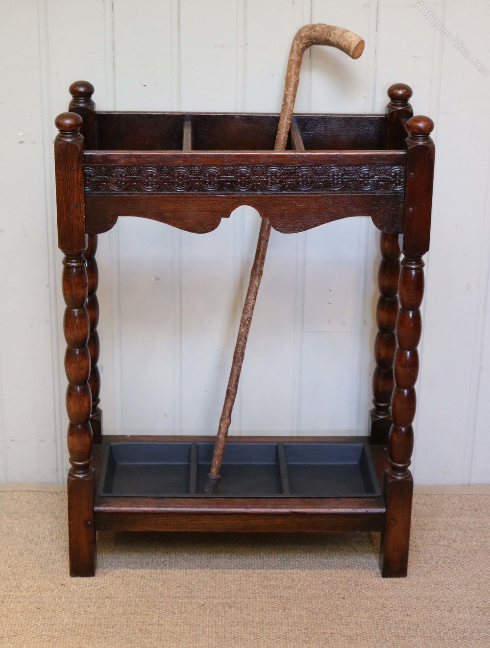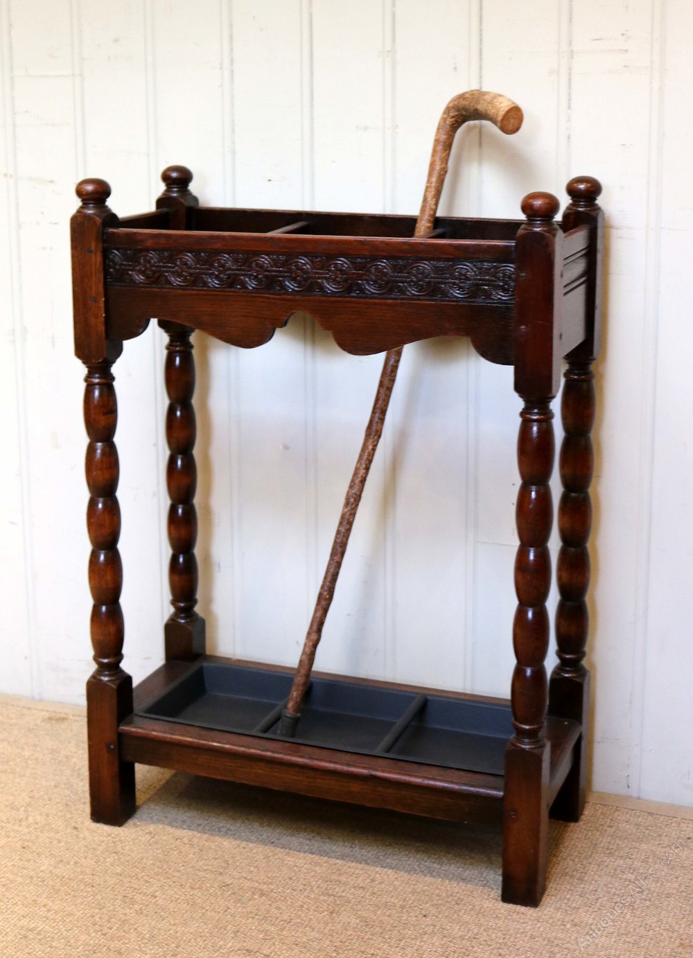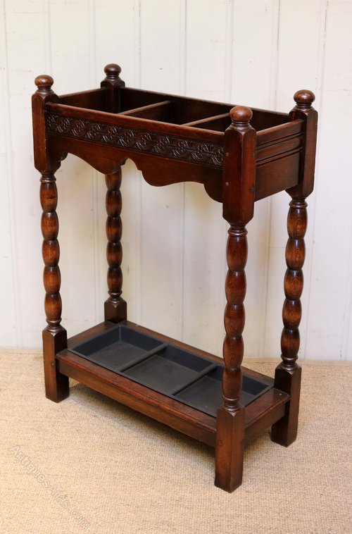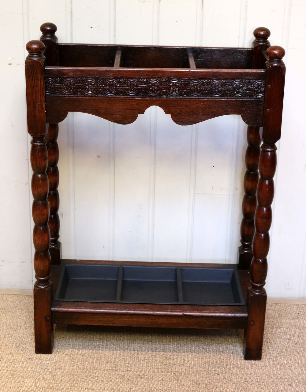 Oak three section umbrella/ stick stand having a carved front edge with turned wooden supports and the original drip tray