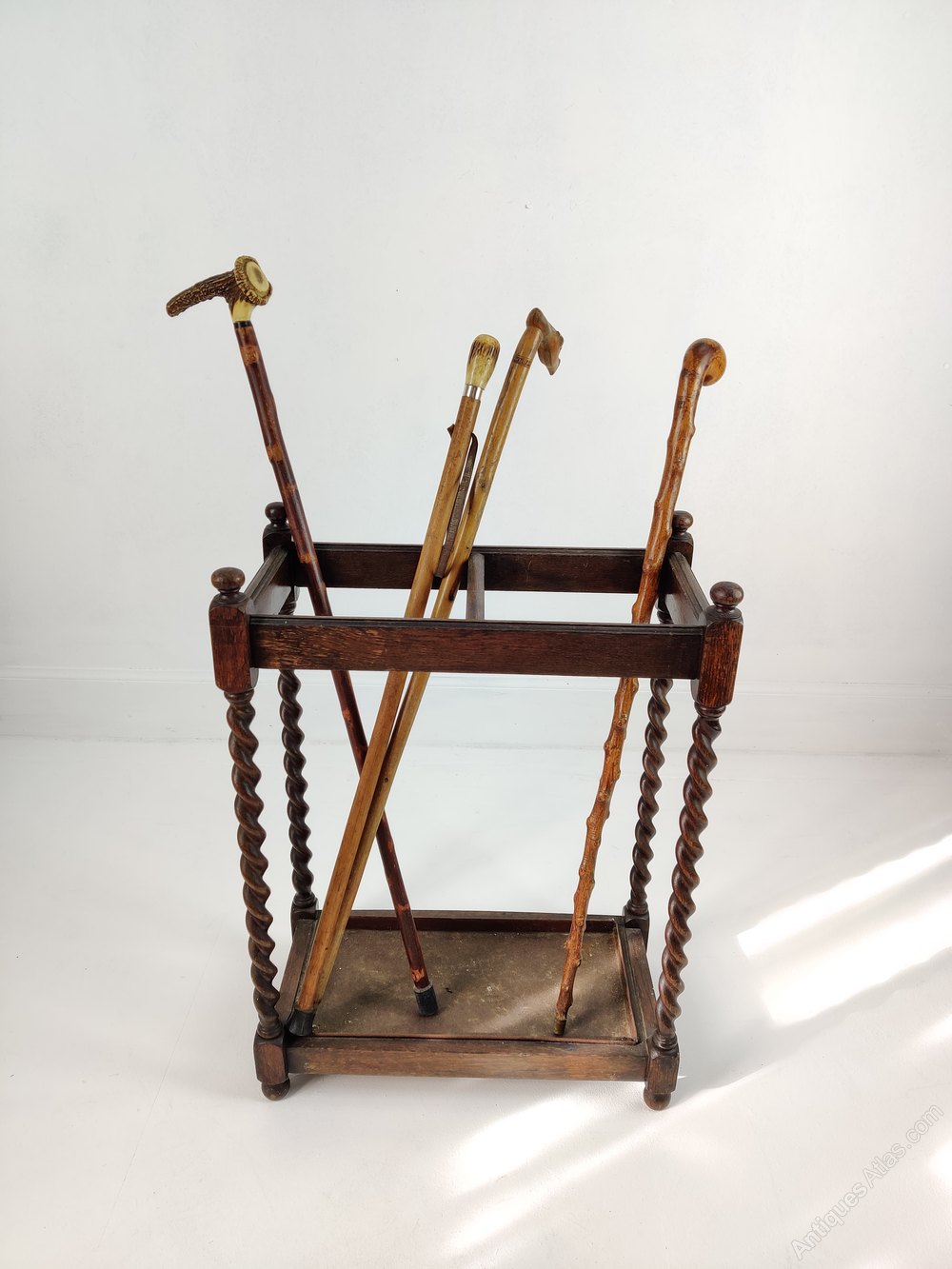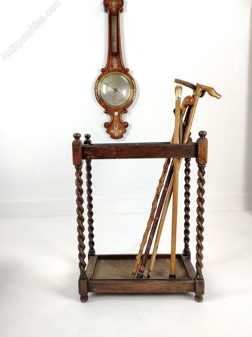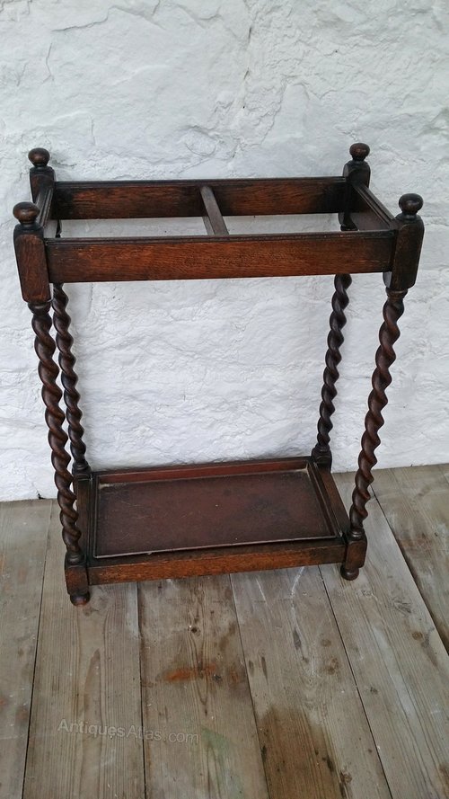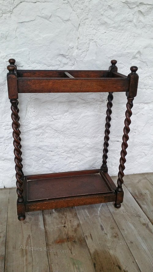 A stylish antique Edwardian stand dating from circa 1905. With sugar barley twist legs, finials to the front and back, in a lovely figured oak. Complete with copper drip well. A really attractive piece