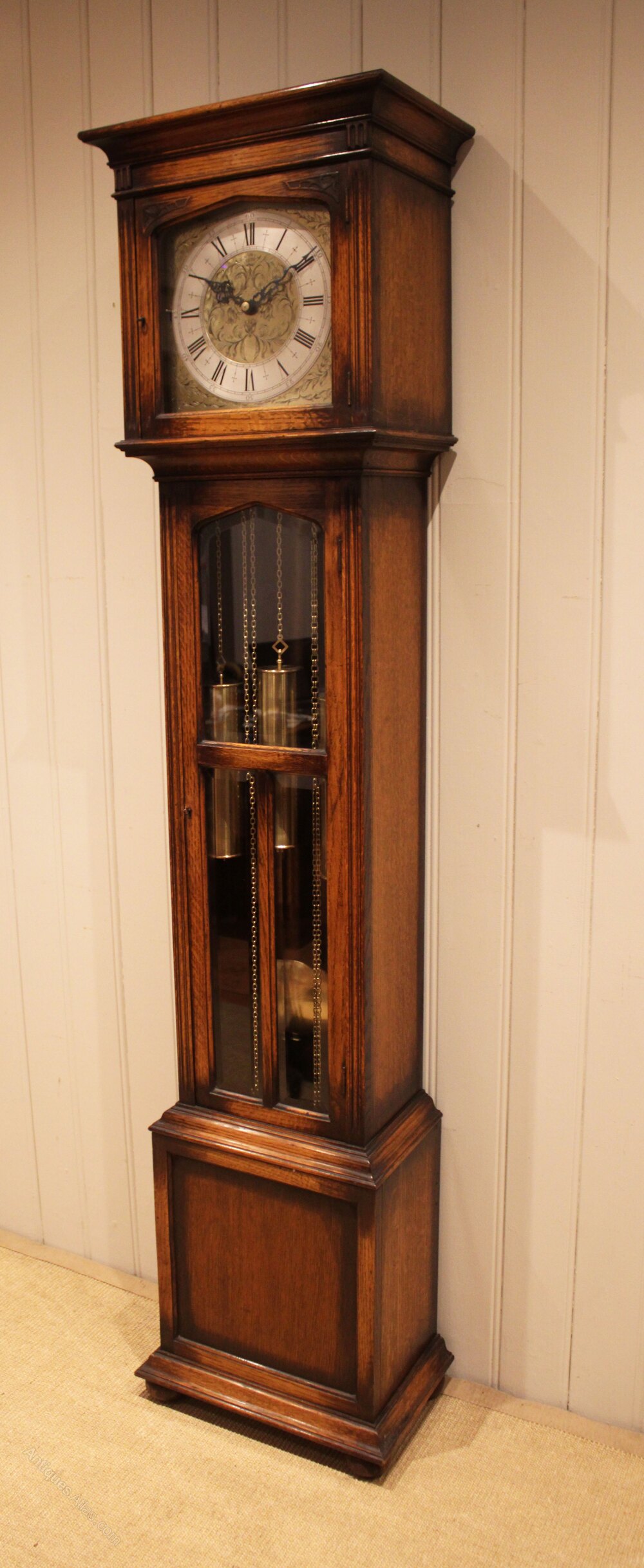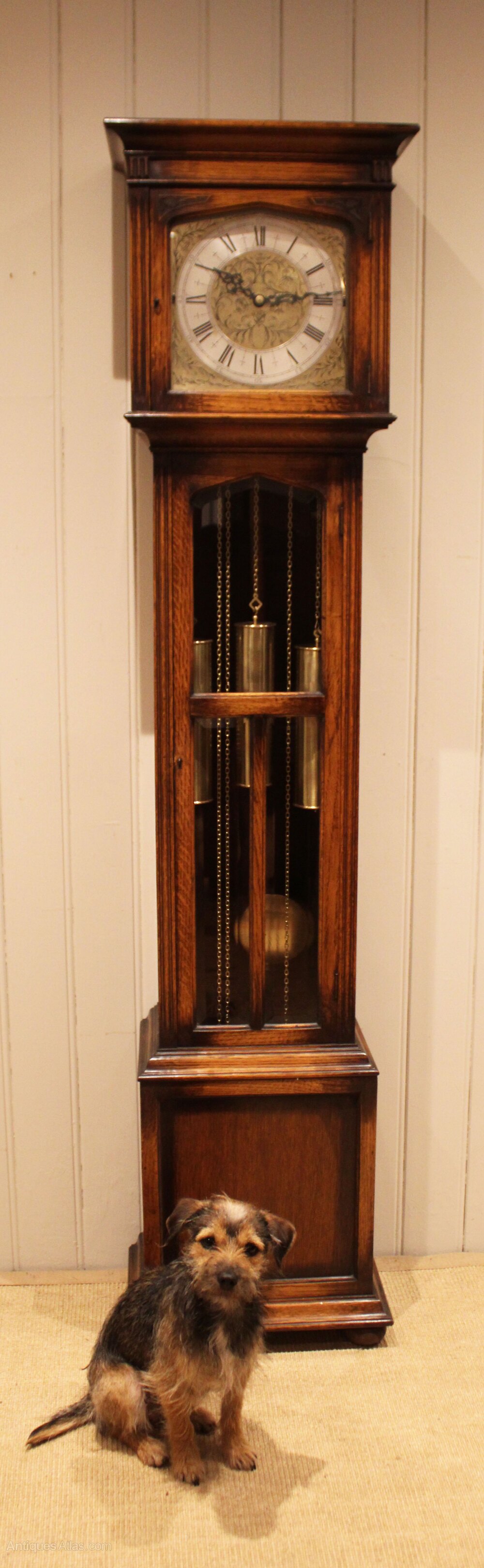 A late 17th Century style longcase clock , it has a square hood, a long glazed door and turned bun feet. The well engraved brass dial has a silvered chapter ring, It has a weight driven Westminster chime movement, that sounds the 1/4's and hours on chime bars. The chimes and or strike can be silenced. It has three brass weights and a brass bob pendulum, wound by pulling the chains on a weekly basis. Made by Peerless .Delivery & set up avaliable within a 100 mile radius of London